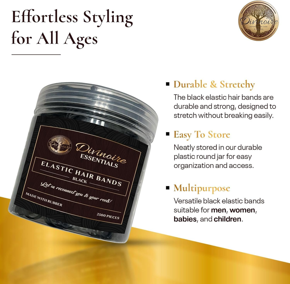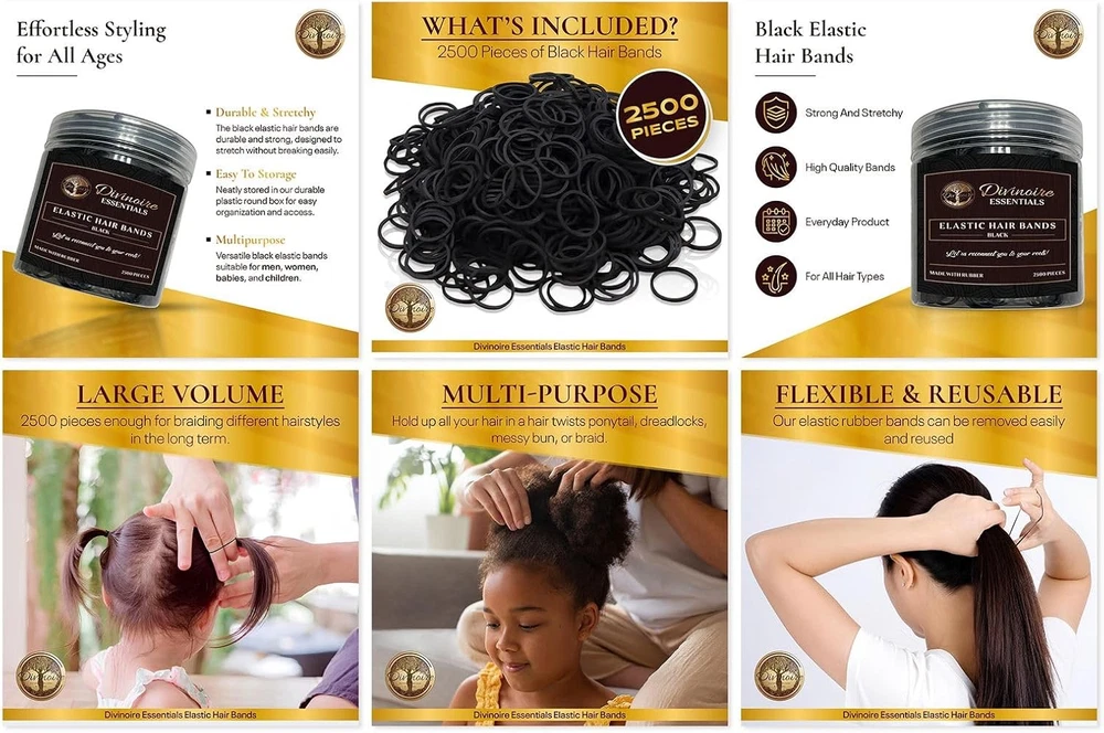 Large Pack of 2500: Comes with 2,500 high-quality black rubber bands, perfect for bulk needs in home, school, or office settings. Durable & Sturdy: These elastic bands are made to withstand repeated use, offering superior stretch and resilience for all your tasks. Multi-Purpose Use: Ideal for bundling documents, organizing supplies, hair styling, crafting projects, and more. Gentle on Hair: Safe and flexible enough for everyday hair styling without pulling or damaging hair. Convenient Storage: Neatly packaged in a compact, reusable container for easy access and organized storage. Large Pack of 2500: Comes with 2,500 high-quality black rubber bands, perfect for bulk needs in home, school, or office settings. Durable & Sturdy: These elastic bands are made to withstand repeated use, offering superior stretch and resilience for all your tasks. Multi-Purpose Use: Ideal for bundling documents, organizing supplies, hair styling, crafting projects, and more. Gentle on Hair: Safe and flexible enough for everyday hair styling without pulling or damaging hair. Convenient Storage: Neatly packaged in a compact, reusable container for easy access and organized storage.