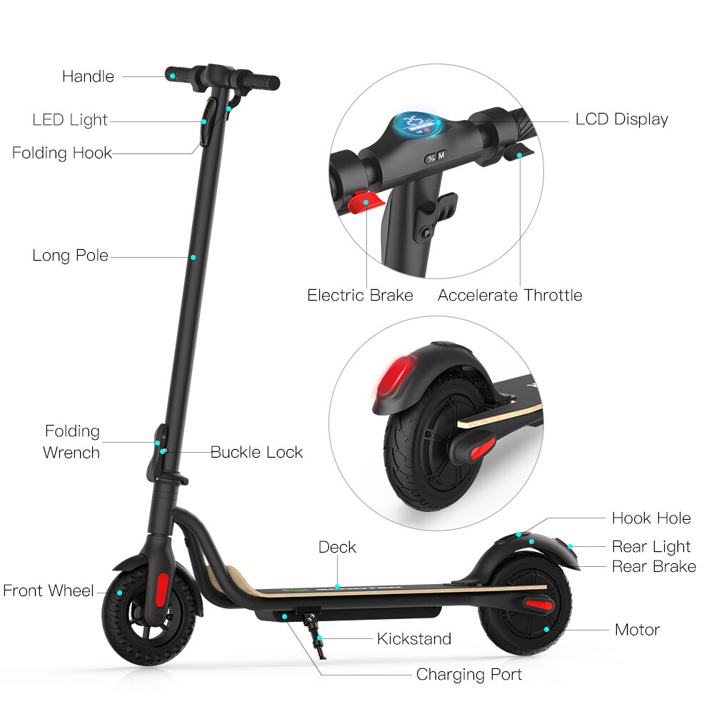 NOTE:The appearance of the product you receive may vary slightly from the image shown due to differing production batches! Main features: LONG RANGE BATTERY LIFE - Powerful 250W motor and 5.2 Ah/36V lithium battery pack that supports a speed of up to 15 Mph with a range up to 7 Miles. Updated large-capacity battery life, designed for commuters and longer distances. 8.0" HONEYCOMB & SOLID TIRES - Shock-absorbing rubber tires offer a smooth ride even over bumpy surfaces. PORTABLE FOLDING DESIGN - Electric scooter can be folded easily in 3 seconds with quick folding latch for easy carrying and storage. BATTERY INDICATOR AND LIGHTS - Battery indicator keeps to track battery life. Ultra bright LED headlight and taillight. Fast recharging about 5 hours. GEAR SHIFT SETTING - 1st gear for a 7 Mph comfortable ride or 3rd gear to get the 15 Mph fast experience. Extremely fun to ride and end boring commutes. Specification: Brand: Megawheels Model: S10 Dimension: Unfolding 105 x 43 x 118 cm; Folding: 105 x 43 x 48 cm Net Weight: 11.9kg Color: Black Frame Material: Aluminium Tires: 8.0" Honeycomb Front Tire & Solid Rear Tire Max Load: 100kg Max speed: 25KM/h Speed level: Gear 1--Max 10km/h ; Gear 2--Max 20km/h; Gear 3--Max 25km/h Mileage: 8-12km Grade Ability: 20 degree slope Working Temperature: -15°C-50°C Storage Temperature: -20°C-25°C Mode Type of Motor: Brushless hub motor Battery Type: High quality lithium battery Battery Capacitiy: 5.2 Ah Battery Voltage: 36V Charger Input Voltage: 100V-240V Charger Frequent: 50Hz/60Hz Charging time: 4 hours Package Contents: 1 * Folding Electric Scooter 1 * Battery Charger 1 * User's Manual Riding Skills: -Put your foot in the front of the scooter and the other foot on the floor before riding. -Make sure that the riding route is smooth. -Slide forward with the food standing on the floor before starting (like riding the scooter without power). -Immediately press the acceleration button and lean forward to avoid falling over backward due to inertia, so that the electric scooter will enter the working status. -Avoid pressing the handle with your body in the acceleration and deceleration process. Put one foot ahead and the other behind (like on the sliding plate/surfboard, put one foot ahead and the other behind by 70-90 for better comfort). -Turning – The turning principle of the electric scooter is the same with that of surfboard/sliding plate/skis. The handle shall be balanced with the body. Observe and make sure that turning is safe before turning. Tips: Before riding the scooter, please put one foot on the scooter deck and the other foot on floor and push the scooter forward by kicking the floor for some distance, in this way, the scooter will get some impulse to run forward. Note: Our products have been certified under UL2272 safety standards.