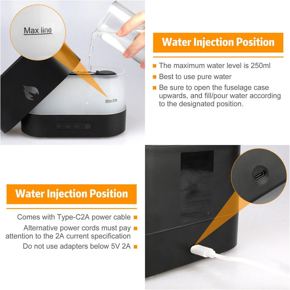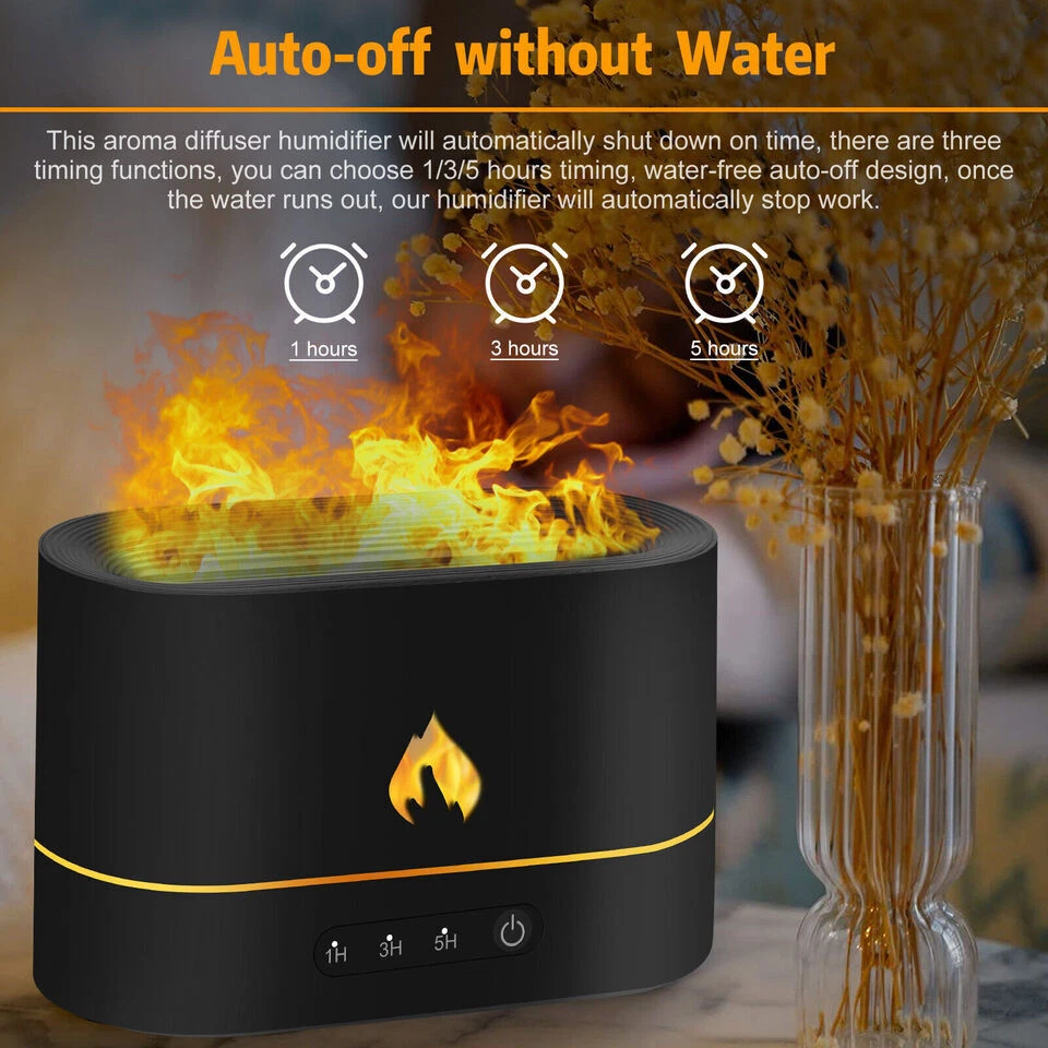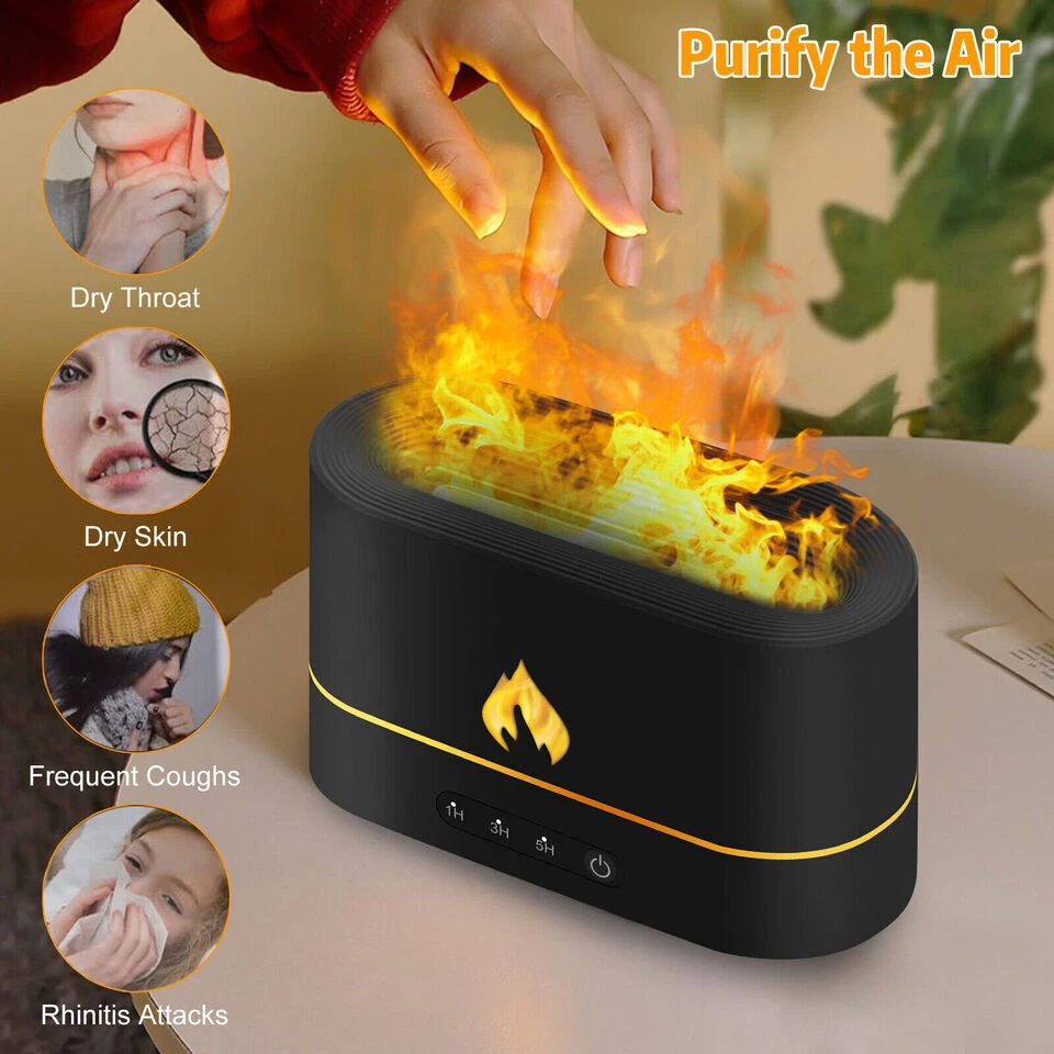 250ml Air Humidifier Essential Oil Aroma Diffuser 3D Flame Mist Home Decor USB Description Flame Effect: Smart LED lights combine with mist to create a flame effect, just like a fire burning in a fireplace. If used at night, the atmosphere of the room will be very romantic and healing, there are two color flames, yellow flame and blue flame. Auto-off without water: This aroma diffuser humidifier will automatically shut down on time, there are three timing functions, you can choose 1/3/5 hours timing, water-free auto-off design, once the water runs out, our humidifier will automatically stop Work. There is no potential safety risk to you and your family. In addition, the humidifier is made of BPA-free materials. Noise reduction: Unique noise reduction technology, noise can be controlled below 36dB, with adjustable brightness flame night light, create a perfect sleeping atmosphere, keep you away from dry skin. Purify the air: A humidifier can help you improve the air quality and humidify the air in your home, purify the air to remove pet or smoking odors, protect you and your family from dry skin, dry throat, dust allergies, etc. Wait. Water injection position: 250ml capacity, do not exceed the maximum water level line, otherwise it will affect the atomization effect or water leakage and cause damage to the host. Please add pure water to avoid damage to the atomizer function due to impurities in the water, so as to achieve the best performance Maintenance effect. Be sure to open the fuselage shell upwards, and then fill/pour out the water according to the designated position. Great Gift: A perfect holiday gift for friends, family and loved ones. Package includes 1 x Humidifier (Essential Oils And Water Not Included) 1 x USB Cable 1 x Instruction Manual Product Highlights Type: Air Humidifier Color: Black or White Material: ABS+PP+GEL+Electronic Components Dimensions: 170x80x108mm (6.69x3.15x4.25in) Shape: Columnar Rated Power: ≤4.5W Rated Voltage: DC5V/2A Working Current: ≤900mA Timing Setting: 1H, 3H, 5H Liner Material: Plastic Capacity: 250ML Number Of Fog Outlets: 1 Whether It Is Anti-Burning: Yes Power Supply: USB Noise: Below 36DB Applicable Area: Less Than 10 Square Meters Water Shortage And Power Failure Protection: Support Spray Volume: 15-20ml/h Light Color: Yellow Flame/Blue Flame Payment Shipping Returns Contact Us Paypal Payment only. We will ship in one working days. We accept 30 day no reason returns and free shipping. If you need a return, you can choose don't like it, then you will get a return label If you need any help, please contact us first!