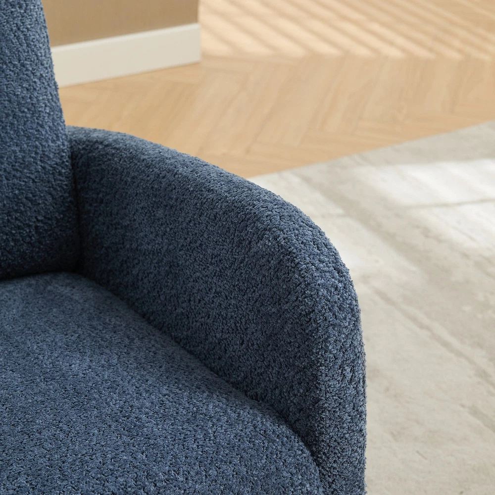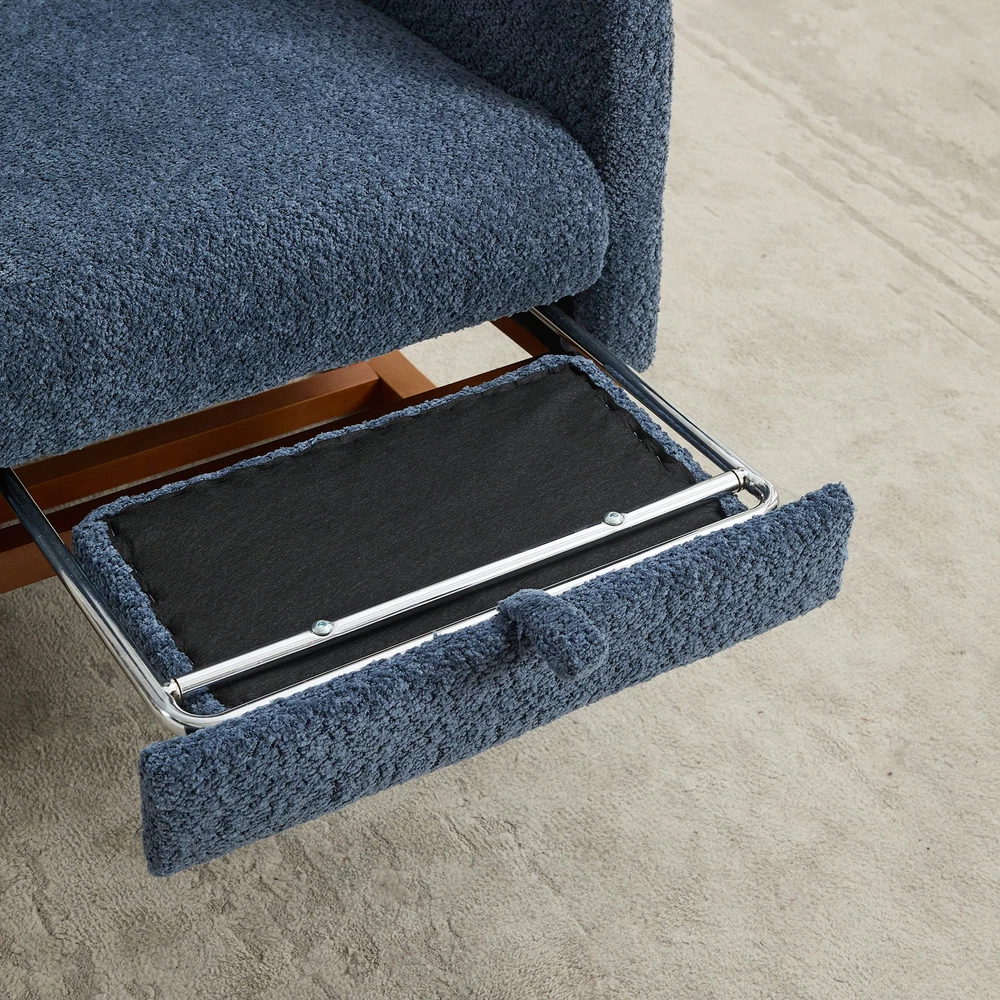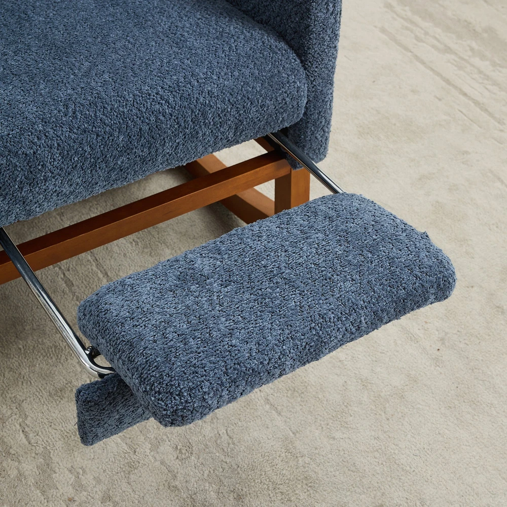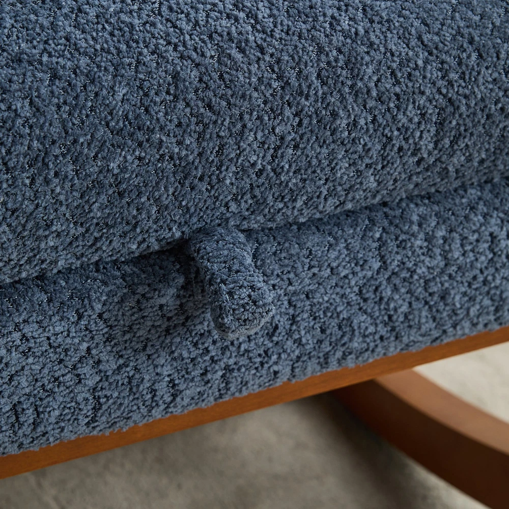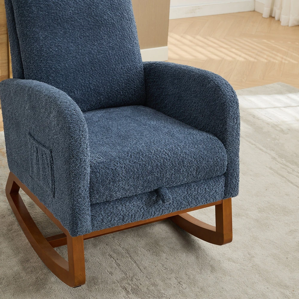 Specifications Place of Origin #originPlace# Main Color Navy Main Material Boucle Dangerous Goods #dangerFlag# Dimensions & Weights Assembled Length (in.) 25.40 Assembled Width (in.) 37.00 Assembled Height (in.) 41.70 Weight (lbs) 44.50 Product Features Fabulous Comfort:Covered with high-quality boucle for a soft and breathable surface, the rocking chair brings you a luxurious yet casual sitting. A refined curved wing back provides a comfortable sitting position for you to enjoy a leisurely time. Gentle Rocking:The rocking chair has excellent curved legs , making it rock gently and smoothly. Such a sweet design is the perfect centerpiece for the nursery and leisure, enjoying your time. Retractable Footrest:Our nursery rocking chair has a retractable footstool under the seat.This glider chair with an adjustable footrest is perfect for enhancing the aesthetics of your home while offering a comfortable spot to relax. Side Pockets:This rocking chair has side pockets for items like unfinished books and remote controls. Make it more practical for you to use. Sturdy and stable:The frame is made of sturdy plywood and rubber wood legs, which is super strong and durable. In addition, there is an extra fixed wooden cross bar between the two legs for better stability. Its max capacity can reach 250LBS. Easy to install:This chair only needs to be installed on the backrest and feet, and it only takes an adult to install it in 10 minutes, which is very time-saving. Description Product Description Product Name Rocking Chair Overall Dimensions 25.4'W x 37'D x 41.7'H Overall Product Weight 44.5lbs Seating Capacity 1 Upholstery Material boucle Seat Cushion Fill Material Foam Back Cushion Fill Material Fo