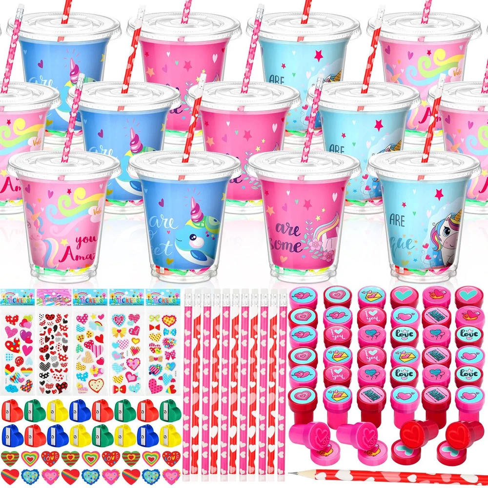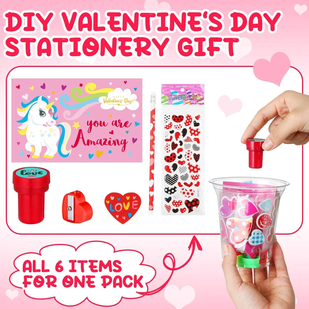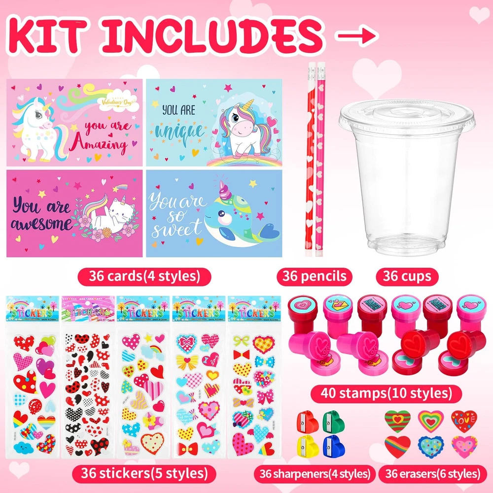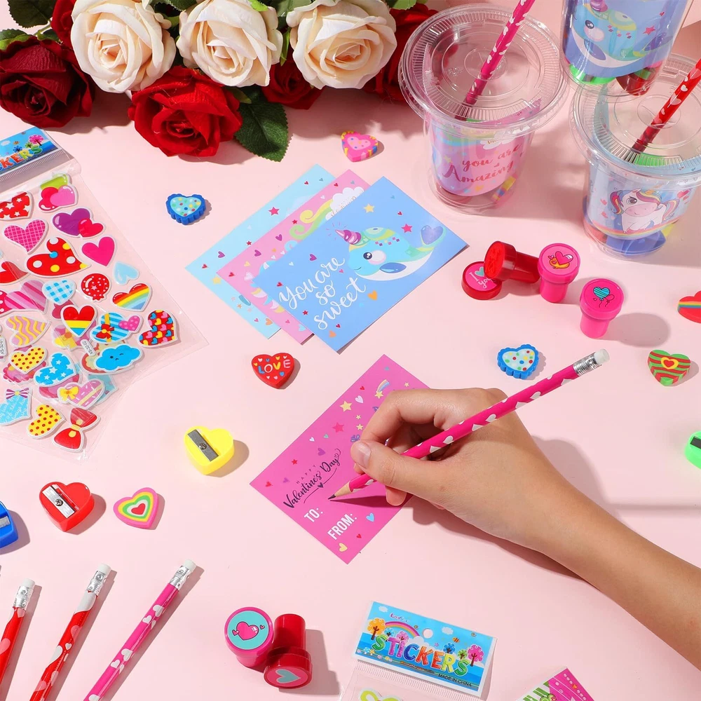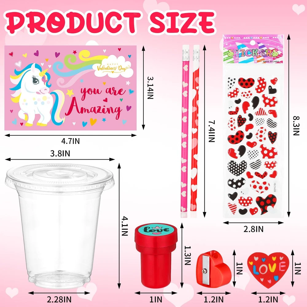 Features: The Valentines favors will bring fun and happiness on Valentine's Day. It is an ideal candy alternative addition to your Valentine's Day party supplies to spread the love. The Valentines Day stationery set is ideal for teens, Valentine's Day, class events, gift exchange, school classroom prizes, etc. Specifications: Main material: plastic, paper and wood Color: multicolor Size: as pictures shown Package includes: 36 x Cups 36 x Stickers 36 x Greeting cards 40 x Stampers 36 x Pencils 36 x Erasers 36 x Pencil sharpeners Notes: Words printed on our products are only for decorating, not as trademarks. Manual measurement, please allow slight errors on size. The color may exist a slight difference due to different screen displays. Valentine's Day Stationery Gift Set: the package includes 36 cups, 36 stickers, 36 greeting cards, 40 stamps, 36 pencils, 36 erasers, and 36 pencil sharpeners; There are 256 small Valentine's Day gifts, enough for the entire class to use Sweet Valentine's Day Design: all items in these Valentine's Day party gifts are carefully designed with sweet Valentine's Day elements Valentine's Day pencils, Valentine's Day cards, Valentine's Day stamps, and Valentine's Day stickers all have cute and warm heart shaped patterns and various Valentine's Day words; The atmosphere of Valentine's Day will be loved by people Valentine's Day Gift Exchange: these Valentines party favors are not only suitable for daily use, but also very suitable for Valentine's Day classroom gift exchange; They can help people learn to share and can be applied to making new friends; They are ideal items for classroom gatherings and communication Easy to Use: these Valentine's Day gifts are mainly made of quality plastic, paper, and wood, durable and suitable for daily use, very suitable for distributing or providing non candy Valentine's Day gifts; Valentine's Day cards come in various heart shaped colors, with blank spaces inside; People can fill in their own names and other blessings to express their love Ideal Gift: the Valentine's Day stationery set is ideal for teacher classrooms, classroom prizes, home schools, Valentine's Day stationery gifts, birthday party gifts, and party gifts, suitable for teens, Valentine's Day, classroom activities, gift exchange, and other occasions, which will bring fun and happiness to everyone