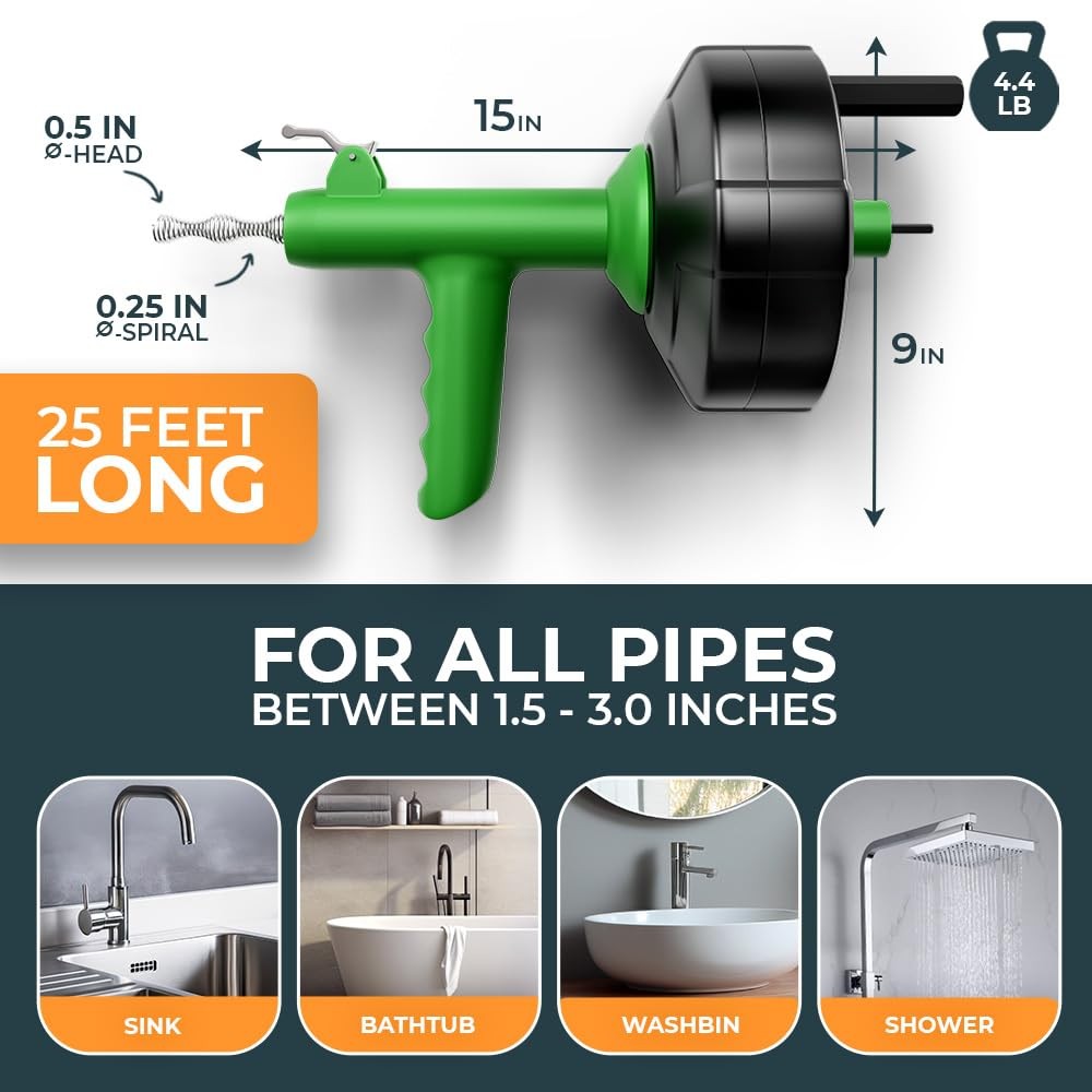 drain snake snake drain clog remover plumbing snake drain snake clog remover drain auger sink snake plumbers snake snake drain drain snake drill attachment shower drain snake unclog bathtub drain shower snake pipe snake snake for drain drain auger snake sink drain snake shower snake clog remover gutter snake snake for sink drain snake for shower drain pipe snake for drain unclog shower drain plumber snake roof snake clogged sink bathtub snake clog remover drain snake auger plumber's snake drain snakes bathroom sink snake tub snake drain augers sink unclogger tool roof snake tool drill snake culebra para destapar drenajes grande bathtub snake snake router mighty snake drain cleaner shower drain snake hair drain clog remover clogged pipe snake plumbing snake drain snake kitchen kitchen sink clog remover sink snake drain tool bathroom snake clog remover clogged shower drain hand auger snake drain snake drill snake shower kitchen sink snake small drain snake pipe cleaning snake hand auger plumbing plumbing snakes for unclogging drain pipes plumbers snake for pipes sink snakes drainsnakes snake plumber tool snake drain clog bathroom snake drain snake for home snake for drains drain pipe snake plummers snake snake plumbing tool clog remover snake snake clog remover snake for tub drain long plumbing snake pipe auger sink clog snake sewage drain snake kitchen clog snake snake WITH AUTOMATIC FEEDING - Most sink snakes need to be operated manually - ours does not. By rotating the drum, the spiral automatically loops around all pipe bends - lightning fast & 100% foolproof! WITH VIDEO INSTRUCTIONS - No need to be a plumber - our snake drain clog remover can be operated by anyone. Simple to use & explained in detail in our video tutorial next to the product images! CLEAN PIPES UNDER 8 MINS - With our over 25 feet long professional plumbing snake, you can remove even the deepest blockages in under 8 minutes - Save the expensive plumber & try it now! ECO-FRIENDLY UNBLOCKER - No more dangerous & environmentally harmful chemicals! Our high quality drain snake with drill attachment is the ideal eco-friendly alternative to unclog any drain! RECOMMENDED BY EXPERTS - We have already helped over 45.000 people to unblock their pipes. If you are not fully satisfied with our plumbers snake, we will be there to find the right solution!