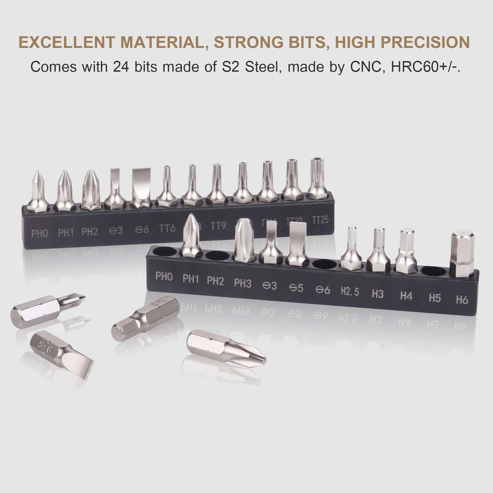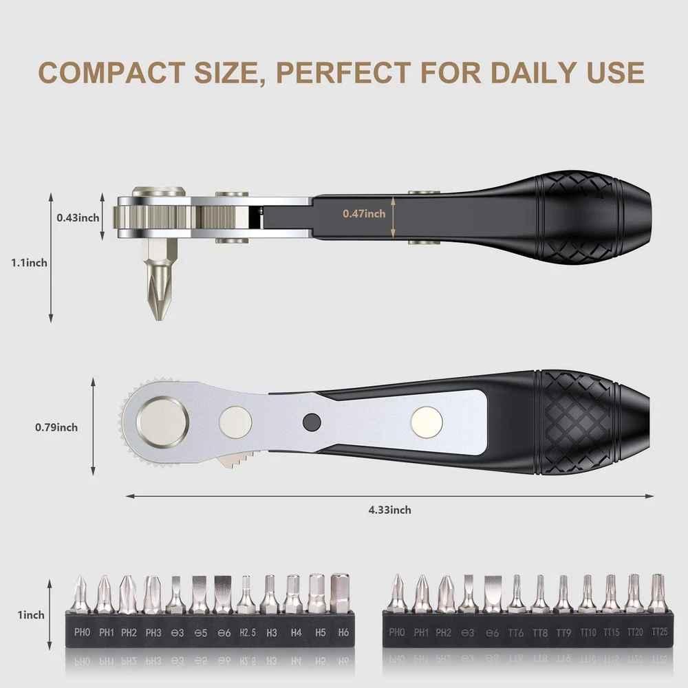 ✓【Perfect for Confined Space Operation 】The mini ratchet wrench screwdriver is small and light enough for operation in confined places where the traditional screwdrivers might be too long to fit. Especially in awkward places like U shape corner, lateral surface, and other tight spaces. The comfortable non-slip grip provides excellent handling. ✓【High-Quality Ratchet Wrench】The ratchet wrench (4.3" long) is powered with a 36-teeth reversible ratchet system to ensure smooth ratcheting in both directions. High-quality teeth provide high torque resistance and precise adjustment compared to 12-teeth or 16-teeth ratchet. Simply flip the spin button to change direction for tightening or loosening screws. Holders on the head and bottom of the wrench are strongly magnetized for holding the bits. No worries for bit drops. ✓【High-Quality S2 Steel Bits】The screwdriver bits are made of high-quality S2 steel, hardness reaching HRC60+/-. CNC machined and magnetized bits ensure precise fit, reducing wobbling. ✓ 【Daily-Range Bit Set】2x Phillips(PH0, PH1, PH2), 1x Phillips(PH3), 2x Slotted(SL3, SL6), 1x Slotted(SL5), 1x Hexagon(H2.5, H3, H4, H5, H6), 1x Temper-Proof Torx(TT6, TT8, TT9, TT10, TT15, TT20, TT25). Compatible with 1/4" socket, drill, etc. ✓ 【Wide Application】Suitable for domestic appliances, furniture, automotive, industrial use, computers, electronics repair, hobbies, toys and crafts, DIY home improvement project, etc. Bits also fit for any 1/4" hex shank screwdriver or extension bit holder for power tools. Product Description Package Content Package Content 1 x 36-Tooth Magnetic Ratchet Wrench (4.3" long and 0.4" thick) 24 x 1/4'' Drive Bits GreaTalent 25in1 S2 Steel Mini Ratchet Wrench Old Specifications Head Type: Phillips, Slotted, Torx, Hexagon Shank: 1/4 inch Hex Shank Bit Length: 1inch / 25mm Hardness: HRC60+/- Material: S2 High Hardness Steel Bit Set Phillips 2x PH0, 2x PH1, 2x PH2, PH3 Slotted 2x SL3, SL5, 2x SL6 Hexagon H2.5, H3, H4, H5, H6 Temper-Proof Torx TT6, TT8, TT9, TT10, TT15, TT20, Torx TT25