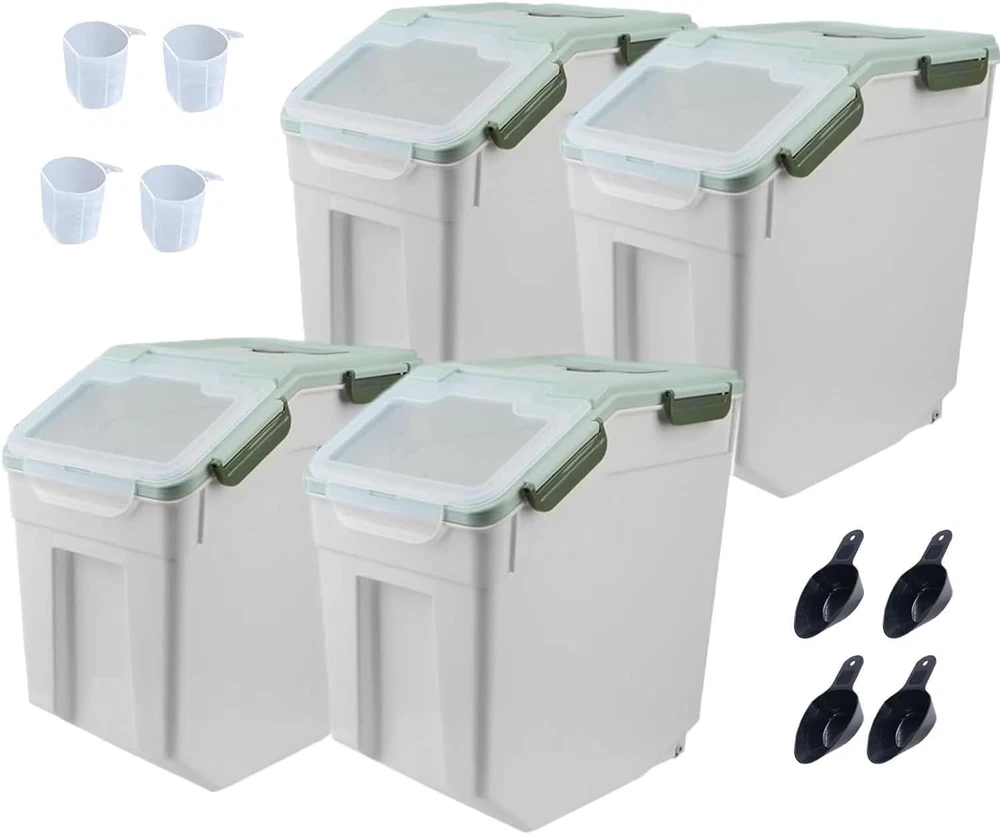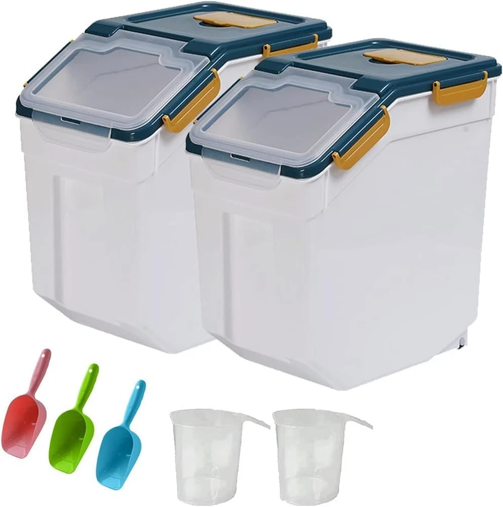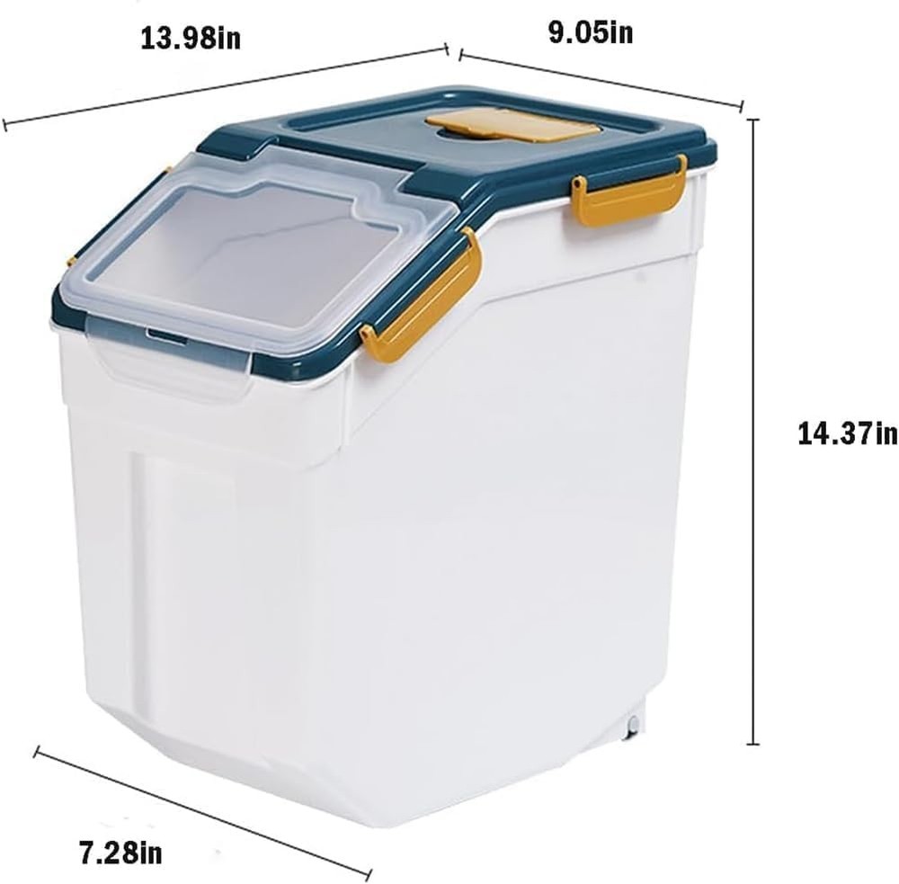 About this item 【Reliable Quality 】Flour rice storage container is composed of quality PP and PET material, odorless and impervious to water. The transparent clamshell design makes it easy to observe the amount of food left in the storage containers. 【Airtight Container 】The lid of the airtight food container has 6 buckles; the seams use silicone seals. The good sealing design is leak-proof, which keeps the food fresh and dry for a long time. 【Perfect Size 】12.6x9.05x14.17inch, Our rice storage bin is big enough, 400oz / 15L of large capacity, rice container with wheel can hold up to 25 pounds of flour and meet the daily needs of family. Tip: Capacity will vary depending on the size of what you’re putting in,The capacity of the product is for reference only. 【Unique Design 】The storage box uses a large clean inclined opening to facilitate finding and taking out food, also design with two castors in the bottom which is easy to move, you place it on the table or cabinet and keep your food storage area tidy and organized. 【Widely Application 】This storage container is a great way to store any type of food and keep it safe and dry for as long as you need it. This storage container is ideal for cats and small dogs. It is great for storing pet food as well as any type of food includingrice, flour, corn, soybeans, grain, dry goods, pet food and more. Brand: Color: Blue/30lbs,4counts Material: Plastic Material Feature: Durable, Airtight, Leak-proof Capacity: 25 Pounds