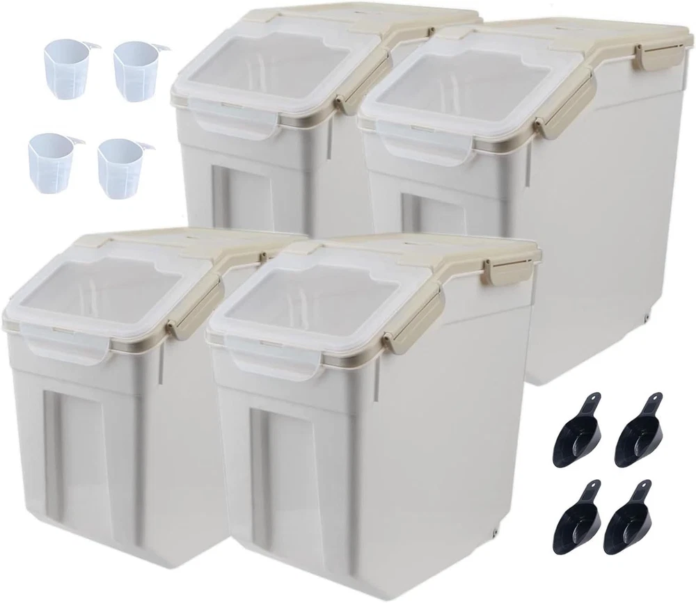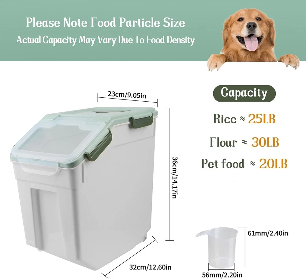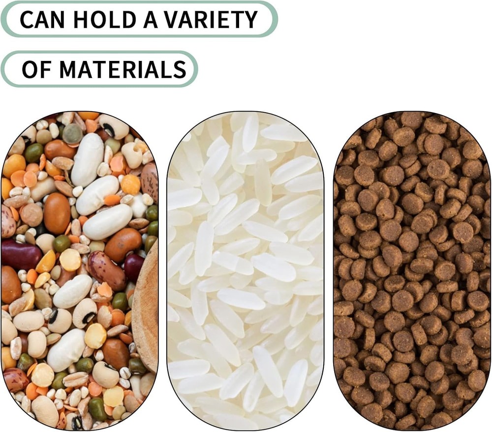 About this item LARGE SIZE: 13.77*7.87*13.77inch, our rice storage bin is big enough, 400oz / 15L of large capacity, rice container with wheel can hold up to 25 pounds of flour and meet the daily needs of family. Tip: Capacity will vary depending on the size of what you’re putting in,The capacity of the product is for reference only. 【Airtight Container 】The lid of the airtight food container has 6 buckles; the seams use silicone seals. The good sealing design is leak-proof, which keeps the food fresh and dry for a long time. 【Perfect Size 】12.6x9.05x14.17inch, Our rice storage bin is big enough, 400oz / 15L of large capacity, rice container with wheel can hold up to 25 pounds of flour and meet the daily needs of family. Tip: Capacity will vary depending on the size of what you’re putting in,The capacity of the product is for reference only. 【Unique Design 】The storage box uses a large clean inclined opening to facilitate finding and taking out food, also design with two castors in the bottom which is easy to move, you place it on the table or cabinet and keep your food storage area tidy and organized. 【Widely Application 】This storage container is a great way to store any type of food and keep it safe and dry for as long as you need it. This storage container is ideal for cats and small dogs. It is great for storing pet food as well as any type of food includingrice, flour, corn, soybeans, grain, dry goods, pet food and more. Brand: Color: Green 25LB,4Pcs Material: Polyethylene Terephthalate (PET), Polypropylene Product Dimensions: 16"L x 15"W x 10"H Is Dishwasher Safe: Yes