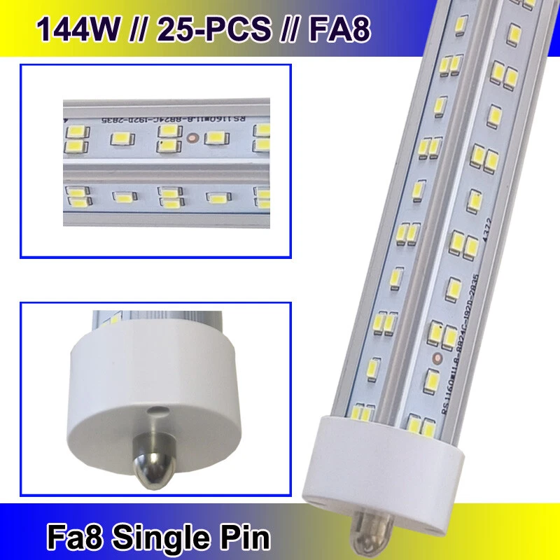 FAST DELIVERY - Ship from New Jersey or Los Angeles Warehouse via FedEx , 3-7 Days Delivered Your Door . SCIENTIFIC DESIGN - 8Ft LED Shop Lights Fixture is Made of 6500K Cold White SMD2835 LED Chip ,Plastic Clear Cover , Aluminum Bracket Housing ,and AC85-277V Constant Current Driver . It can work in -68F to 120F Temperature Conditions EASY INSTALLATION - The Integrated Tube Fixture Can be Install on Wall or Ceiling ,Easily Replace Traditional Fluorescent Tube Bulb . Plug and Play , Free Accessories (Power Cords, Connector , Extension Cords , Clip and Screw ) Come with Tube Lights Together WIDE APPLICATION - Linkable 8Ft Bulbs Widely Used in Garage Ceiling , Barbershop , Schools, Hospitals Basement , Factory Warehouses , Supermarkets Cooler Door , Offices, Shops,Hotels, etc 25PC LED Shop Light Single Pin FA8 8FT LED Tube Light Warehouse Garage LED 【No RF & FM Interference】LED Driver have passed Electromagnetic Magnetic Compatibility EMC tests,No cause EMI ,No longer subject to any RF & FM jamming. Never interfering with the signal of your garage roller shutter door,No make noise when you listen radio 【Easy to Install】Just simply bypass the ballast and connection AC85-277V AC power . Not compatible with single-ended powered sockets 【Wide Application】 - 8Ft 144W V Shaped FA8 HO LED Bulb fitted to replace traditional F96T12 T8 T10 T12 fluorescent bulbs. Widely used in Garage,supermarkets, offices , convenience stores , gas stations , warehouse,parking lot,shops, hotels,Refrigerator,coolers or freezers illumination,etc 【High Output】8Ft 144W 18000LM FA8 【Rotate Cap & Swivel End】 Easy Adjust rotated Lighting Direction within 180 degree after Installation