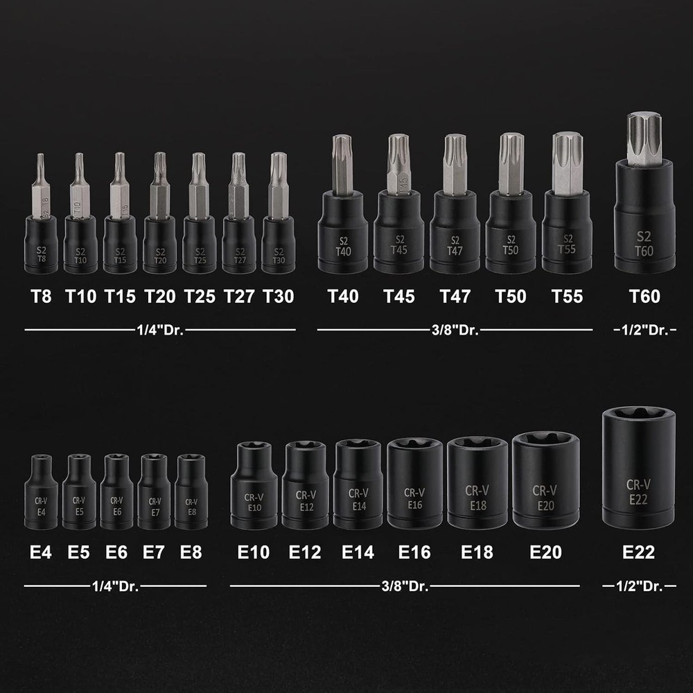 EMENTOL 25PCS Torx Bit Socket Set-Torx and External Set, 1/4", Description Features: Constructed with high-strength Chrome-Vanadium Steel and S2 Alloy Steel, with a protective black phosphate coating. Set Includes: 1/4"Dr:E4,E5,E6,E7,E8; 3/8"Dr:E10,E12,E14,E16,E18,E20; 1/2"Dr:E22; 1/4"Dr:T8,T10,T15,T20,T25,T27,T30; 3/8"Dr:T40,T45,T47,T50,T55; 1/2"Dr:T60 It is an essential tool for working on cars, motorcycles, bicycles, lawn equipment, appliances, machinery, etc. Laser-etched with high contrast and specific size marking for identification. It helps you select the size easier. It comes with a sturdy and convenient storage case. Keep each piece in the proper position. Meets or exceeds ANSI performance standards. Product Details: Brand: EMENTOL Material: Chrome Vanadium Steel, S2 Steel Drive System: Torx Finish Type: Black Phosphate Coating Number of Pieces: 25 Manufacturer: EMENTOL Part Number: ET511 Item Weight: 2.68 pounds Product Dimensions: 10.55 x 7.09 x 2.36 inches Country of Origin: China Item model number: ET511 Size: 25PCS Finish: Black Phosphate Coating Compatible Fastener Range: 0.25 inches Batteries Included?: No Batteries Required?: No Brand: EMENTOL Material: Chrome Vanadium Steel, S2 Steel Drive System: Torx Finish Type: Black Phosphate Coating Number of Pieces: 25 Handling We will ship all orders within 3 business day of payment. Delivery We take pride in offering fast and reliable delivery for your orders! We are committed to getting your products to you as quickly as possible. Generally, we would like to inform you that all orders will be delivered to you within 1-3 business days after processing.However, in some cases, delivery times may vary depending on the buyer's location. Especially in remote or rural areas, the expected delivery time may be extended. In such situations, we do our best to ensure that your order reaches you as quickly as possible.If there are any delays, we will be happy to contact you to explain the situation. Our goal is to enhance your satisfaction with our fast delivery times. We work diligently to ensure that your order arrives safely.Trust us and enjoy our speedy delivery! Return Policy All items qualify for returns within 30 days of receipt. Buyer is responsible for return shipping on any item that is not damaged. Feedback We take our reputation seriously, we buy and sell online, so we understand the value of trust. If you are unsatisfied with your order, please contact us and we will work with you to resolve it to your satisfaction.