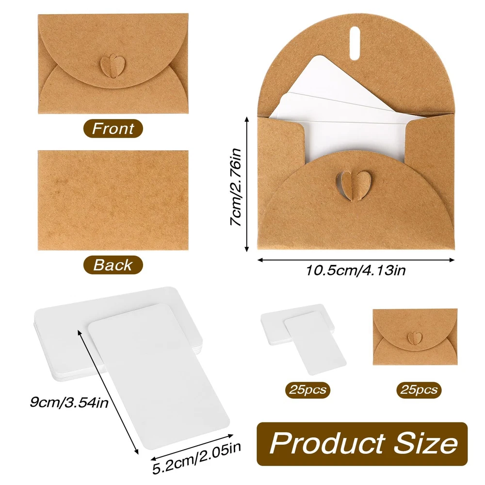 Product Name: gift cards envelopes Style: 25pcs envelope + 25pcs card Material: kraft paper Single product size: envelope folded 10.5*7cm, card 9*5.2cm Packaging: bagged Packing list: 25pcs gift card holders + 25pcs blank cards Mini Blank Cards with Envelopes: Comes with 25 kraft paper gift card envelopes and 25 small note cards. Cute Decorative Envelopes: The gift card holder is designed with a cute heart-shaped closure, allowing the gift card packaging to stay secure while being elegant and beautiful. Mini Size: The folded card envelope measures approximately 10.5*7cm/4.1 x 2.8 inches, and the blank small gift card measures approximately 9*5.2cm/3.5 x 2 inches. Easy to Assemble and DIY: The greeting card mailing envelopes can be assembled without glue, and you can write and doodle freely on the blank tiny envelopes and note cards. Versatile Application: Mini envelopes with blank card are ideal for Christmas cards, wedding cards, party invitations, business cards, thank you cards, greeting cards, birthday cards and more.