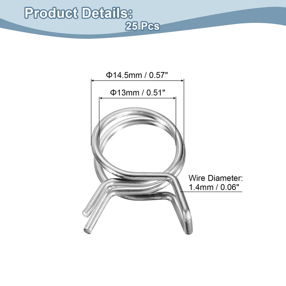 Document Description: Material: Made of stainless steel with a polished surface, these spring hose clamps are corrosion and rust-resistant for long-term use.Design: The spring hose clamps are designed with double-wound wire, which can spread the clamping force around the hose, and is more cost-effective than single-wire clamps.Easy to Use: These spring hose clamps are very easy to use, just use pliers to open the clamp and easily place it on the pipe.Wide Application: Spring hose clamps are widely used in automotive, agricultural, factory, and construction industries. Mainly used for fastening interfaces, they can firmly lock power equipment fuel lines, air hoses, water pipes, silicone hoses, vacuum hoses, automobile fuel lines, motorcycle air pipes, etc.Specification:Material: Stainless SteelFinish: PolishedInner Diameter: 13mm / 0.51inchMaximum Open Inner Diameter: 14.5mm/0.57inchWire Diameter: 1.4mm / 0.06inchPackage Content: 25pcs x Spring Hose Clamp Double Wire Spring Hose Clamp, 20pcs 304 Stainless Steel 6mm Spring Clips USD 7.78 Double Wire Spring Hose Clamp, 10pcs 304 Stainless Steel 5.5mm Spring Clips USD 6.71 Double Wire Spring Hose Clamp, 20pcs 304 Stainless Steel 3.5mm Spring Clips USD 7.49 Spring Hose Clamp, 50pcs 65Mn Steel 18mm Low Pressure Air Clip, Zinc Plated USD 21.04 Spring Hose Clamp, 10pcs 65Mn Steel 9mm Low Pressure Air Clip, Nickel Plated USD 7.03 Fuel Line Hose Clips, 5pcs 55mm 65Mn Steel Tubing Spring Clamps USD 8.67 25Pcs 13mm/0.51inch Double Wire Spring Hose Clamp Description: Material: Made of stainless steel with a polished surface, these spring hose clamps are corrosion and rust-resistant for long-term use. Design: The spring hose clamps are designed with double-wound wire, which can spread the clamping force around the hose, and is more cost-effective than single-wire clamps. Easy to Use: These spring hose clamps are very easy to use, just use pliers to open the clamp and easily place it on the pipe. Wide Application: Spring hose clamps are widely used in automotive, agricultural, factory, and construction industries. Mainly used for fastening interfaces, they can firmly lock power equipment fuel lines, air hoses, water pipes, silicone hoses, vacuum hoses, automobile fuel lines, motorcycle air pipes, etc. Specification: Material: Stainless Steel Finish: Polished Inner Diameter: 13mm / 0.51inch Maximum Open Inner Diameter: 14.5mm/0.57inch Wire Diameter: 1.4mm / 0.06inch Package Content: 25pcs x Spring Hose Clamp Hot Item Steel Band Clamp 23mm Hose Tube Spring Clips Clamp Black Manganese Steel 20Pcs USD 18.11 Fuel Line Hose Clips, 100pcs 8mm 65Mn Steel Tubing Spring Clamps USD 11.26 Double Wire Spring Hose Clamp, 20pcs 304 Stainless Steel 5mm Spring Clips USD 7.49 Fuel Line Hose Clips, 20pcs 13mm 65Mn Steel Tubing Spring Clamps USD 7.22 Double Wire Spring Hose Clamp, 50pcs 304 Stainless Steel 10mm Spring Clips USD 11.2 Payment We accept eBay payment. Please do not email us to ask for other payment option. We appreciate prompt payment and look forward to your business in the future. Unpaid item will be filed without receiving payment in 7 days from listing ended. Shipping Usually we ship your order out within 24 hours in business day. For shipping and handling charges (S&H) for specific item, please refer to the item listing page for more details. Please make sure your shipping address is correct. We are not responsible for any loss in transit if a wrong address is provided. Return Policy Returns for exchange are permitted and must be initiated by the buyer within 30 days upon receipt. If you would like to return your product(s) for repair / replacement / refund, please kindly contact our customer service representatives via email for an authorized RMA number. Your returned product(s) will not be processed without a completed RMA. About Us We are continually expanding our product selection to better serve your need. We look forward to providing the best sevice to you - our dear customers, so take a look around our store and find the product that you want. You can put your trust in us! If you need any help or have any suggestions, please don't hesititate to contact us anytime , we will reply you within 24 hours and try the best to help you. Description Policy 25Pcs 13mm/0.51inch Double Wire Spring Hose Clamp Description: Material: Made of stainless steel with a polished surface, these spring hose clamps are corrosion and rust-resistant for long-term use. Design: The spring hose clamps are designed with double-wound wire, which can spread the clamping force around the hose, and is more cost-effective than single-wire clamps. Easy to Use: These spring hose clamps are very easy to use, just use pliers to open the clamp and easily place it on the pipe. Wide Application: Spring hose clamps are widely used in automotive, agricultural, factory, and construction industries. Mainly used for fastening interfaces, they can firmly lock power equipment fuel lines, air hoses, water pipes, silicone hoses, vacuum hoses, automobile fuel lines, motorcycle air pipes, etc. Specification: Material: Stainless Steel Finish: Polished Inner Diameter: 13mm / 0.51inch Maximum Open Inner Diameter: 14.5mm/0.57inch Wire Diameter: 1.4mm / 0.06inch Package Content: 25pcs x Spring Hose Clamp Double Wire Spring Hose Clamp, 20pcs 304 Stainless Steel 6mm Spring Clips USD 7.78 Double Wire Spring Hose Clamp, 10pcs 304 Stainless Steel 5.5mm Spring Clips USD 6.71 Double Wire Spring Hose Clamp, 20pcs 304 Stainless Steel 3.5mm Spring Clips USD 7.49 Spring Hose Clamp, 50pcs 65Mn Steel 18mm Low Pressure Air Clip, Zinc Plated USD 21.04 Spring Hose Clamp, 10pcs 65Mn Steel 9mm Low Pressure Air Clip, Nickel Plated USD 7.03 Fuel Line Hose Clips, 5pcs 55mm 65Mn Steel Tubing Spring Clamps USD 8.67 Hot Item Steel Band Clamp 23mm Hose Tube Spring Clips Clamp Black Manganese Steel 20Pcs USD 18.11 Fuel Line Hose Clips, 100pcs 8mm 65Mn Steel Tubing Spring Clamps USD 11.26 Double Wire Spring Hose Clamp, 20pcs 304 St