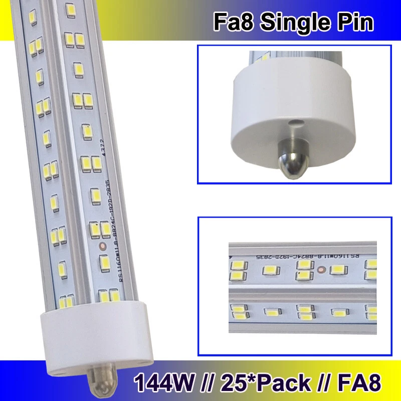 FAST DELIVERY - Ship from New Jersey or Los Angeles Warehouse via FedEx , 3-7 Days Delivered Your Door . SCIENTIFIC DESIGN - 8Ft LED Shop Lights Fixture is Made of 6500K Cold White SMD2835 LED Chip ,Plastic Clear Cover , Aluminum Bracket Housing ,and AC85-277V Constant Current Driver . It can work in -68F to 120F Temperature Conditions EASY INSTALLATION - The Integrated Tube Fixture Can be Install on Wall or Ceiling ,Easily Replace Traditional Fluorescent Tube Bulb . Plug and Play , Free Accessories (Power Cords, Connector , Extension Cords , Clip and Screw ) Come with Tube Lights Together WIDE APPLICATION - Linkable 8Ft Bulbs Widely Used in Garage Ceiling , Barbershop , Schools, Hospitals Basement , Factory Warehouses , Supermarkets Cooler Door , Offices, Shops,Hotels, etc 25Pcs 144W T8 8FT FA8 Single Pin Led Tube Light Bulbs 8' LED Shop Light 6500K 【No RF & FM Interference】LED Driver have passed Electromagnetic Magnetic Compatibility EMC tests,No cause EMI ,No longer subject to any RF & FM jamming. Never interfering with the signal of your garage roller shutter door,No make noise when you listen radio 【Easy to Install】Just simply bypass the ballast and connection AC85-277V AC power . Not compatible with single-ended powered sockets 【Wide Application】 - 8Ft 144W V Shaped FA8 HO LED Bulb fitted to replace traditional F96T12 T8 T10 T12 fluorescent bulbs. Widely used in Garage,supermarkets, offices , convenience stores , gas stations , warehouse,parking lot,shops, hotels,Refrigerator,coolers or freezers illumination,etc 【High Output】8Ft 144W 18000LM FA8 【Rotate Cap & Swivel End】 Easy Adjust rotated Lighting Direction within 180 degree after Installation