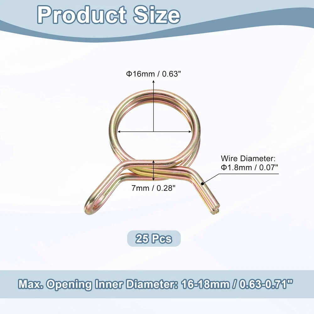 Document Description:Material - The spring hose clamp is made of 65 manganese steel, which has high strength, and resistant to daily scratches, durable to use. The color-zinc plating process makes the tube clip have wear resistance and anti-corrosion, with a metallic luster, making the clamp more beautiful.Design - The double-wire design allows the clamp to distribute the clamping force around the hose, making it tighter and more durable than a single-wire clamp.Advantage - This spring hose clamp is easy to use, just use pliers to open the clamp, you can easily put it on the pipe, the hose clamp can be firmly clamped on the pipe and is not easy to fall off.Widely Application - The spring hose clip is mainly used for fastening and sealing interfaces, and can firmly lock the power equipment fuel lines, air tube hoses, water hoses, silicone tubes, vacuum hoses, automotive fuel lines, gas pipes of motorcycles, snowmobiles, etc. Widely used in the automotive, marine, lawn mower, agricultural, material handling, factory and construction industries.Specification:Material: 65 Mn SteelColor: Color ZincLength: 33mm/1.3"Width: 32mm/1.26"Height: 7mm/0.28"Inner Diameter (Natural State): 16mm/0.63"Inner Diameter (Largest Opening): 16-18mm/0.63-0.71"Wire Diameter: 1.8mm/0.07"Package: 25pcs x Spring Hose Clamps Double Wire Spring Hose Clamp, 50pcs 304 Stainless Steel 10mm Spring Clips USD 11.2 Double Wire Spring Hose Clamp, 10pcs 304 Stainless Steel 5.5mm Spring Clips USD 6.71 Double Wire Spring Hose Clamp, 20pcs 304 Stainless Steel 5mm Spring Clips USD 7.49 Double Wire Spring Hose Clamp, 20pcs 304 Stainless Steel 3.5mm Spring Clips USD 7.49 Spring Hose Clamp, 50pcs 65Mn Steel 18mm Low Pressure Air Clip, Zinc Plated USD 21.04 Fuel Line Hose Clips, 20pcs 13mm 65Mn Steel Tubing Spring Clamps USD 7.22 25Pcs Double Wire Spring Hose Clamps, 16mm Tube Clips, Color Zinc Description: Material - The spring hose clamp is made of 65 manganese steel, which has high strength, and resistant to daily scratches, durable to use. The color-zinc plating process makes the tube clip have wear resistance and anti-corrosion, with a metallic luster, making the clamp more beautiful. Design - The double-wire design allows the clamp to distribute the clamping force around the hose, making it tighter and more durable than a single-wire clamp. Advantage - This spring hose clamp is easy to use, just use pliers to open the clamp, you can easily put it on the pipe, the hose clamp can be firmly clamped on the pipe and is not easy to fall off. Widely Application - The spring hose clip is mainly used for fastening and sealing interfaces, and can firmly lock the power equipment fuel lines, air tube hoses, water hoses, silicone tubes, vacuum hoses, automotive fuel lines, gas pipes of motorcycles, snowmobiles, etc. Widely used in the automotive, marine, lawn mower, agricultural, material handling, factory and construction industries. Specification: Material: 65 Mn Steel Color: Color Zinc Length: 33mm/1.3" Width: 32mm/1.26" Height: 7mm/0.28" Inner Diameter (Natural State): 16mm/0.63" Inner Diameter (Largest Opening): 16-18mm/0.63-0.71" Wire Diameter: 1.8mm/0.07" Package: 25pcs x Spring Hose Clamps Hot Item Fuel Line Hose Clips, 100pcs 3mm 304 Stainless Steel Tube Spring Clamps(Silver) USD 12.2 Steel Band Clamp 12mm Hose Tube Spring Clips Clamp Silver Manganese Steel 10Pcs USD 7.22 Double Wire 16mm Fuel Line Hose Tube Spring Clips Clamp Zinc Plated 10Pcs USD 6.85 Steel Band Clamp 26mm Hose Tube Spring Clips Clamp Black Manganese Steel 10Pcs USD 12.49 Double Wire 9mm Fuel Line Hose Tube Spring Clips Clamp Zinc Plated 20Pcs USD 7.27 Payment We accept eBay payment. Please do not email us to ask for other payment option. We appreciate prompt payment and look forward to your business in the future. Unpaid item will be filed without receiving payment in 7 days from listing ended. Shipping Usually we ship your order out within 24 hours in business day. For shipping and handling charges (S&H) for specific item, please refer to the item listing page for more details. Please make sure your shipping address is correct. We are not responsible for any loss in transit if a wrong address is provided. Return Policy Returns for exchange are permitted and must be initiated by the buyer within 30 days upon receipt. If you would like to return your product(s) for repair / replacement / refund, please kindly contact our customer service representatives via email for an authorized RMA number. Your returned product(s) will not be processed without a completed RMA. About Us We are continually expanding our product selection to better serve your need. We look forward to providing the best sevice to you - our dear customers, so take a look around our store and find the product that you want. You can put your trust in us! If you need any help or have any suggestions, please don't hesititate to contact us anytime , we will reply you within 24 hours and try the best to help you. Description Policy 25Pcs Double Wire Spring Hose Clamps, 16mm Tube Clips, Color Zinc Description: Material - The spring hose clamp is made of 65 manganese steel, which has high strength, and resistant to daily scratches, durable to use. The color-zinc plating process makes the tube clip have wear resistance and anti-corrosion, with a metallic luster, making the clamp more beautiful. Design - The double-wire design allows the clamp to distribute the clamping force around the hose, making it tighter and more durable than a single-wire clamp. Advantage - This spring hose clamp is easy to use, just use pliers to open the clamp, you can easily put it on the pipe, the hose clamp can be firmly clamped on the pipe and is not easy to fall off. Widely Application - The spring hose clip is mainly used for fastening and sealing interfaces, and can firmly lock the power equipment fuel lines, air tube hoses, water hoses, silicone tubes, vacuum hoses, automotive fuel lines, gas pipes of motorcycles, snowmobiles
