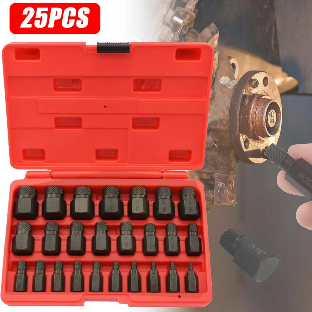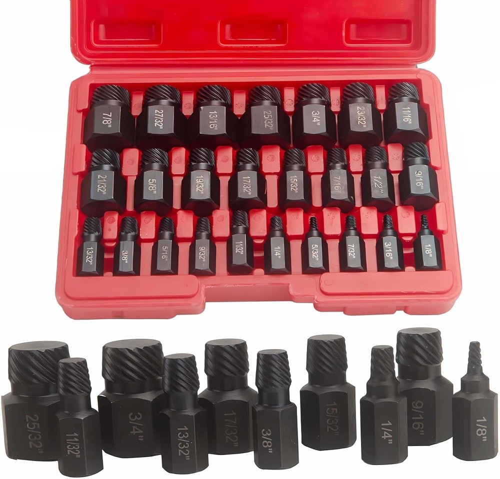 D escriptions: 【PREMIUM GRADE MATERIAL】 This is a professional damaged bolt screw extractor kit made of high-quality high-hardness chrome-molybdenum steel, durable and not easily damaged. Each surface is precision machined and resistant to corrosion. 【HEXAGON HEAD DESIGN】 RIMKOLO easy out screw extractor set that features unique hex head multi-spline design provides maximum torque with wrenches and sockets. Internal left-handed spiral design for extra grip and faster tapping. 【HIGH-VISIBILITY SIZE】 High-visibility laser-etched size is engraved on each easy out bolt extractor for quick selection and easy identification. Whether it's for mechanical maintenance or daily use, it can provide you with great convenience. 【MULTI-APPLICATION】 The screw extractor set can be used to remove broken studs, bolts, hexagon socket screws and fittings, or it can be used with a hexagonal drill bit for a wider range of applications. Suitable for the installation and repair of automobile, machinery, equipment and other products. 【25-PIECE BOLT EXTRACTOR】 The broken screw remover comes with a heavy-duty carrying case, lets all the multi-spline screw extractors stay organized. It contains 7/8", 27/32", 13/16", 25/32", 3/4", 23/32", 11/16", 21/32", 5/8", 19/32", 9/16", 17/32", 1/2", 15/32",7/16", 13/32", 3/8", 11/32", 5/16", 9/32", 1/4", 7/32", 3/16", 5/32", 1/8", meets all your needs. Specification : Material:40CR-V steel Color: Black Weight:1830g Case Size:210*150*47mm Package List: 25PCS * Screw Extractor