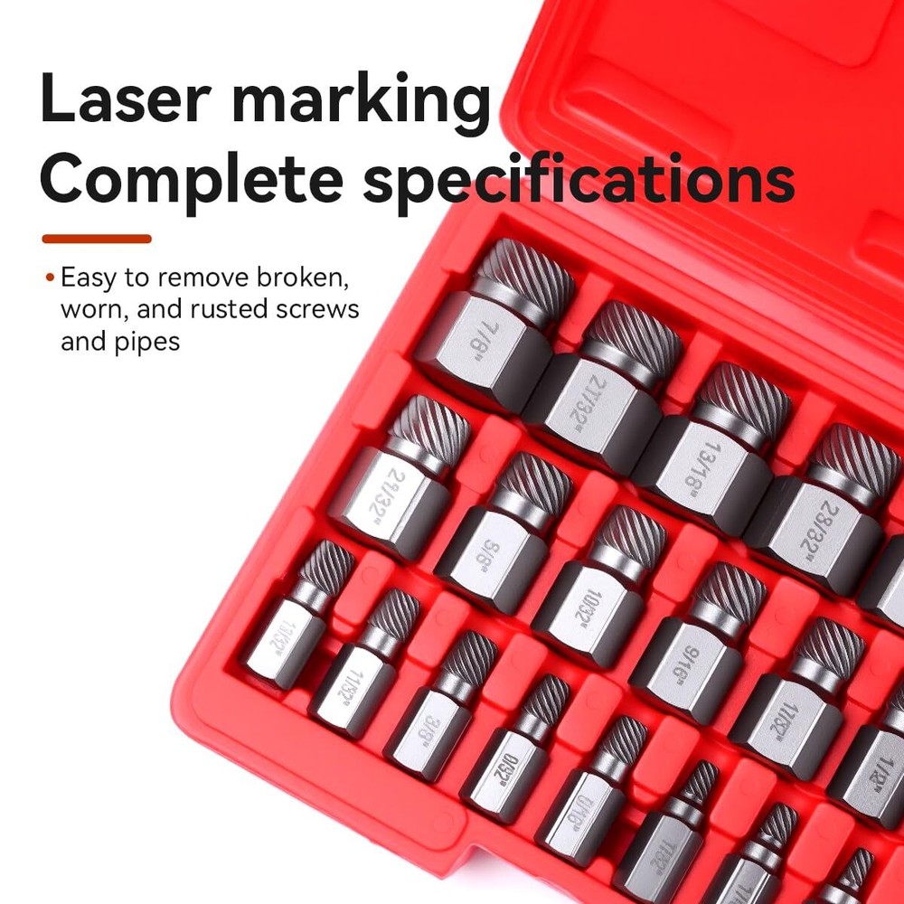 25 Piece Screw Extractor Set Heavy Duty Damaged Bolt Remover Tool Kit High-Quality CR-MO Steel for Durability:Crafted from heat-treated chromium molybdenum steel, this extractor set is designed to be durable and resistant to damage. Each tool in the set is built to withstand the rigors of removing damaged screws, bolts, and nuts, ensuring long-lasting performance. Easy to Use with High-Density Spiral Design:Suitable for both power tools and hand tools, this set features a high-density spiral design that helps in the fast and efficient removal of broken screws, bolts, nuts, studs, fittings, threaded pipes, and pins. The design ensures a smooth and easy extraction process. Comprehensive Set with Multiple Sizes:This 25-piece set includes a wide range of sizes to meet all your needs: 1"-7/8", 1"-27/32", 1"-13/16", 7/8"-25/32", 7/8"-3/4", 7/8"-23/32", 7/8"-11/16", 7/8"-21/32", 3/4"-5/8", 3/4"-19/32", 3/4"-9/16", 3/4"-17/32", 5/8"-1/2", 5/8"-15/32", 5/8"-7/16", 1/2"-13/32", 1/2"-3/8", 1/2"-11/32", 1/2"-5/16", 1/2"-9/32", 1/2"-1/4", 1/2"-7/32", 1/2"-3/16", 1/2"-5/32", 1/2"-1/8". This comprehensive set ensures you have the right tool for any job. Stamped Sizes for Easy Identification:Each tool in the set is engraved with its size for easy identification. The chamfered bit ensures a smooth fit onto fasteners, making it ideal for car maintenance or everyday use. This set provides great convenience and ensures you always have the right tool on hand. 24/7 Customer Support:DUMDUM offers 24/7 customer support. If you have any questions or need assistance, please feel free to contact us via Amazon. We are committed to providing you with a satisfactory answer and ensuring your complete peace of mind. Multiple size to meet all your need:25pcs including:1"-7/8" ,1"-27/32",1"-13/16",7/8"-25/32",7/8"-3/4",7/8"-23/32", 7/8'-11/16", 7/8"-21/32", 3/4"-5/8", 3/4"-19/32", 3/4"-9/16", 3/4"-17/32", 5/8"-1/2", 5/8"-15/32", 5/8"-7/16", 1/2"-13/32", 1/2"-3/8", 1/2"-11/32", 1/2"-5/16", 1/2"-9/32", 1/2"-1/4", 1/2"-7/32", 1/2"-3/16", 1/2"-5/32", 1/2"-1/8". Shipping We offer FREE shipping on all orders! We ship within Three business days of payment, usually sooner. We use a selection of shipping services such as UPS, FedEx, USPS etc. We only ship to the lower 48 states, no APO/FPO addresses or PO Boxes allowed. Local pickups and combined shipping options are not provided at this time. Return You can return a product for up to 30 days from the date you purchased it. Any product you return must be in the same condition you received it and in the original packaging. Please keep the receipt. Payment We accept payment by any of the following methods: PayPal Please pay as soon as possible after winning an auction, as that will allow us to post your item to you sooner! Feedback Customer satisfaction is very important to us. If you have any problem with your order, please contact us and we will do our best to make you satisfied. Contact Us If you have any queries, please contact us via ebay. We usually respond within 24 hours on weekdays. Please visit our eBay store to check out other items for sale! Thank you for shopping at our store.