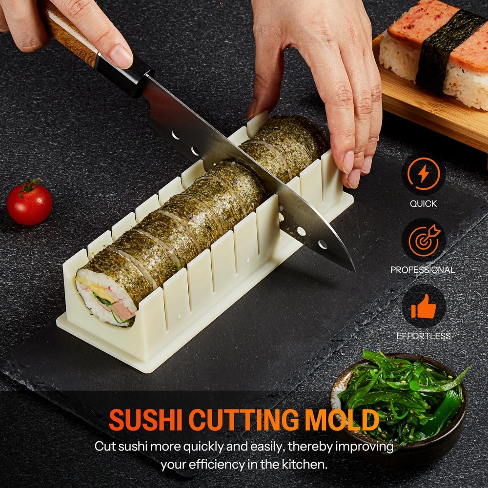 !!!NOTE!!! 1.When you receive the sushi suit, you will smell some bamboo with naturally distributes an aroma, which is a normal phenomenon. 2.When you use it for the first time, you must soak the Paddle、Spreader and Bamboo Mat in warm water for six hours. Wait for the bamboo to dry naturally, and the smell will be reduced 3.These products is made of bamboo, naturally distributes an aroma.Normally, different set could have some color or grain differences. It is safe for use as long as there is no splits and perforations. 4.Dry thoroughly to storage after wash. 5.Dishwasher is not recommended to wash. Who doesn’t love sushi? This kit provides everything you need for the complete sushi-making experience.Whether you’re a beginner, a world class professional sushi chef or a culinary student, this kit has everything you need to make an original snack in just a couple of minutes. Do you spend a lot of money in a sushi restaurant? Now you can make your own sushi at home! The Sushi Kit is the easy-to-use and original way to make sushi. You just need to use the spoon to mix the rice and vinegar. Then use the rice spreader to spread the rice evenly. Roll up the sushi tightly with the specially crafted mats. 【High-Quality】Our sushi making kit is crafted from premium natural bamboo, ensuring high quality and durability. You won’t encounter any splinters or experience the cotton string stitching coming undone with our products. 【Easy To Use】This kit is accessible to everyone, from novices and seasoned sushi chefs to culinary learners, providing all the necessary tools to whip up a unique snack swiftly. Sushi rolling becomes a breeze with our set, allowing you to transform into a sushi master and revel in an unparalleled sushi feast. 【Enjoy Cooking】Delight in the process of creating new dishes right in the comfort of your home, and hone your skills in eating homemade sushi with our intricately designed chopsticks. Seize the opportunity to bring this enjoyable culinary experience into your own kitchen. Why not take the initiative to try it out for yourself? 【Healthy Diet Choose】Every component of our kit is crafted from food-grade, BPA-free plastic, ensuring a safe and healthy choice for your culinary adventures. Creating your own sushi at home becomes a budget-friendly alternative to dining in costly Japanese eateries. With our kit, you have the capability to easily and quickly prepare delicious sushi, promoting both a healthy diet and cost savings. 【Packing List】Sushi Bazooka, 2pcs Bamboo Mat, Paddle, Spreader, Sushi Knife, 4pcs Bamboo Chopsticks, 4pcs Chopsticks Holder, Nigiri Mold, Musubi mold, Onigiri Mold,Temaki Roller,Cunkan Sushi Mold,Sushi Cutting Mold,Sushi Ball Maker, Guide. This kit has everything you need to make sushi in just a couple of minutes