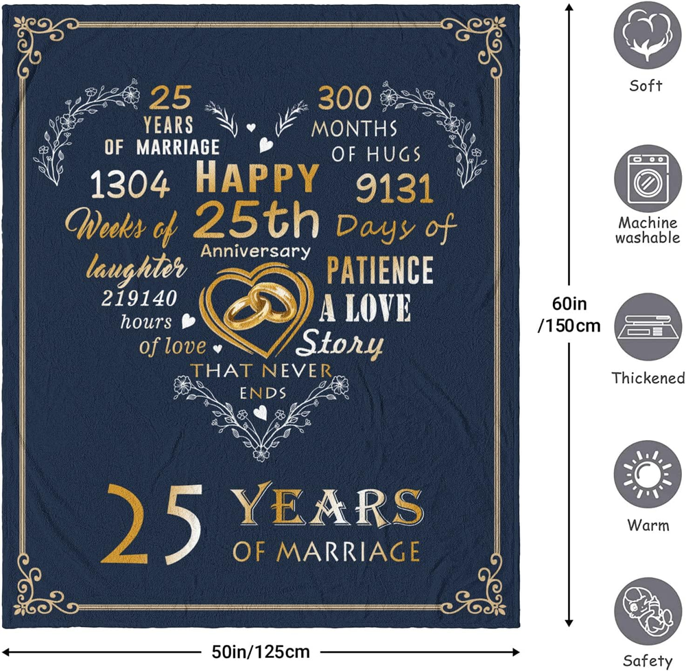 Store New Arrivals Add to Favorite View Feedback Contact Gifts for 25Th Anniversary Blanket, 25Th Silver Wedding Anniversary Couple Gifts Description Style Americana Number of Items 1 Pattern Letter Print Embellishment Embroidery Blanket Form Throw Blanket Theme Anniversary Department Kids Product Dimensions 50"L x 60"W Material Polyester Age Range (Description) Adult Seasons All Water Resistance Level Not Water Resistant Item Weight 1.48 pounds Special Feature Skin Friendly Fabric Warmth Description Lightweight Color 25th Anniversary - Blue Recommended Uses For Product indoors,outdoors Sport Camping Fabric Type Flannel Product Care Instructions Machine Wash Size 60"x50" 💍Material: Made of 100% high-quality microfiber polyester. It’s more soft, cozy, warm and lightweight, yet long-lasting enough 💍Size: 60"x50"/150x125cm. Perfect size suitable for all ages and Convenient to carry, just roll it up, you can take this light weight throw to anywhere 💍Occasions: Perfect for snuggling up on the couch, bed, sofa, chilly movie theater, park, office naps, camping, travel, sleeping and driving. The breathable blankets make it suitable for all season 💍Best Gift Choice: This plush blanket is a good anniversary gift for couple, parents, grandparents, dad, mom, grandfather, grandmother, friends on their 25th anniversary/25th wedding anniversary 💍Washing Instructions: Washable in multiple ways, quick drying, easy care. Since the product is shrink-wrapped, there might be slight creases, which will disappear after washing Product Description Best throw blanket to commemorate precious moments!!! 25th wedding anniversary, also known as the silver anniversary, is a milestone to be celebrated. Silver wedding is undoubtedly one of the most special moments in life, that’s why it deserve a special gifts to witness the unparalleled 25th anniversary. This gift for 25th wedding anniversary is a ideal way to create eternal love memories. ------Happy 25th Anniversary------ High-quality materials Made of 100% Polyester. It is not only lightweight, soft, warm and with comfortable handing feeling, but also durable, do not fade or shrink. Wrap yourself up in this blanket, you will feel ultimate comfort. Multi-function It is suitable for four seasons, a great addition to your bedding, sofa, couch, chair, bedroom, living room, guest room, office, RV, campsite, picnic or as a pets bed for dogs and cats. Suitable for any ocassions. Easy to care This flannel fleece blanket is one-side printing and using heat dye sublimation technique, which has long-lasting effects and without fear of fading or shrinkage. Easy to clean, quick dry, do not use bleach. ABOUT US We offer the best prices around on high quality products. Our E-store includes media such as books, movies, music and games while offering electronics, toys, sporting apparel, clothing, tools, general home, garden items and more. SHIPPING We are always working hard to ensure your package arrives as soon as possible. Please understand that some factors like weather, high postal traffic, and the performance of shipping companies are outside of our control. We offer free shipping to the lower 48 states and ship within 2 business days of payment, usually sooner. We do not accept P.O. Boxes. Please provide a physical address. RETURNS We offer a 30-Day Return Policy on items which you are not completely satisfied with. You have the option for a full-refund or an exchange of the item. No returns are available on items shipped outside of the USA. PAYMENT We accept PayPal. CONTACT US This page content is yet to come Please ad us to your favorite seller and visit again later Thank You CUSTOMER SATISFACTION We try our very best to make sure every customer is completely satisfied. If there's a problem, message us! We're happy to help.