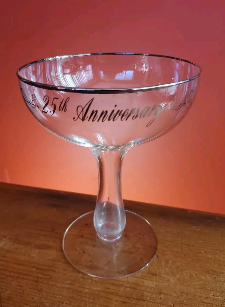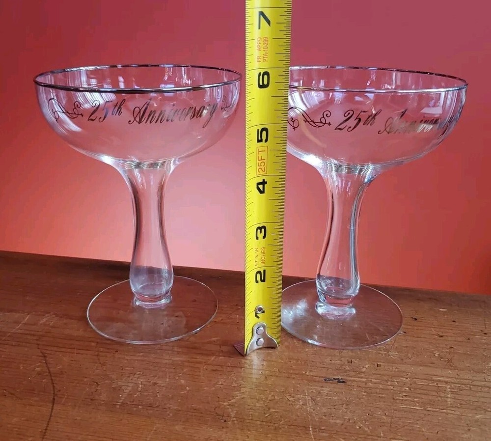 1. These elegant champagne glasses are perfect for celebrating 25 years! The silver-trimmed hollow stems add a touch of sophistication, and they’re in great condition. Ideal for toasting to special moments—love the vintage charm!