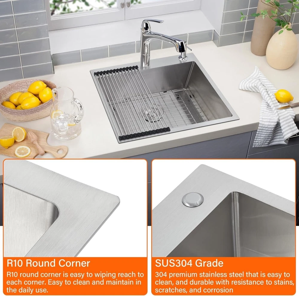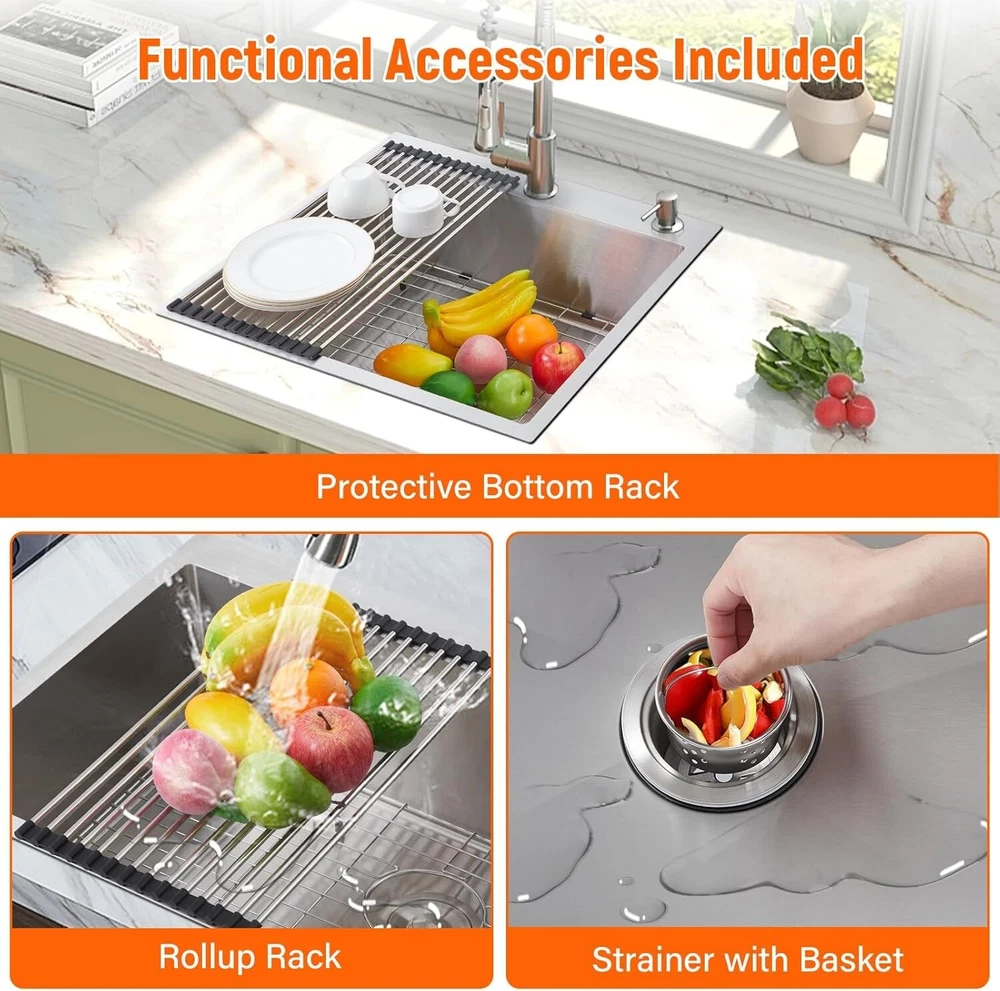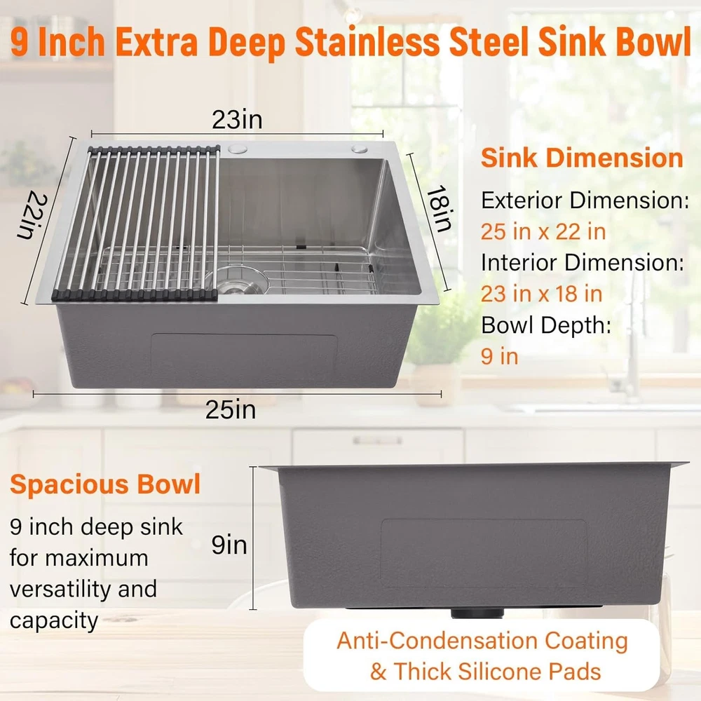 Description: 1. Material : This kitchen sink is made from high-quality 304 stainless steel, offering strength, durability, rust resistance, and easy cleaning. It features an upgraded thickness of 3mm, making it 50% thicker than most standard kitchen sinks. 2. Design: This household dishwasher sink operates quietly, thanks to thicker and softer rubber noise reduction pads. It features an X-shape flow line to prevent clogging and R10° rounded corners for easy cleaning and a modern appearance. 3. Function: Exterior dimensions are 25" x 22" with a bowl depth of 9". This stainless steel drop-in sink is deep enough to accommodate large pots, pans, and cookie sheets, while also concealing dirty dishes waiting to be loaded into the dishwasher. 4. Tip: The package includes a drop-in kitchen sink, a roll-up rack, a bottom grid, a drain assembly, mounting clips, and manual. 5. Occasion: The sink is compatible with any countertop material and can be easily installed and removed without causing damage to the countertops. Package Include: 1x Drop In Kitchen Sink