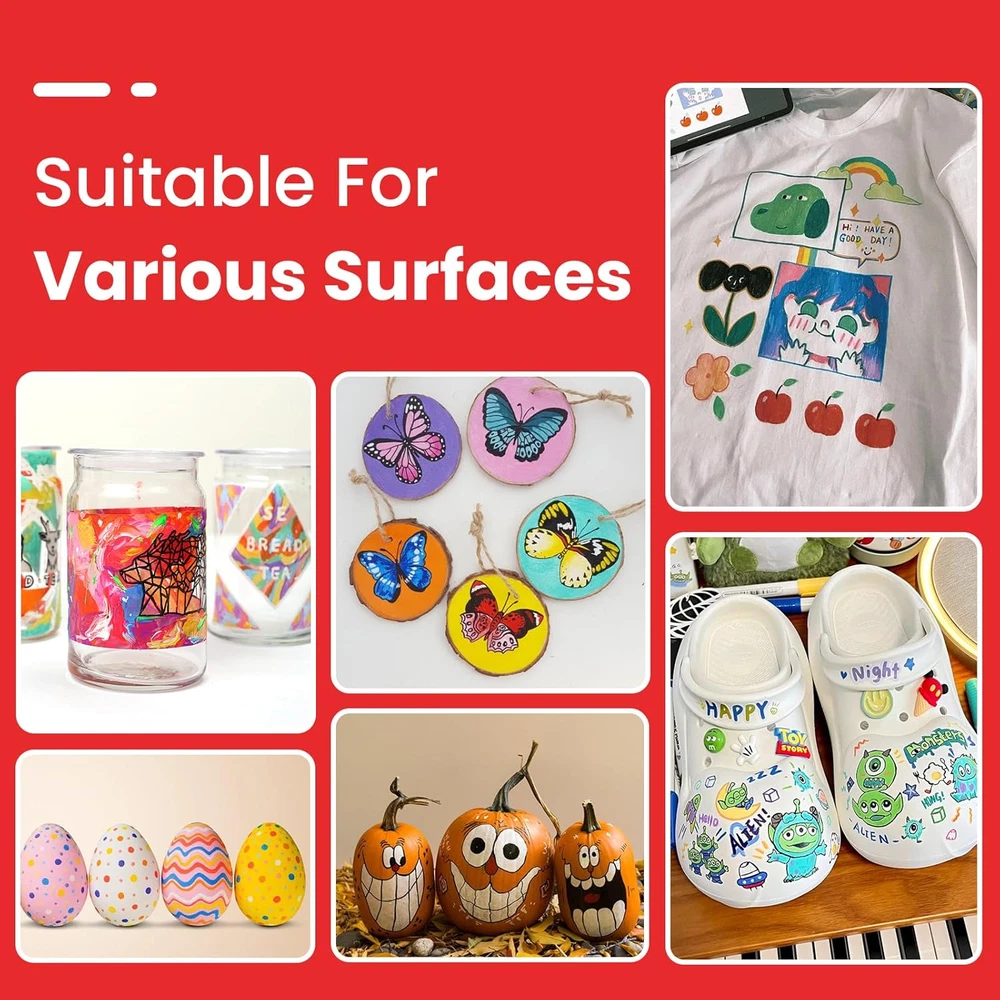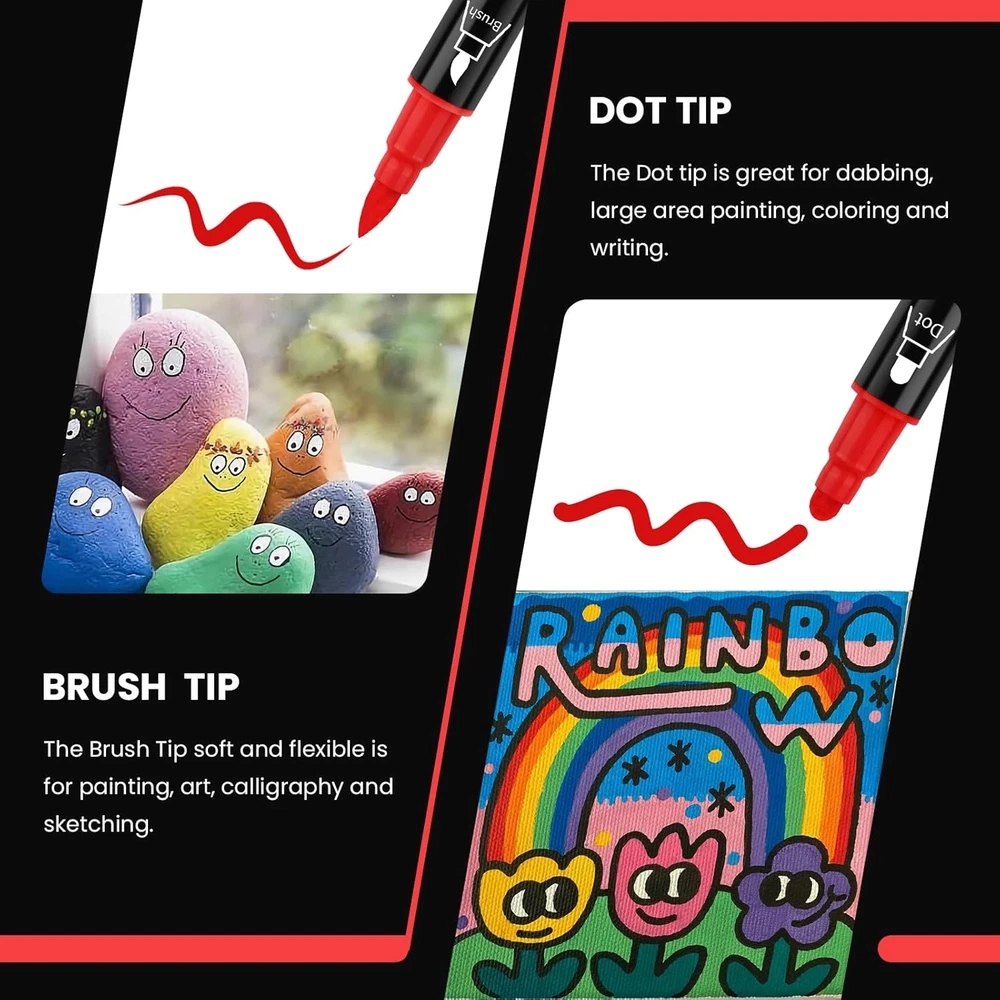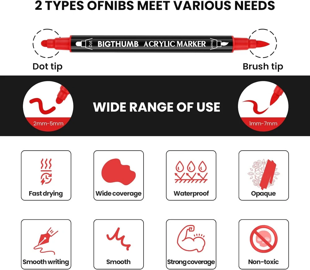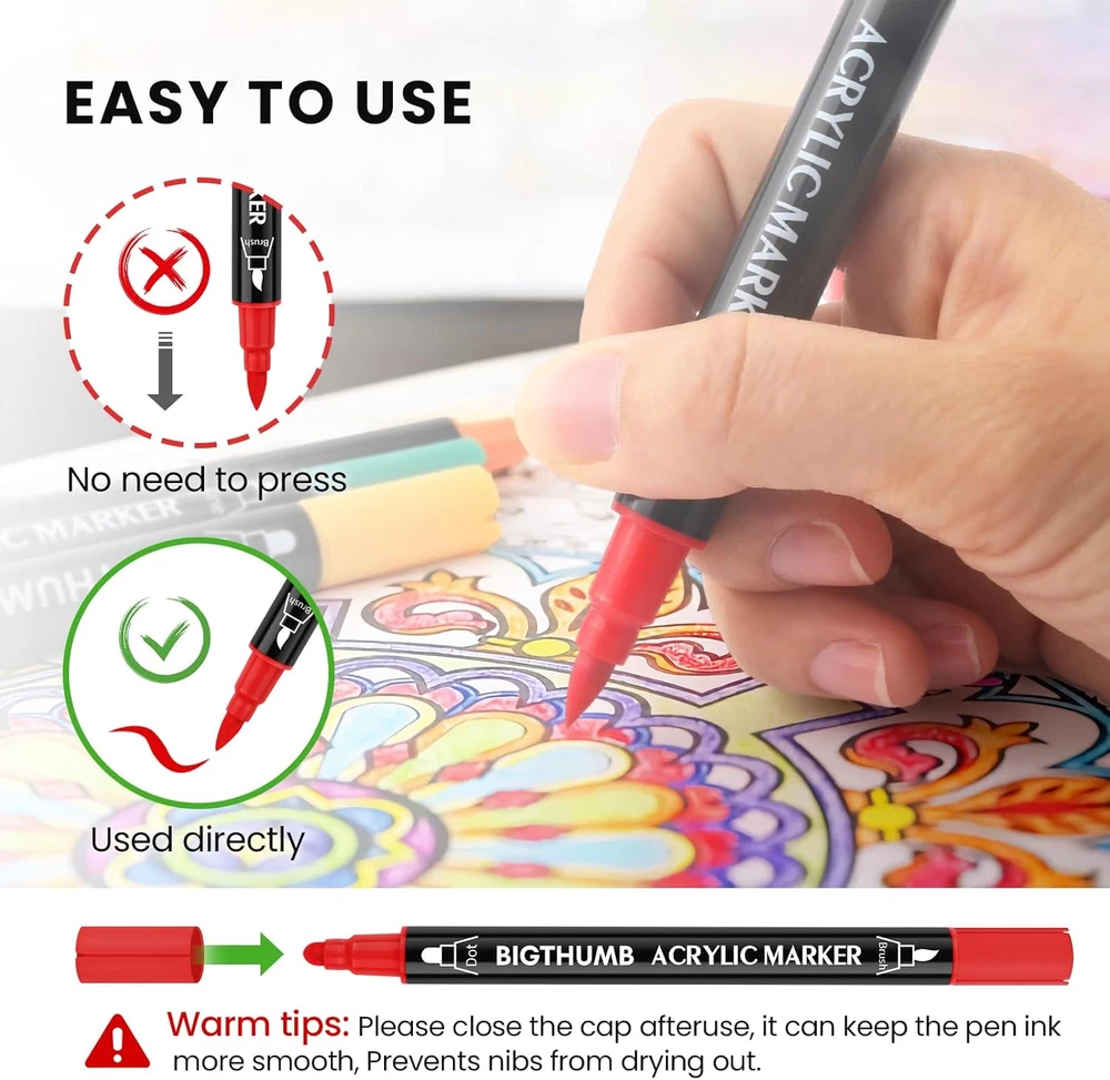 Store New Arrivals Add to Favorite View Feedback Contact Fast deliveries to the customer's home Quality customer service John Make the customers happy! 26 Colors Acrylic Paint Pens, Dual Tip Acrylic Paint Markers with Brush Tip and Dot Tip, Paint Markers for Painting Rock, Wood, Canvas Description 【🎨 26 Colors】26 colors can almost all of your daily creations. Please put on the cap, otherwise the nib will dry out. 【🎨 Dual Tip Acrylic Paint Pens Markers】Each acrylic marker comes with a 1-7mm Brush Tip and a 2-5mm Dot Tip. Dual tip design meets different coloring needs. Brush Tip is used for fine drawing, sketching, and coloring, while the Dot nib is used for dabbing, painting, coloring, and writing. 【🎨 Materials and Properties】Different ordinary push-type Acrylic marker pens, our acrylic pens are cotton tips that can be used directly and dry faster. Water-based and opaque ink, Great Coverage, Water & Fade resistant. 【🎨 Multi-Purpose】Enjoy creating art projects on a variety of surfaces, works for rock painting, wood, ceramic, glass, fabric, stone, metal, plastic, canvas, Christmas ornament, Halloween, calligraphy, writing, Christmas cards, birthday gifts, Doodle Marker Decorating or Easter Eggs. 【🎨 Great Gift Idea】Perfect for Kids, Daughters, Sons, Granddaughters, Grandsons, Loved Ones, Friends, and Gifts for Painting Rock Lovers. DIY crafts and paintings can be met. paint pens perfect for artists, art students, children, teens and adults to use on arts and crafts projects. Suitable for Birthdays, Easter Day, Halloween, Christmas Day, Valentine's Day, Thanksgiving Day, New Year or Special Holidays Gift. 【🎨 Waterproof not scratch resistant】The paints are waterproof, but acrylic paints are poorly resistant to rubbing and acrylic inks are not scratch resistant. Product Description Note: acrylic paints are poorly resistant to rubbing 1 Painting Rock 2 Painting Wood 3 Fabric 4 Art&DIY Crafts What types of surfaces can be these paint pens be used on? BIGTHUMB paint pens are multisurface, They can be used on rocks, wood, Paper, glass, ceramic, porcelain, metal, canvas, rubber. fabric, board, Stone, epoxy resin, and more. Are they water-based or oil-based? This set of paint pens are acrvlic water-based. How can I properly bake glass, ceramic, or porcelain after painting? When you finish drawing, Place the dried artwork in the oven, set the oven for 310-350F (155-180C), and letit go for 20 minutes. When you turn the oven off, leave your art there until it cools. How can I properly use the acrylic paint pens markers on fabric? After the paint has completely dried, heat set it for permanency with an iron (without steam) for 3–5 minutes. Place a cotton cloth between the iron and item of clothing. I can wash it off with water after I get ink on my hands, I'm not sure if it's really waterproof or if it's permanent. The paints are waterproof, but acrylic paints are poorly resistant to rubbing and acrylic inks are not scratch resistant. Item model number BB-US-AM026DB-A01 Closure Click-Off Cap Style 26 Colors Brush-Dot Writing Instrument Form Marker Pen Number of Items 26 Color 26 Colors Brush-Dot Material Type Nylon, Acrylic Line Size 1.0-7.0 Millimeters Manufacturer Part Number BB-US-AM026DB-A01 Item Weight 9.4 ounces Age Range (Description) Kid Ink Color Multicolor Point Type Brush & Dot Package Dimensions 12.71 x 7.01 x 0.55 inches Size 1 Count (Pack of 26) ABOUT US We offer the best prices around on high quality products. Our E-store includes media such as books, movies, music and games while offering electronics, toys, sporting apparel, clothing, tools, general home, garden items and more. SHIPPING We are always working hard to ensure your package arrives as soon as possible. Please understand that some factors like weather, high postal traffic, and the performance of shipping companies are outside of our control. We offer free shipping to the lower 48 states and ship within 2 business days of payment, usually sooner. We do not accept P.O. Boxes. Please provide a physical address. For shipping outside of the continental USA, we only use eBay's Global Shipping Program. The item is shipped to KY and then sent to the rest of the world. International customers are responsible for all duties and taxes. Continue to 'check out' to calculate costs for shipping the item to your country. Messages regarding eBay's Global Shipping Program MUST be directed at eBay EXCLUSIVELY. RETURNS We offer a 30-Day Return Policy on items in which you are not completely satisfied with. You have the option of a full-refund or an exchange of the item. No returns are available on items shipped outside of the USA PAYMENT We accept PayPal. CONTACT US This page content is yet to come Please ad us to your favorite seller and visit again later Thank You CUSTOMER SATISFACTION We try our very best to make sure every customer is completely satisfied. If there's a problem, message us! We're happy to help. WE ACCEPT