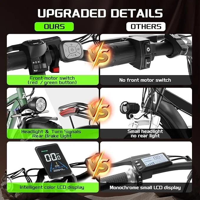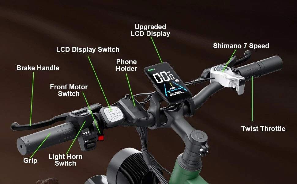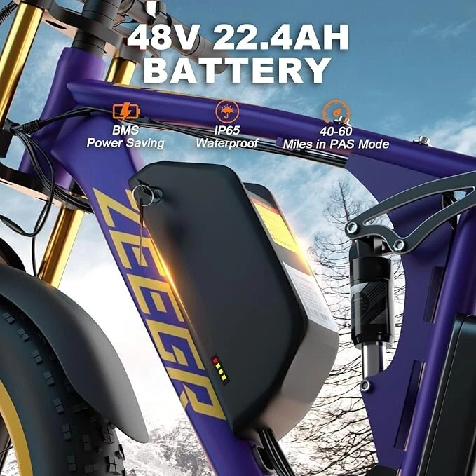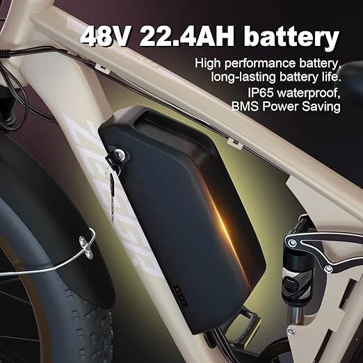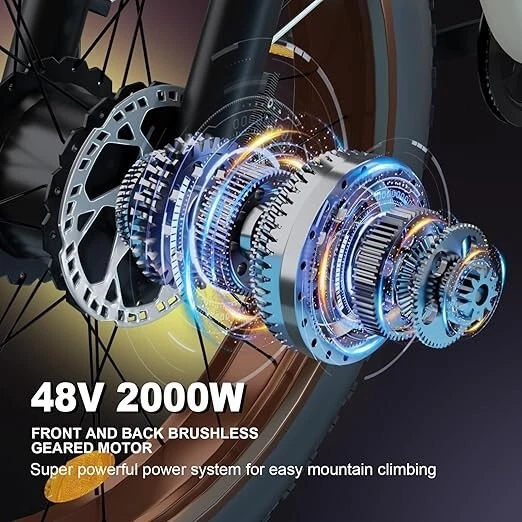 V1 / S1 Full Suspension Description 【Dual Motor Electric Bikes for Adults】 TWO upgraded 48V/52V 1000W high speed Front & Rear brushless motors provide electric bicycles with stronger power and climbing ability, helps to reach the top speed of 35MPH with ease. Removable large capacity 48V/52V 22.4Ah battery offers a long riding range up to 40-60 miles in pedal assist mode. It takes only 5-8 hours to fully charge the battery 【Big Capacity Lithium Battery Ebike】 Large capacity 48V/52V 22.4Ah battery offers ebikes long riding range of 40-60 miles,the waterproof battery of ebike is not only large capacity and long lasting, but it's also removable, convenient to take home or office for charging.Upgraded 54.6V 3A charger completes charging quickly in 5-8 hours 【Full Suspension 26" Fat Tire Electric Bike】 Equipped with a dual-crown front suspension fork and rear shock absorber , which greatly reduces bumps during riding. 26" x 4" fat tires also provide good grip and excellent shock absorption. This full suspension ebike offers a more comfortable riding experience in the snow, beach, mountain, city roads, helps you conquer most road conditions 【Hydraulic Disc Brakes & Shimano 7 Speed Gears】 The ebikes for adults adopt front and rear hydraulic disc brakes, which provides more effective braking in rainy weather, heavy off-road, long downhill and adverse conditions. The bike frame is made of high quality 6061 aluminum alloy, more lightweight and durable. Equipped with professional Shimano 7 speed gears, more accurate and stable 【 5 Riding Modes 】 Enjoy versatile riding with 5 modes: dual motor electric, single motor electric, pedal assist, cruise, and bike mode. With 5 levels of assist, the bike can reach speeds up to 35 mph, depending on battery charge, load, and road conditions. Choose from speeds of 12, 18, 24, 29, or 35 mph.Whether cruising or conquering tough terrain, ride faster, farther, and freer. Don’t just ride—feel the power beneath you! 【Upgraded Lights for Night Riding】 The color LCD display keeps track of real-time speed, battery level, pedal assist level and mileage. This electric bicycle comes with an upgraded bright headlight & turn signals & rear brake light, making you visible and safe at night 【Easy to Assemble】 This e-bike comes 85% pre-assembled. 【1-year warranty】If there is any problem, pls contact us, we’ll reply your message within 24 hours. Pls keep the original bike box for 30 days for possible return Specification Motor 48V/52V 1000W Front & Rear brushless motors Battery 48V/52V 22.4AH lithium-ion battery Display Multifunctional color LCD Display Frame 6061 aluminum alloy Transmission Shimano 7 speed Full Suspension Suspension fork & rear suspension Brake Hydraulic disc brakes Throttle Twist throttle Light Front light & rear brake light & turn signals Tire 26" * 4.0" fat tires 4 Modes Pure electric, pedal-assist, cruise mode, normal bike mode Max Load 330lb (150kg) Range (PAS mode) 40-60 miles (65-95km) Max Speed 35MPH (56KM/H) Charging Time 5-8 hours Bike Size 76.0"*28.7"*44.5" (193*73*113CM) Package Size 58.3"*12.6"*31.5" (148*32*80CM) Bike Weight 75 lbs (34 kg) Package Weight 97 lbs (44 kg) F1 Description 【Dual Powerful 1000W Motors】 The electric bike is equipped with high-speed front & rear 1000w motors, top speed is up to 35MPH . It has stronger hill-climbing performance and offers more power for daily commuting and long travel. You can get excellent riding experience in the snow, beach, mountain, city road, and conquer most road conditions 【Large Capacity Battery 】 With a removable 48V 22.4Ah battery, this fat tire electric bike supports a longer range up to 40-60 miles in pedal assist mode. Your adventures and daily commutes will become wilder and more cost-effective. Upgraded 54.6V 3A charger completes charging quickly in 5-8 hours 【Hydraulic Disc Brakes & Suspension Fork】 The hydraulic disc brakes enable the ebike to brake more quickly and smoothly when riding at high speed, shortening the braking distance even on a wet road. The lockable suspension fork helps you pass rough terrain with less effort. The 26" x 4" fat tires provide good grip and excellent shock absorption for greater durability 【Excellent Riding Performance】 Electric mountain bike frame is made of high quality 6061 aluminum alloy, more sturdy and durable. Equipped with professional 7 speed gears, more accurate and stable. Upgraded headlight, turn signals and rear brake light, intelligent LCD display, this electric bicycle will be a better choice for long time travel and night riding 【4 Working Modes】 Pure electric mode, pedal-assist mode (5 levels), cuise mode, normal bike mode. This adult electric bike can meet your daily commuting needs and outdoor needs, either it is to explore new trails outdoors, get in some exercise, or rush into work 【Professional Customer Service】 1-year warranty. If there is any problem, pls contact us, we’ll reply your message within 24 hours. Pls keep the original bike box for 30 days for possible return Specification Motor 1000W dual motors,brushless front & rear motors Battery 48V 22.4AH lithium-ion battery Display Multifunctional color LCD Display Frame 6061 aluminum alloy Transmission Shimano 7 speed Fork Suspension fork Brake Hydraulic disc brakes Charger 54.6V 3A US Standard Throttle Twist throttle Light Front light & rear brake light & turn signals Tire 26" * 4.0" fat tires 4 Working Modes Pure electric, pedal-assist (5 levels), cuise mode, normal bike mode Max Load 330lb (150kg) Range (PAS mode) 40-60 miles (65-95km) Max Speed 35MPH (56KM/H) Charging Time 5-8 hours Bike Size 76.0"*28.7"*44.1" (193*73*112CM) Package Size 58.3"*11.4"*30.3" (148*29*77CM) Bike Weight 73 lbs (33 kg) Package Weight 93 lbs (42 kg) The item is UL 2849 certified with a link to the UL Product iQ < https://productiq.ulprospector.com/en >