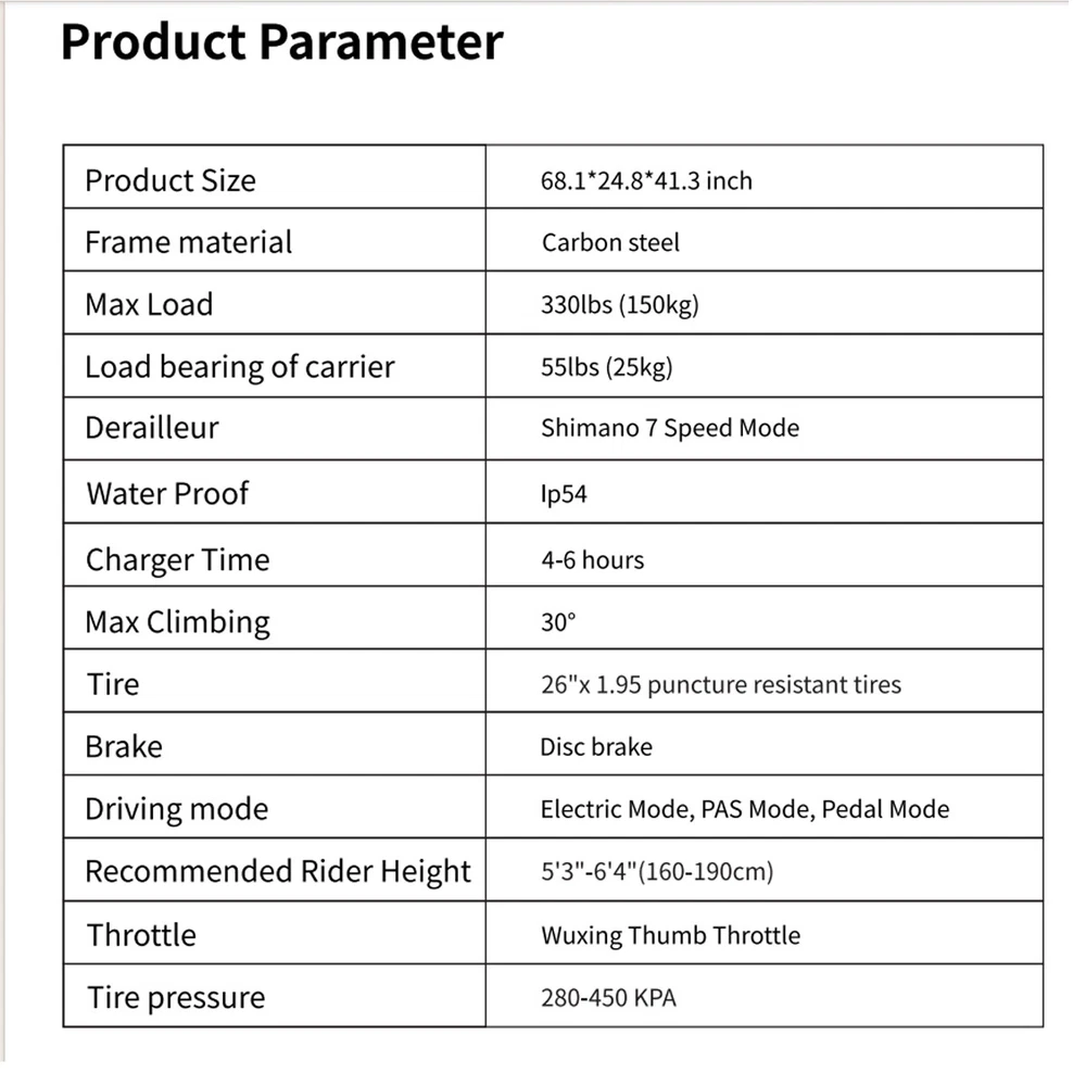 HOME PAYMENT SHIPPING ABOUT US CONTACT US Store Categories Store Categories LED Work Light LED Light Bar 5x7" LED Headlight 4x6" LED Headlight LED Whip Light Jeep Light Mounting Brackets Front & Rear Bumper Accessories Toys For Kids Auction Others Floor Mat Clearance 20% OFF Shipping labels E-bike Grille Other Detail About this item: 【4 WORKING MODES】 - Cityscape Electric Bike is a powerful and cost-effective road e-bike. 1. Pedal Assist Mode 2. Fully Electric Mode 3. Pedal Mode 4. Walk Mode.Four riding modes switch easily for enjoying a long time travel, and also exercise. 【INTELLIGENT LCD DISPLAY DESIGN 】Cityscape Electric Bike has an intuitive, readable LCD display shows you the speed, battery, mileage and more. The LCD display visualizes your riding data, providing your navigation with more confidence and fun.With its adjustable seat, and step-thru frame, it allows different sized riders to use the bike easily. 【POWERFUL MOTOR & REMOVABLE BATTERY】 Cityscape Electric Bike is equipped with a 500W brushless motor, provide enough power for your daily outings.Up to 22mph Top Speed. 36V 13AH large removable battery is strong enough for these activities. The ebike can ride 40 miles by pedal assist after charging 4 - 6 hours, long battery life. 【COMFORT MEETS STYLE & RICH CONFIGURATION】 Cityscape Electric Bike made of high-strength carbon steel frame and superior bike paint. Ergonomic and stylish step-thru design, enlarged comfortable seat.LED Headlights and rear reflectors for safe riding.Please note every new bike has gone through road testing before packing, there may be some dust on the tires. 【 Axiniu 7-SPEED & 26''X 1.95'' ELECTRIC BIKE】 Cityscape Electric Bike with 26" inch puncture resistant tires. Axiniu 7-speed drive-train provides accurate and smooth shifting to ensure safer travel. Cityscape lets you get across city like never before! The high-quality dual disc brakes make your cycling safer. 【EASY TO INSTALL,READY TO GO】 Cityscape Electric Bike is 85% pre-assembled with instructions and tools included.The installation video is attached to our product page.Our EG-HL01-Grey electric bike is the perfect electric bicycle for beginners because of its intuitive and accessible design. Our warehouses and after-sales centers in CA,USA to ensure the fastest delivery and quickly solving your problem. 12moths Warrantly /4 hours fast reply. 【330 LBS Max Capacity】 The Ebike is framed by High-carbon steel which brings a more reliable safety system than other brands. Adjustable seat fits. The bike weighs 55 lbs and has a max load capacity of 330 lbs. The triangular High-carbon steel frame is extremely stable and strong to handle weight and pressure, which is friendly for people with taller or stronger and take you anywhere. 【SERVICE AVAILABLE】 The electric bicycle arrives 90% assembled. so you won't have to waste time with the complicated assembly. Load racks can be installed by yourself according to your needs. comes with an instruction manual and installation tools. All e-bikes are backed by a full 1 year warranty. If you have questions or concerns, please contact the Our team 【12 MONTH WARRANTY】 This ebike is covered by 12-month warranty. If you have any question about product or service, please feel free to contact us. We will reply you within 24-48 hours and do our best to solve your question. Features: 36V/13Ah Removable Built-in Lithium-ion Battery 750W Powerful Brushless Motor Large Intuitive LCD Display & Adjustable handlebar Light: 20W front headlights+tail lights with brake lights Package: 1 X Electric Bicycle with Battery 1 X Free U-lock Question & Answer: Q: How to switch the display screen between Miles per hourand Kilometers per hour? A: Enter the system menu to set "P02" for selection and modification See the manual for detailed operation Q: How to turn on the light? A: Long press power button to turn on the display first, then short press light buttonto turn on/off the lights . Q: Can I make a copy of the key? A: Of course you can, we will provide 2 keys in original package and you could copythem as back-up. Q: Does this bike can be operated as a normal bike without the motor assist? A: Yes, this ebike has 3 riding modes, which are Ebike & Pedal-assisted & Normal bike. If you do not turn on the display and power, you can ride as an ordinary bicycle. Q: Can Iride it in the rain? A: This electric bike for can be rode in the rain thus all the material it made are waterproof. but we don't recommend you to like that often, and suggest drying your bike after your ride in rainy day. Q: Why do the tires have riding marks? A: The wrapped tires received may have traces of riding, which are left by the factory wheneach car is self riding. Q: ls the battery removable? A: Yes, the battery can be taken off from the ebike. Use the keys to unlock, you can chargethe battery in the electric bike or charge it alone in a convenient way. The item is UL 2849 certified Shipping Policy Payment Method Returns Policy Shipping Policy Payment Method Returns Policy HOME PAYMENT SHIPPING ABOUT US CONTACT US Copyright © 2018 DataCaciques HOME PAYMENT SHIPPING ABOUT US CONTACT US Detail About this item: 【4 WORKING MODES】 - Cityscape Electric Bike is a powerful and cost-effective road e-bike. 1. Pedal Assist Mode 2. Fully Electric Mode 3. Pedal Mode 4. Walk Mode.Four riding modes switch easily for enjoying a long time travel, and also exercise. 【INTELLIGENT LCD DISPLAY DESIGN 】Cityscape Electric Bike has an intuitive, readable LCD display shows you the speed, battery, mileage and more. The LCD display visualizes your riding data, providing your navigation with more confidence and fun.With its adjustable seat, and step-thru frame, it allows different sized riders to use the bike easily. 【POWERFUL MOTOR & REMOVABLE BATTERY】 Cityscape Electric Bike is equipped with a 500W brushless motor, provide enough power for your daily outings.Up to 22mph Top Speed. 36V 13AH l