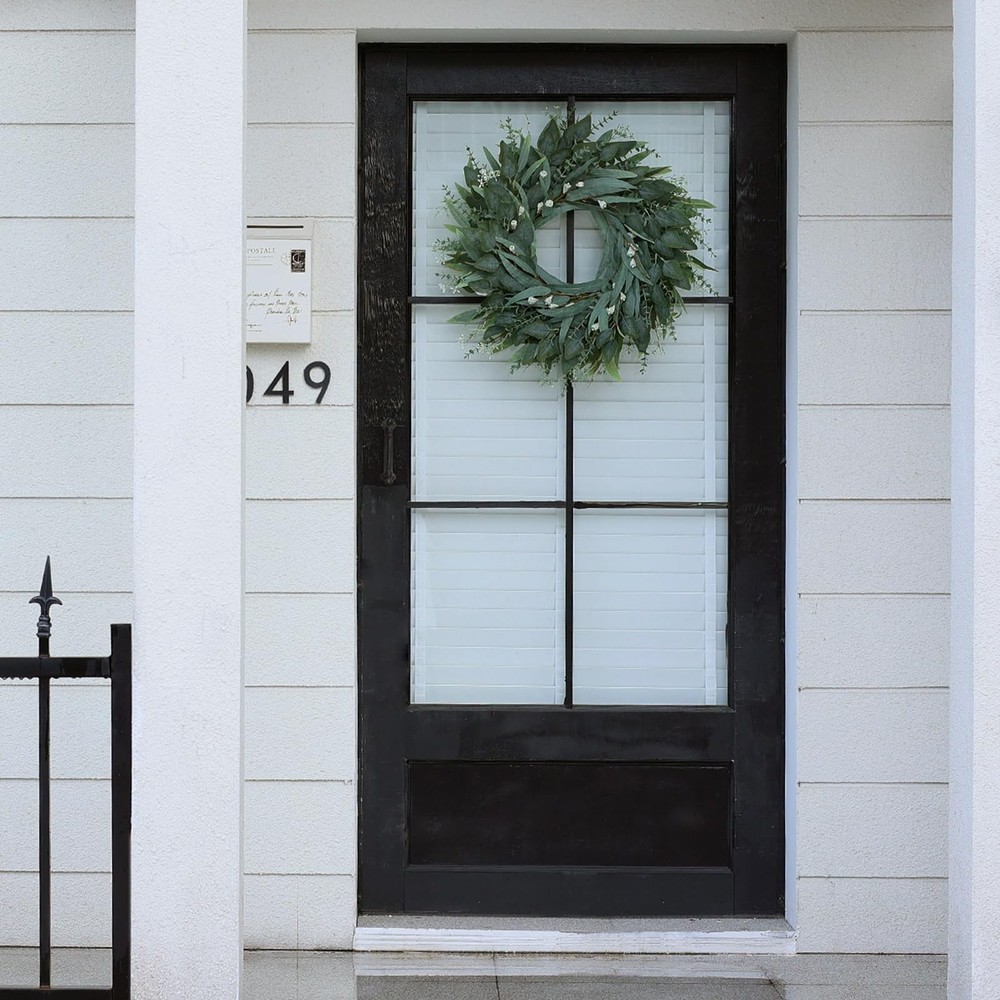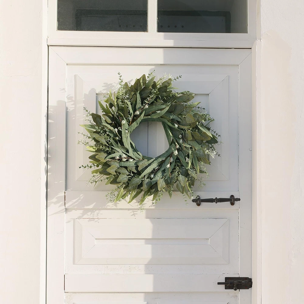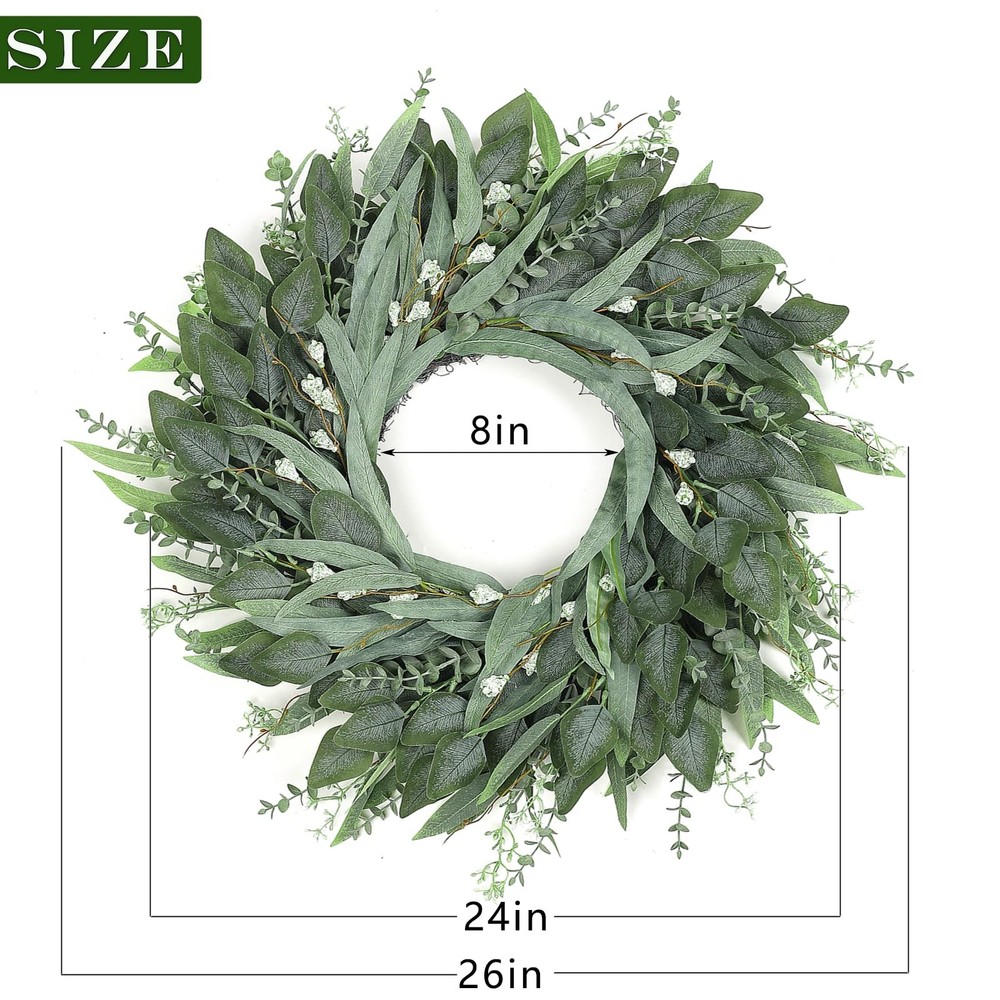 26'' Eucalyptus Wreath for Front Door 【Lifelike wreath】 : This eucalyptus wreath is made of 3 different shapes of high-quality eucalyptus leaves and is also embellished with white eucalyptus fruit and seeds, which makes it look more vibrant and lifelike. 【Quality materials】 : Eucalyptus leaves are made of high-quality silk and plastic, berries are made of high-quality plastic, durable, wind and water resistant and will not fade, suitable for indoor and outdoor decoration. 【Perfect size】 : At 24-26 inches in diameter and up to 26 inches when fully unfolded, this large, vibrant wreath is ideal for most home doors and Windows. 【Versatile】 : The front door wreath can be used for all seasons, whether it is in the hallway, window, fireplace, living room, kitchen, farmhouse, etc., it can effortlessly decorate your home. Perfect for weddings, birthday parties, Easter, Valentine's Day, Mother's Day, Thanksgiving and other holiday decorations. This green wreath will bring a pleasant atmosphere all year round. 【Tips】 : In order to prevent damage during transportation, the wreath is tightly packed in the carton, you only need to easily adjust the stem of the eucalyptus leaf to unfold, to obtain the best appearance, achieve the perfect display.