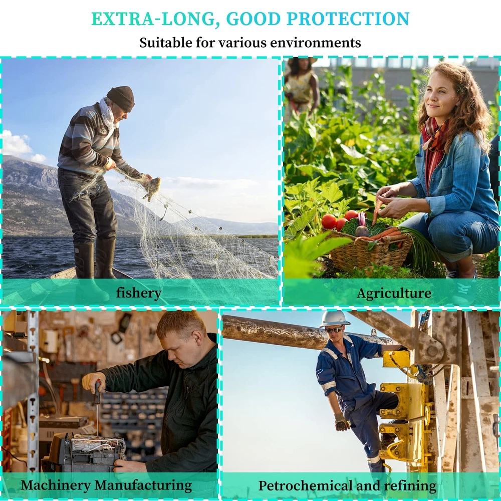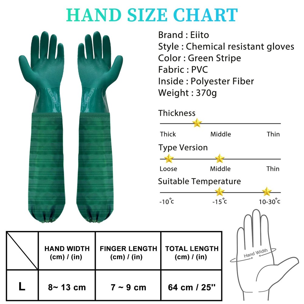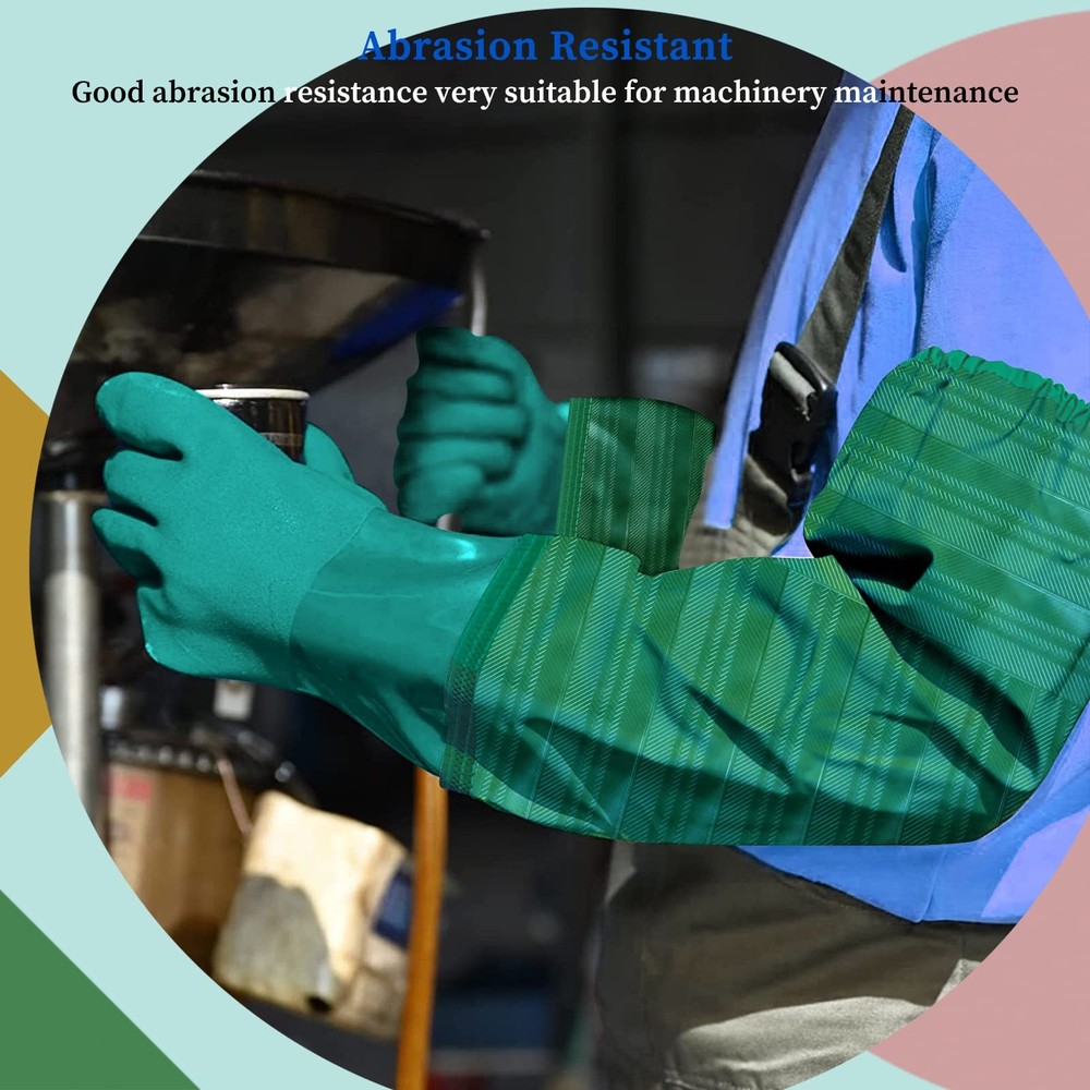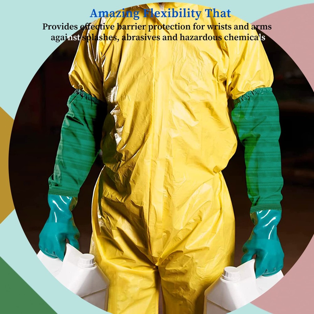 Extra-long 26" Rubber Gloves, Chemical Resistant Gloves PVC Reusable WATERPROOF & ROBUST MATERIAL - The reusable long rubber gloves heavy duty are made of thick PVC with good chemical, mechanical, acidic, and alkaline liquid solvent resistance. These long rubber gloves are anti-aging, and their mechanical strength may be maintained over 90% for 96 hours at 158℉ under continuous operation, promising long-lasting usage without cracking, hardening, oil impregnation, and other degradation. Extended arm pond gloves length of 25.2 inches, and the design of the elastic cuff makes it stick to your arm, not easily falling off. The heavy-duty long sleeve gloves are widely used in the washing process, machine maintenance, aquarium, pond work, garden, courtyard operation, printing and dyeing industry, etc. Long rubber gloves are lined with high-quality seamless cotton for comfort. Keep your hands warm and dry. Provide effective barrier protection for wrist and arm from splashes, abrasives and dangerous chemicals.