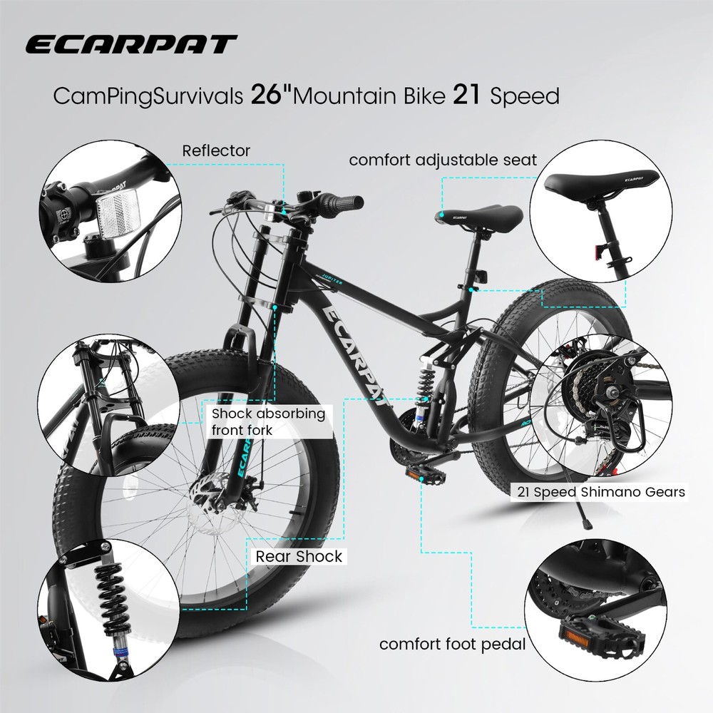 26 inch Mountain Bike,Full-Suspension 21 Speeds Drivetrain Bicycle w/DiscBrake Features 【High Tech Frame】Steel soft tail frame has better strength, stability and toughness, which can better absorb vibration. Compared with aluminum frame, rider is not easy to feel fatigued during riding,enjoys the adventure on mountain roads, forest paths and highways. 【Full Suspension】Full suspension bike has better shock absorption,adapt to more terrains,giving you a more comfortable ride on rough roads and provide a durable riding experience.In addition,Soft tail ensures that the tires are fully gripped to maintain control on descents. 【Professional Drive Train】SHIMANO twist grip shifter is precise and simple to control, a wide range of gears gives you more control for climbing and room to get low on descents, corners and jumps.Internal shift and brake cable make cables last longer by protecting them. 【4 INCH FAT TIRE】Width up to 4 inches, 5 times more wear resistance than ordinary bicycle tires. Strong grip and anti-skid, fully able to challenge any terrain, conquer any off-road trails and urban roads. 【85% assembled】Arrives 85% assembled, all you need to do is install the front wheel, handlebars, saddle and pedals and you're ready to enjoy the ride. We will also provide instructions and an installation video. Description