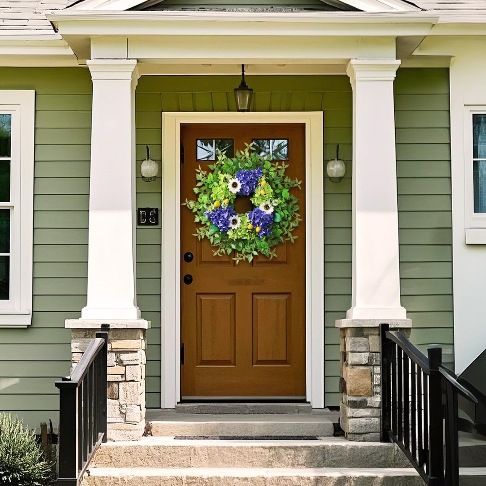 26" Hydrangea Wreath for Front Door, Porch, Window 【Full and Lifelike】 : This is a large wreath made of hydrangea, sunflower, lemon, green leaves and other berry. We used more flowers and leaves to make the wreath large and full and lifelike. 【Quality Material】 : The faux flower and leaves are made of high-quality silk, durable, wind and water resistant, fastness, suitable for indoor and outdoor decoration. 【Size】 : The diameter of the hydrangea wreath is about 24-26 inches, and it can be up to 26 inches in diameter when fully unfolded. This large wreath is very suitable for your front door decoration, it will make your door become atmospheric and beautiful. 【Versatile】: Our hydrangea wreath can be used all seasons, perfect for corridors, Windows, fireplaces, living rooms, kitchens, farmhouses, etc. It can perfectly decorate your home. It can also be used for weddings, birthday parties, Easter, Valentine's Day, Mother's Day, Thanksgiving and other holiday decorations. This hydrangea wreath will bring a pleasant atmosphere to your home. 【Tips】 : In order to better protect the wreath, we put the garland in a plastic bag and then tightly packed in a carton. You only need to easily adjust and fully unfold the stem of the leaves to obtain the best appearance and achieve a perfect display.