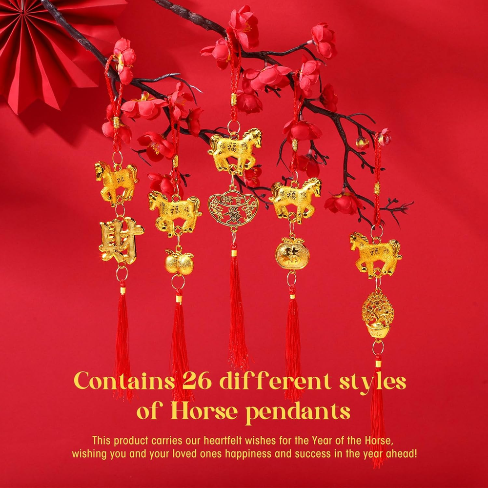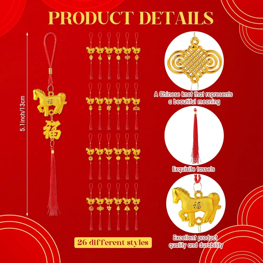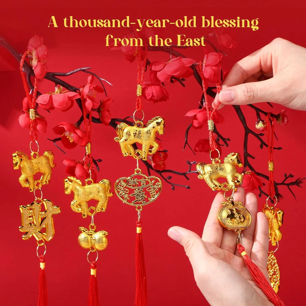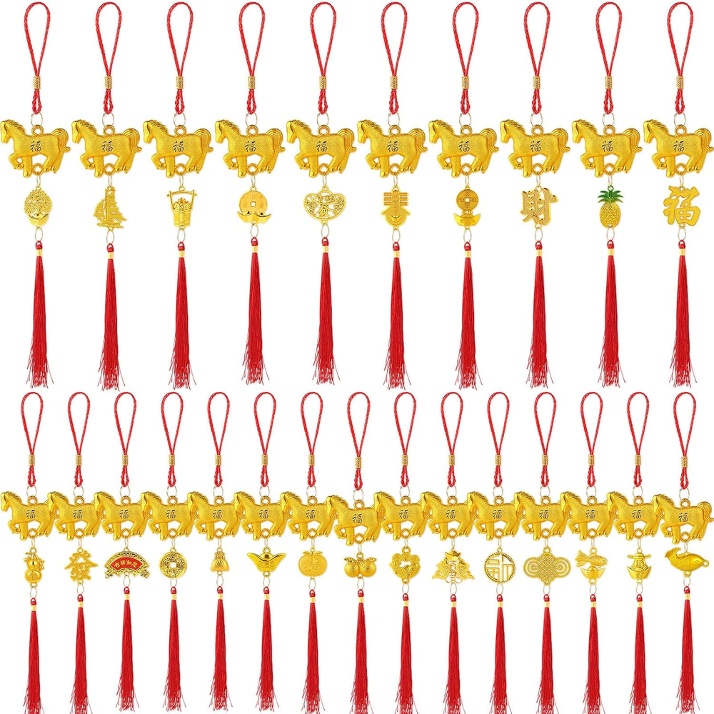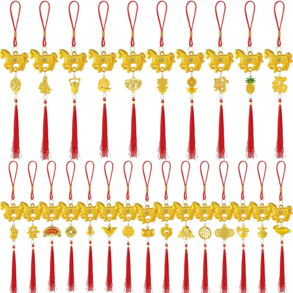 What You Get: this festive set features 26 distinct horse themed New Year good luck ornaments, each symbolizing prolonged blessings and abundant wealth; It conveys your sincerely wishes for dear friends and family, infusing the holiday celebrations with rich cultural charm; The full collection features over twenty distinct ornament styles, carrying sincere wishes for abundance and auspiciousness Auspicious Patterns: each decoration embodies the iconic Chinese New Year symbol - the horse zodiac representing perseverance, the gold ingot symbolizing wealth accumulation, the lucky bag filled with blessings, and the ancient coins attracting prosperity; Gourds guard happiness, kumquats bring sweetness, koi represents good luck, and the round fan engraved with "Congratulations on getting rich" conveys the joy of harvest; Sailing symbolizes the adventurous spirit of daring exploration Quality Materials: these good luck ornaments are crafted from quality plastic with a radiant golden finish, instantly enhancing the festive atmosphere; The tassels, made from polyester, offer vibrant and eye catching decorations that carry deep traditional blessings Suitable Size: each New Year fortune ornament measures 12.2 inches to 11.8 inches in length and 1.8 inches in width, making them ideal for hanging on doorways, walls, or as tree decorations; Their size is thoughtfully designed to create an eye-catching yet unobtrusive visual appeal, seamlessly integrating into various spaces; These ornaments carry auspicious blessings, perpetuating the tradition of spreading good fortune and festive joy Exceptional Decorative Appeal: this set of ornaments captures the traditional essence and auspicious symbolism of the Lunar New Year; Each piece embodies wishes for prosperity, wisdom, health, and joy, perfectly reflecting the festive spirit of this important celebration; Adorn your home with lucky symbols such as gold ingots and five-fu calabashes that attract good fortune, transforming your space into a warm and welcoming sanctuary filled with positive energy Features: Ideal for family gatherings or enhancing any room, these exquisite decorations create a rich, celebratory atmosphere brimming with abundance and cheer, spreading positivity throughout your home. Crafted from quality materials, these Chinese New Year decorations are designed to create a strong festive atmosphere and convey positive energy throughout your celebrations. The package includes everything you need to transform your space, ensuring every corner radiates joy and prosperity. Suitable for enhancing both small and large gatherings, these decorations effortlessly blend tradition with vibrant style, offering a touch of authenticity to your festive decor. Specifications: Material: plastic, polyester Color: gold, red Size: 12.2 inches to 11.8 inches in length, 1.8 inches in width Package includes: 26 x Chinese new year decorations Notes: Manual measurement, please allow slight errors on size. The color may exist a slight difference due to different screen displays