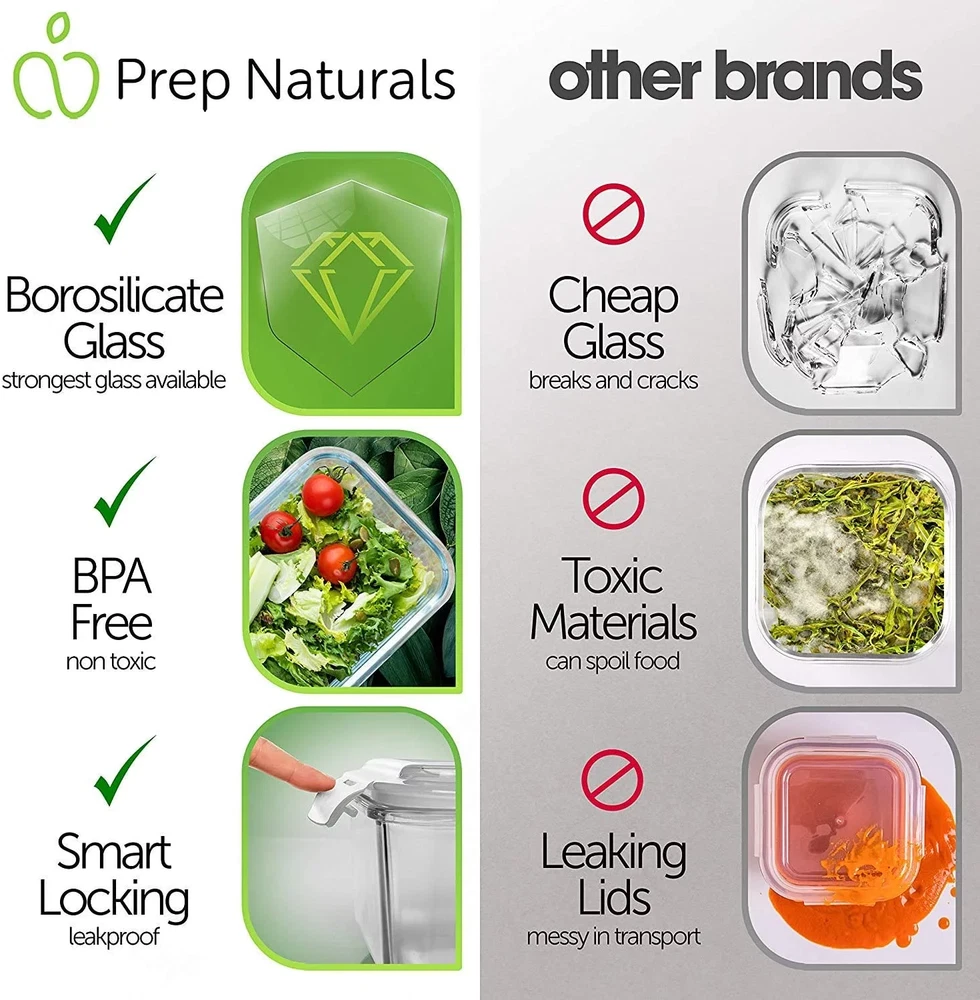 When it comes to style and functionality, Prep Naturals Kitchen Bowl Containers for Meal Prep stand in a class of their own. Specially made for those who don’t settle for less than the best, the glass containers for food storage with lids combine the beauty of a simple design with the versatility of multi-shaped thermo-resistant glass containers. With 3 different shapes and 13 sizes, these thermos-resistant glass containers set can be used for food storage, oven cooking, eating-on-the-go, office lunches, picnics, camping, and the list may continue. This glass food storage container - out of all meal containers - is perfect for you! Save time and money ⌚ Whether you want to save time and money or just prefer home cooking over fast food, Prep Naturals glass food storage containers set is perfect for you. Durable and easy to use, these glass containers encourage you to cook at home and eat healthier food. Prep Meals at Home, then Eat it on the Go 🍴 make a lunch box with home-cooked food for the whole family and bring it to work or gym. You can cook your food right in the containers then save and reheat the leftovers. Good Alternative to Plastic 💚 Our Containers Are Made From Borosilicate Glass, Which Makes Them Much Stronger Than Other Cheaper Containers. Borosilicate is The Strongest Glass Available, Oven Safe and Won’t Break as Easily as Cheaper Alternatives. Microwave, oven, dishwasher and freezer safe ☑️ warming, freezing or cooking your food in the oven is a breeze with this thermo-resistant set of glass food containers! Built to withstand temperatures up to 840F, Prep Naturals oven safe glass containers with lids are both durable and easy to use! Premium look and design ✔️ If function and style are what you’re after, Prep Naturals glass food storage containers with lids set is hard to beat. The beautiful finishing and design of the glass meal containers make them perfect for gym, picnics, office lunches. 3 different shapes and 13 sizes 🔝 1x 5.7 Ounce 1x 6.3 Ounce 1x 7.3 Ounce 1x 10.5 Ounce 1x 12.5 Ounce 1x 13 Ounce 1x 18 Ounce 1x 21.3 Ounce 1x 22 Ounce 1x 27 Ounce 1x 33 Ounce 1x 35.2 Ounce 1x 51 Ounce Customer Service - Please, if you have any questions or issues regarding the Glass Food Storage Containers please do not hesitate to send us a message and we will respond within 24 hours.
