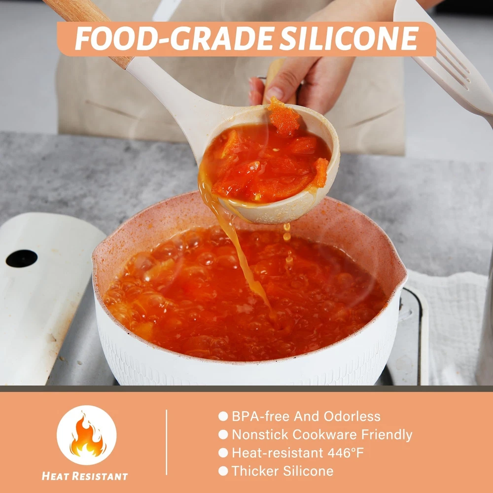 26 PCS KITCHEN UTENSILS SET: We have carefully considered most of the scenarios in which kitchens are used and have handpicked 26 different kitchen cooking utensils set to meet all your cooking needs to cook the perfect dish. Kitchen tongs and spatula set, measuring cups and spoons set, pasta server, solid and slotted turners, skimmer, basting brush, utensil holder, etc. Each piece of silicone utensils for cooking is upgraded to a large size with a perfectly balanced weight and elegant design FOOD GRADE SILICONE COOKING UTENSILS SET: The cooking utensils set is made entirely of odorless food-grade silicone, which is BPA-free and has good scratch resistance to protect the non-stick coating on the cookware and ensure that the cookware surface is not scratched or dented. The silicone kitchen utensils does not react with food or beverages and will not retain odors or colors, you don’t have to worry about the health of your families. And the upgraded silicone thickness for better quality and durability DURABLE & HEAT-RESISTANCE: The kitchen utensils features durable silicone utensil head and ergonomic wooden handle that offer a comfortable grip and heat resistant. This design feature makes cooking more enjoyable and less strenuous on the hands, especially during longer meal preparations. And the silicone kitchen utensils can withstand temperatures up to 446°F/230°C, and they won't melt when stirring food directly in the pan EASY TO CLEAN AND STORE: The higher and stronger welded joints between the silicone cooking utensils and wooden handles eliminate any gaps where food can get trapped, making cleaning a breeze. Simply rinse gently with water. Due to the wooden handle, we don't recommend soaking in water for a long time or dishwasher cleaning. The kitchen cooking utensils set feature hanging holes on the handles to let you hang these to store them without taking much space. The cooking utensils set also come with a holder for storage GREAT KITCHEN TOOLS: Each piece of kitchen utensils offers a perfectly balanced weight and elegant design that will enhance your kitchen decor. From baking and frying to sautéing and grilling, these cooking utensils have proven their worth in various culinary endeavors. The exquisite packaging and reasonable price make it the ideal housewarming gifts wedding gifts, birthday gifts, Christmas gifts, etc. If you have any questions during the purchase or use, please feel free to contact us, we will be happy to help you