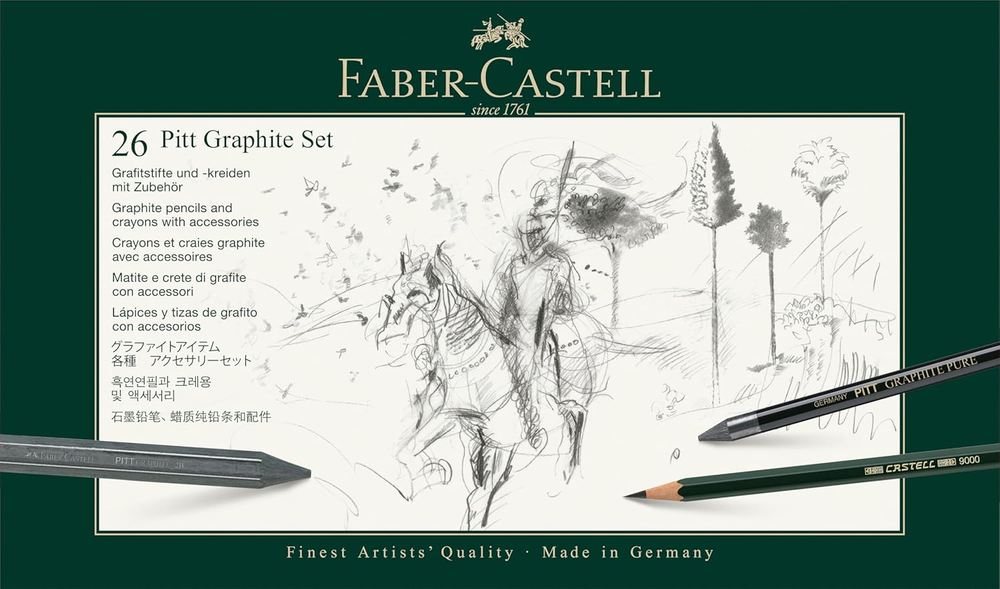 Store New Arrivals Add to Favorite View Feedback Contact 26 Piece Pitt Graphite Tin Set Description Item model number 112974 Item Weight 1.3 pounds Writing Instrument Form Graphite Pencil Color Grey Product Dimensions 7.87 x 12.8 x 1.18 inches Ink Color Gray Age Range (Description) Adult Is Discontinued By Manufacturer No What is it? Faber Castell Pitt 26 piece Graphite Set Why use them? Designed for the true art lover, experienced or learning!! This set will inspire all to start drawing, sketching and painting! The Set Faber-Castell's PITT Graphic range provides all creative artists with an extensive range of pencils and crayons in different grades of hardness for sketching, graphic design and shading work. From shades of grey to a work of art!! The PITT Graphite Pure leads are ideal for creating contrasts and shading extended areas. These pencils offer unparalleled possibilities for spontaneous expression, creating different effects based on the pressure applied and grade of hardness. The PITT graphite crayons are an ideal and very economical medium for working on very large sketches and areas. Where is it made? Made in Germany What is in the box? 7 x Castell 9000 graphite pencils (2H, 2B, B, HB, 4B, 6B, 8B) 3 x Castell 9000 Jumbo graphite pencils (2B, 4B, 8B) 3 x Graphite Aquarelle pencils, water-soluble (2B, 4B, 8B) 3 x Pitt graphite Pure pencils (3B, 6B, 9B) 3 x Pitt graphite crayons (6B, 9B) 1 x Perfection eraser pencil 1 x Plastic eraser 1 x Kneadable art eraser 1 x Dual sharpener 1 x Blending stump 1 x Sandpaper block 1 x Paintbrush Faber Castel-Pitt Graphite Tin Set. Graphite Pencils And Crayons With Accessories Is The Ideal Collection For Artist Quality Sketching. This Package Contains Seven Castell 9000 Graphite Pencils (2H, Hb, B, 2B, 4B, 6B And 8B), Three Castell 9000 Jumbo Graphite Pencils (2B, 4B And 8B), Three Graphite Aquarelle Water- Soluble Pencils (2B, 4B And 8B), Three Pitt Graphite Pure Pencils (3B, 6B And 9B), Three Pitt Graphite Crayons (2B, 6B And 9B), One Perfection Eraser Pencil, One Plastic Eraser, One Kneadable Art Eraser, One Dual Sharpener, One Sandpaper Block, One Paintbrush And One Blending Stump Within One 7-1/4X12-1/2X3/4 Inch Tin Case. Conforms To Astm D-4236. Imported. ABOUT US We offer the best prices around on high quality products. Our E-store includes media such as books, movies, music and games while offering electronics, toys, sporting apparel, clothing, tools, general home, garden items and more. SHIPPING We are always working hard to ensure your package arrives as soon as possible. Please understand that some factors like weather, high postal traffic, and the performance of shipping companies are outside of our control. We offer free shipping to the lower 48 states and ship within 2 business days of payment, usually sooner. We do not accept P.O. Boxes. Please provide a physical address. RETURNS We offer a 30-Day Return Policy on items which you are not completely satisfied with. You have the option for a full-refund or an exchange of the item. No returns are available on items shipped outside of the USA. PAYMENT We accept PayPal. CONTACT US This page content is yet to come Please ad us to your favorite seller and visit again later Thank You CUSTOMER SATISFACTION We try our very best to make sure every customer is completely satisfied. If there's a problem, message us! We're happy to help.