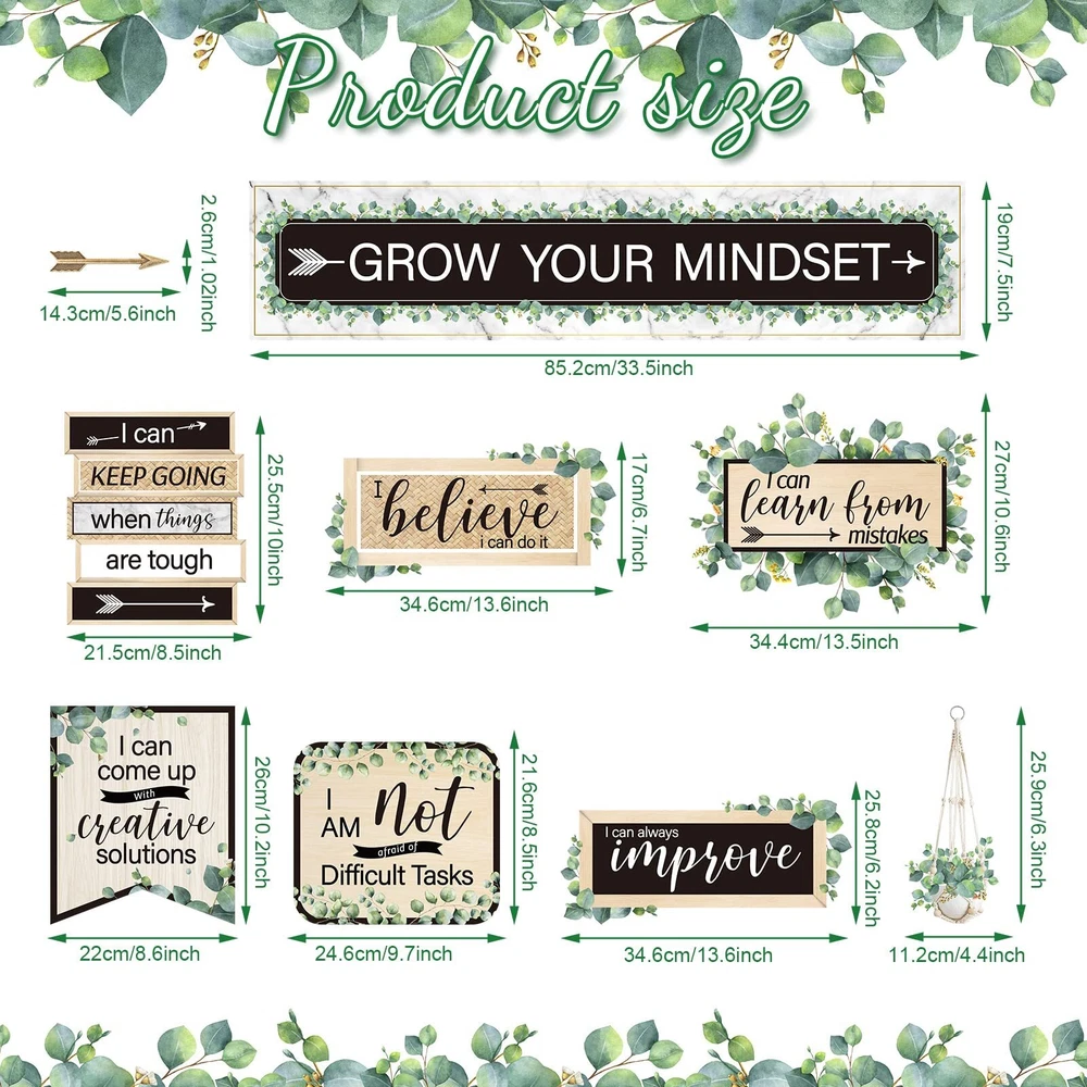 Feature:Interesting and eye catching:The grow your mindset mini bulletin boards are designed with colorful words and pictures, come with eucalyptus adorable design, very interesting and bright, the text can help to enhance the learning experience.Wide applications:These positive wall art prints are suitable for wall decorations, party pendants and photo props, pasting to anywhere you like to decorate your room, bring color and life into your room.Specifications:Material: 250 gsm cardstockSize: as pictures shownPackage includes :4 x Adhesive dots26 x Growth mindset postersWarm notes:Please allow slight size errors due to manual measurement.The colors may be slightly different from pictures due to different screens. Package Includes: 26 pieces different growth mindset posters with 4 pieces glue points dots, includes 'GROW YOUR MINDSET'; The growth mindset poster for classroom is a great way to remind them to put mindsets in check every once in a while Eucalyptus Style Design: these motivational bulletin board sets decorations are designed with eucalyptus, colorful and very novel, these pictures help children increase their curiosity about the world and stimulate positive attitude, appearance and creative imagination Help Foster A Growth Mindset: these classroom posters contain 17 positive attitudes, can be the uplifting teacher remember for the whole life, positive growth mindset posters inspire little minds to dream big, give your little learners the encouragement, they need and set them up for life success Quality and Suitable Size: these positive posters for classroom are made of 250 gsm cardstock, covered with quality PET film for added waterproof, tear resistant and reusable. the bulletin board's maximum size is 13.4 inch, minimum size is 10.2 inch, suitable size of motivational posters decorations are nice for preschool, elementary, middle and high school Easy Way to Mount: the elementary classroom poster pack has no sticky, extra glue point dots are offered which comes with package, so you can easily apply these positive accents on the wall; When you have to move something, it's able to gently pull it off of the wall without messing up wall paint or poster