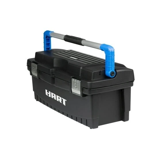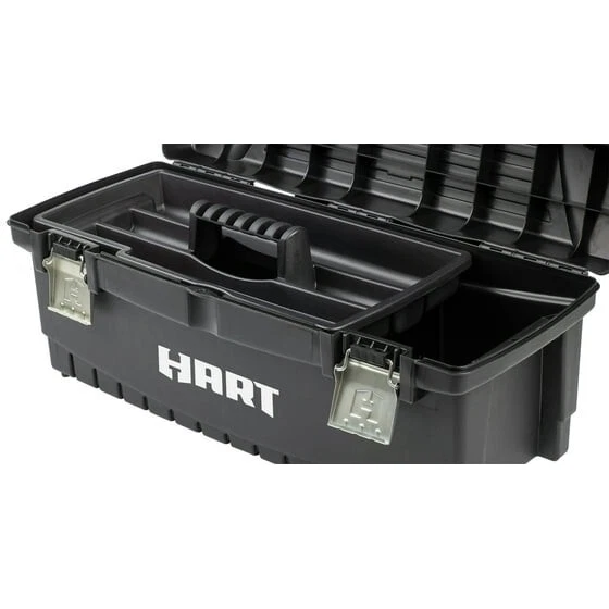 The HART 26 Inch Toolbox delivers large capacity and portable storage for your tools and hardware. This lightweight box is ready to make your life easier with reliable tool storage. Metal latches provide a secure closure and a wide handle keeps this box in your hands.The deep storage compartment and a removable tray which add an extra layer of organization. The HART 26" Toolbox gives you a simple style that's perfect for personal or professional use. The HART 26" Toolbox is made from resin, meaning it won't chip, scratch, or rot. Made to withstand both heat and cold, this rugged box can be used in just about any weather conditions. HART 26" Toolbox, Resin Tool Storage and Organization, Black with Blue Accents Perfect for professionals, hobbyists, and DIY-ers alike Rugged polypropylene resin construction is weather resistant and reliable A sturdy resin carrying handle for easy transportation; folds down when not in use Two lid compartments to hold small tools and parts A removable utility tray to access the spacious bottom storage compartment Two sturdy metal latches keep your items secure The metal latch on back keeps the lid from falling shut while you work Durability and longevity makes this a must have for any garage, job site, craft room, and more Pad Lockable (lock not included)