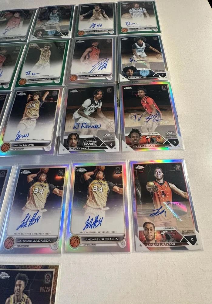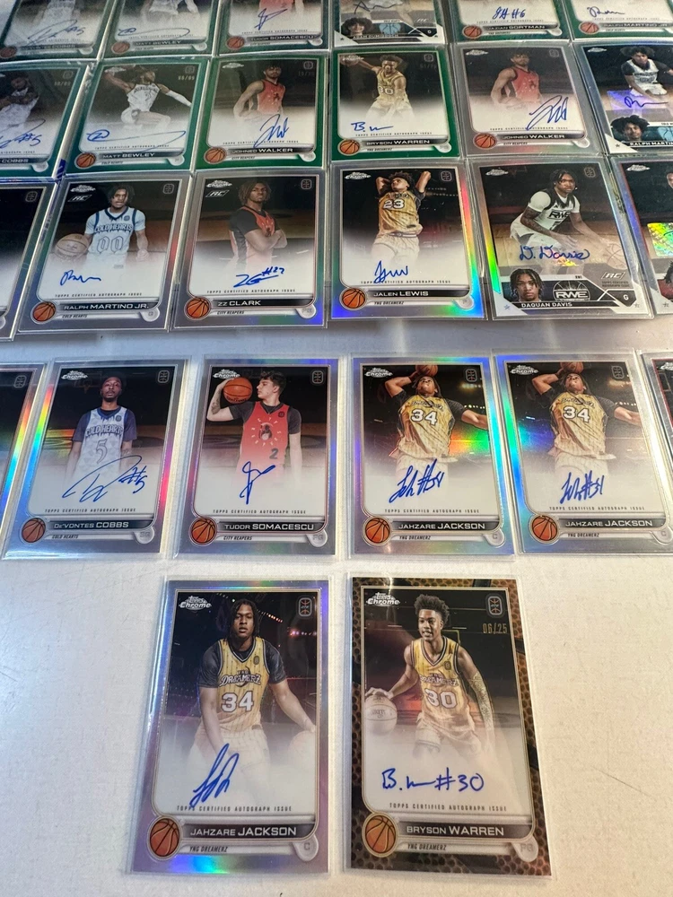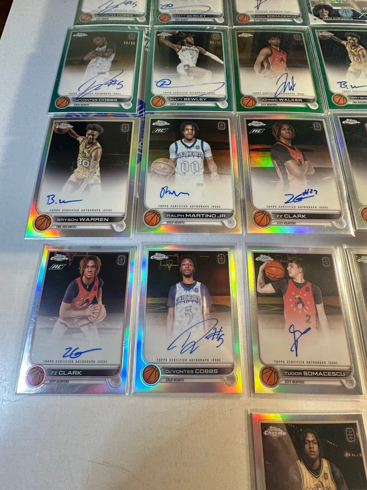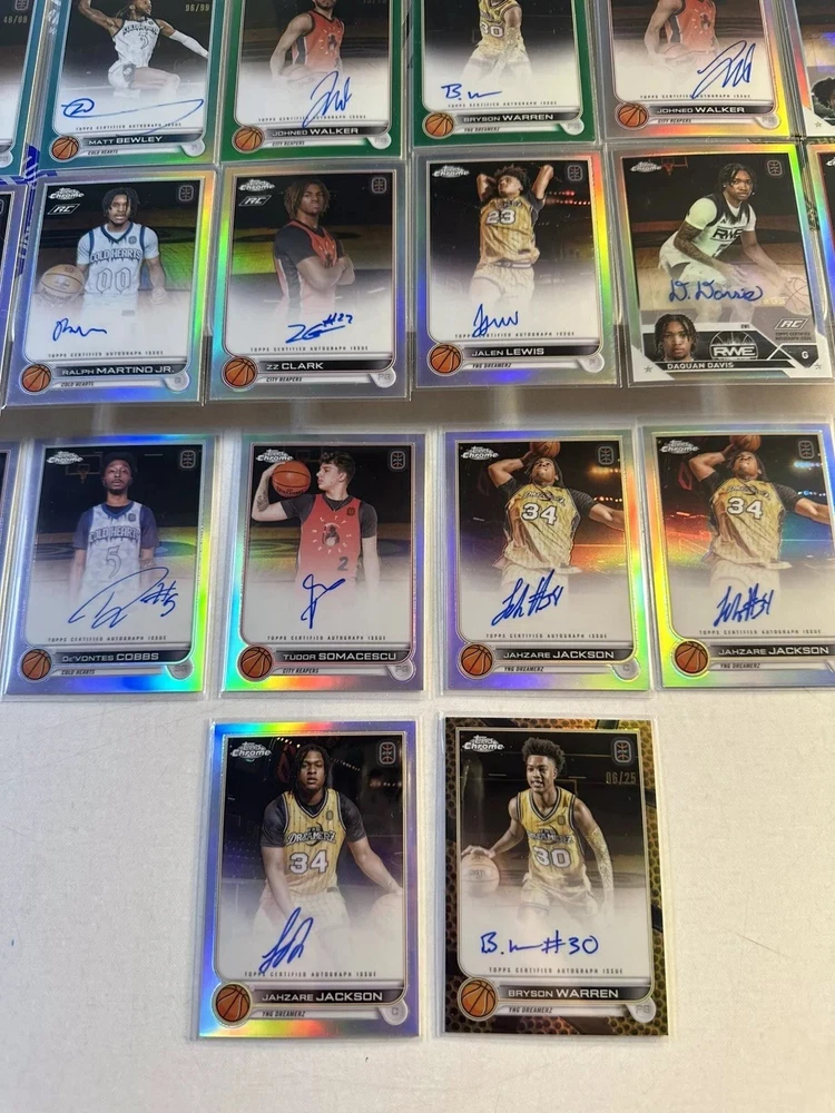 2022-24 TOPPS CHROME ote Autographs 1 - /25 orange basketball Bryson warren 3x - #/75 green Ralph martino johned walker Bryson warren 2x - Aqua /99 devonte cobbs matt Bewley 5x - aqua ote /99 Devonte cobbs matt Bewley tudor somacescu jazian gortman adam oumiddoch 15x Silver non numbered – zz clark (2), devontes cobbs, tudor somacesco, jahzare Jackson (4x), tyler Jackson, ralph martino (2x), johned walker, daquan davis, Jalen lewis, Bryson warren