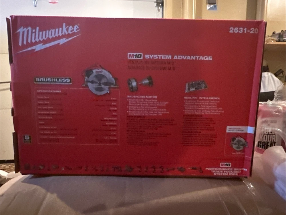 The M18 Brushless 7-1/4 in. Circular Saw delivers up to 40% more power than circular saws with brushed motors while providing up to 30% more run-time as well. The Milwaukee built motor, REDLINK electronics and REDLITHIUM XC5.0 battery provide more efficient power delivery, more power and fewer trips to the charger. With 5,000 RPM that 2631 provides smooth cutting and at only 9.0 lbs. It is lighter than most corded saws. The saw also features an integrated rafter hook, magnesium guards, an aluminum shoe and LED light. Highlights Up to 40% more power than brushed circular saws Up to 30% more run-time than circular brushed saws More durable than brushed circular saw Magnesium upper and lower guards for increased durability Milwaukee brushless motor: optimized for efficiency, this motor delivers over 30% more run-time and longer life than brushed motors, delivering 5,000 RPM for smooth, powerful cutting Redlink intelligence: advanced overload protection defends against abusive applications and monitors the temperature to prevent damage and ensure maximum tool and battery life Integrated folding rafter hook for easy storage 2-1/2 in. cut depth LED light for greater cutline visibility in low light situations Includes: M18 brushless 7-1/4 in. circular saw, blade and wrench
