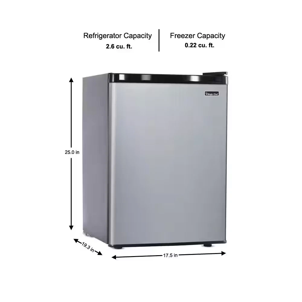 Fast Shipping On All Items 30 Days Money Guarantee Customer Support Excellent Service 100% Satisfaction Satisfaction Guaranteed 2.6Cu-ft Reversible Door Compact Storage,Home Mini Fridge In Stainless Look Specification Appliance Category Refrigerator Appliance Series Not Applicable Appliance Type Compact Refrigerator Color - Appliance Cabinet Black Color - Door Handle(s) Black Color/Finish Stainless Look Color/Finish Family Stainless Look Defrost Type Manual Energy Efficiency Tier Rating Not CEE rated Freezer Capacity (cu ft) 0.2 cu ft Freezer Features No Additional Features Freezer Type Compact-in Fridge General Features No Additional Features Hardware Color/Finish Stainless look Hardware Color/Finish Family Stainless Look Ice Maker Features No Ice Maker Indoor/Outdoor Indoor Installation Depth Counter Depth Number of Doors 1 Door Number of Freezer Baskets/Bins No Baskets/Bins Number of Freezer Shelves No Shelves Number of Refrigerator Shelves 2 Shelves Operational Features Dial Temperature Control Product Weight (lb) 41.9 lb Refrigeration Dispenser Features No Dispenser Refrigerator Capacity (cu ft) 2.6 cu ft Returnable 90-Day Shelf Material - Refrigerator Glass Storage Features Can Dispenser,Removable Shelves Temperature Control Type Internal Analog Total Capacity (cu ft) 2.6 cu ft Water Filter Replacement Model# Not Applicable Certifications and Listings cUL Listed Manufacturer Warranty 1 Year Parts and Labor, 5 Years Compressor (parts only) Depth (Excluding Handles) (in) 19.3 Depth (Including Handles) (in) 19.3 in Depth (Less Door) (in) 18.1 Depth With Door Open 90 Degrees (in) 43.2 Height to Top of Door Hinge (in) 25 in Height to Top of Refrigerator Case (in) 25 in Product Depth (in) 19.3 Product Height (in) 25 Product Width (in) 17.5 Refrigerator Width (in) 17.5 in 17.5 inches x 19.3 inches x 25.0 inches. Weight: 41.9 lb Item Description Upfront adjustable thermostat control Two glass shelves ensure easy organization and cleaning Freezer compartment stores smaller frozen food items Whether you're college-bound or simply want a little extra refrigerator space in your home, this Magic Chef 2.6 cu. ft. Mini Refrigerator has the storage options you're looking for. A can dispenser conveniently keeps soda in the door while additional door shelves provide space for frequently used items. Glass refrigerator shelves are Easy-to-clean. ENERGY STAR Qualified - meets or exceeds federal guidelines for energy efficiency, which means year-round energy savings Upfront Adjustable thermostat control allows you to quickly modify the interior temperature if needed Glass refrigerator shelves provide for easy organization and cleaning Can dispenser in door lets you grab your cans with ease Nearly 2.6 cu. ft. compact refrigerator is 17.5 in. W x 19.3 in. D x 25.0 in. H and is a great fit for smaller spaces Freezer compartment allows for freezing your smaller convenience frozen food items Mini-refrigerator is manual defrost Reversible door allows you to place according to your space requirement Flush back for easy placement Warranty is 1 Year Parts and Labor; 5 Years Compressor (Carry-in Service) This item does not qualify for the Major Appliance Delivery and Haul Away or Installation Services About us We offer the best prices around on high quality products. Our E-store includes media such as books, movies, music and games while offering electronics, toys, sporting apparel, clothing, tools, general home, garden items and more. Shipping We are always working hard to ensure your package arrives as soon as possible. Please understand that some factors like weather, high postal traffic, and the performance of shipping companies are outside of our control. We offer free shipping to the lower 48 states and ship within 2-3 business days of payment, usually sooner. We do not accept P.O. Boxes. Please provide a physical address. For shipping outside of the continental USA, we only use eBay's Global Shipping Program.The item is shipped to KY and then sent to the rest of the world. International customers are responsible for all duties and taxes. Continue to check out to calculate costs for shipping the item to your country. Messages regarding eBay's Global Shipping Program MUST be directed at eBay EXCLUSIVELY. Returns We offer a 30-Day Return Policy on items in which you are not completely satisfied with. You have the option of a full-refund or an exchange of the item. No returns are available on items shipped outside of the USA Satisfaction We try over very best to make sure every customer is completely satisfied. If there's a problem, message us! We're happy to help. Payment Options Shop With Confidence