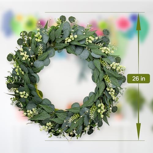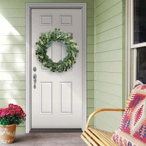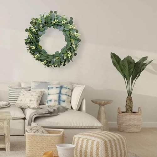 Vivid and Lifelike Green Eucalyptus Wreath Enhance your home decor with this stunning 26-inch handcrafted greenery wreath, featuring: Vibrant Design: Two types of eucalyptus leaves with clear veins and natural colors, paired with white berry clusters for a lively touch. Full Shape & Distinct Layers: A full circular design with well-arranged leaves and distinct layers, creating a lively natural picture. Silk Leaves, Soft to the Touch: Made from high-quality silk material, these leaves offer a delicate and soft touch for a pleasant sensory experience. Sturdy and Durable: An iron base ring ensures durability and maintains its beautiful shape over time. Versatile Decoration: Perfect for doors, walls, dining tables, or coffee tables, adding a natural atmosphere and artistic beauty to any space. Experience the perfect fusion of nature and art with this versatile spring and summer wreath!