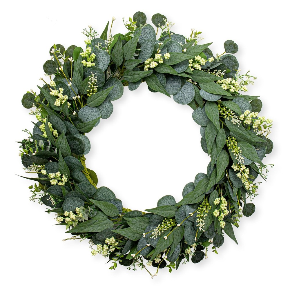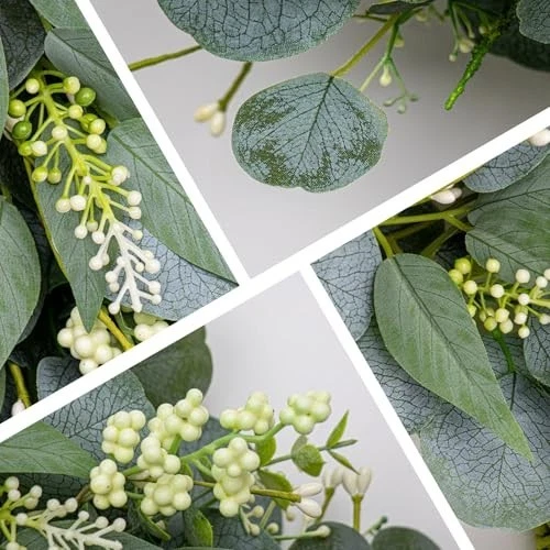 This gorgeous wreath instantly elevates any space with its lifelike eucalyptus leaves and delicate white berries. The rich green colors and natural textures look so real, and the full, layered design adds depth and elegance. Perfect for year-round decor, it’s soft to the touch yet durable—no watering needed! Arrived ready to hang, and the quality exceeded my expectations. A stunning addition to doors, walls, or mantels!
