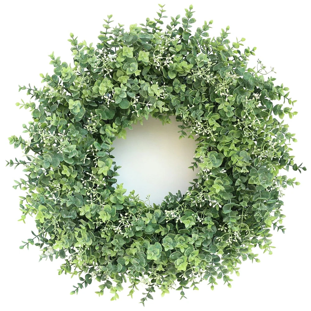 26'' Eucalyptus Wreath for Front Door 【Lifelike wreath】 : This eucalyptus wreath is made of high-quality eucalyptus leaves and is also embellished with white seeds, which makes it look more vibrant and lifelike. 【Quality materials】 : Eucalyptus leaves are made of high-quality plastic, durable, wind and water resistant and will not fade, suitable for indoor and outdoor decoration. 【Perfect size】 : At 24-26 inches in diameter and up to 26 inches when fully unfolded, this large, vibrant wreath is ideal for most home doors and Windows. 【Versatile】 : The front door wreath can be used for all seasons, whether it is in the hallway, window, fireplace, living room, kitchen, farmhouse, etc., it can effortlessly decorate your home. Perfect for weddings, birthday parties, Easter, Valentine's Day, Mother's Day, Thanksgiving and other holiday decorations. This green wreath will bring a pleasant atmosphere all year round. 【Tips】 : In order to prevent damage during transportation, the wreath is tightly packed in the carton, you only need to easily adjust the stem of the eucalyptus leaf to unfold, to obtain the best appearance, achieve the perfect display.