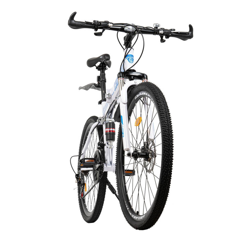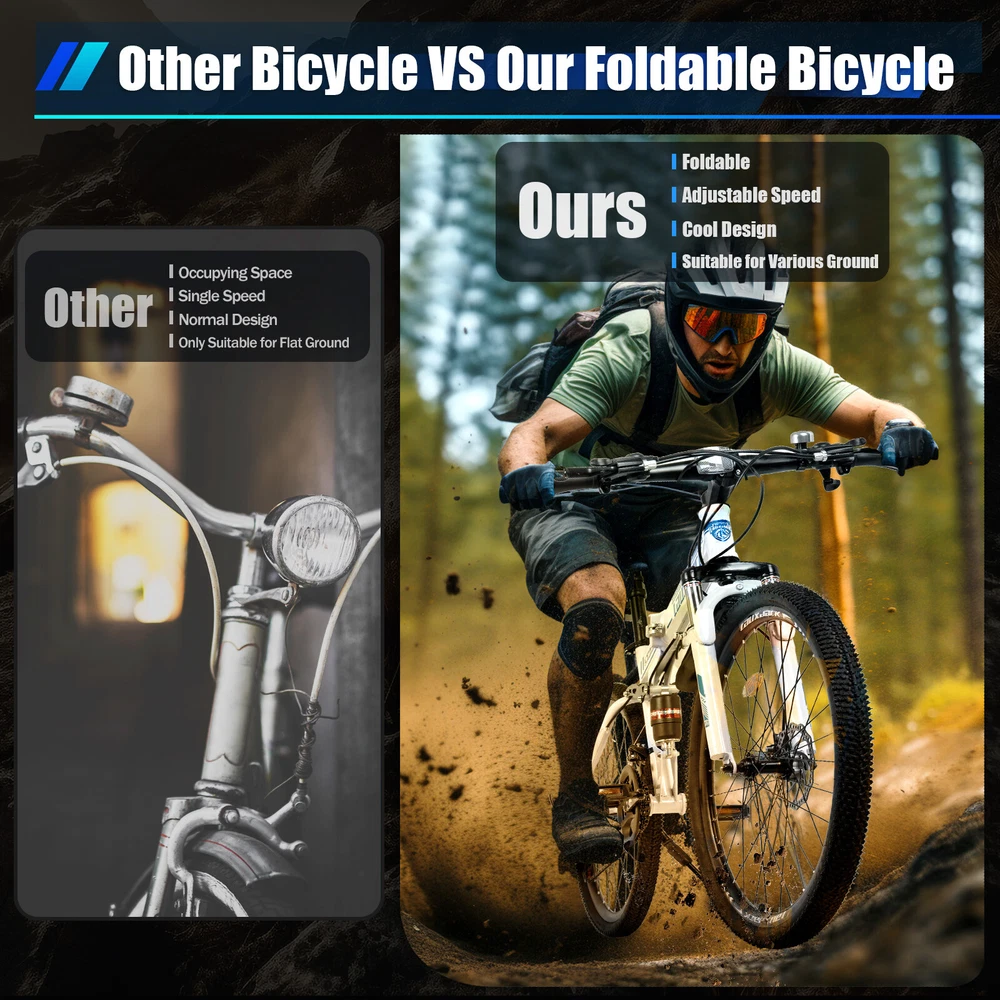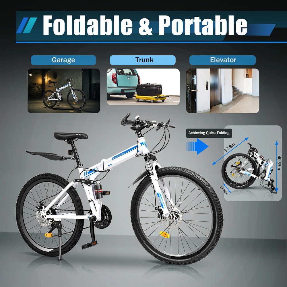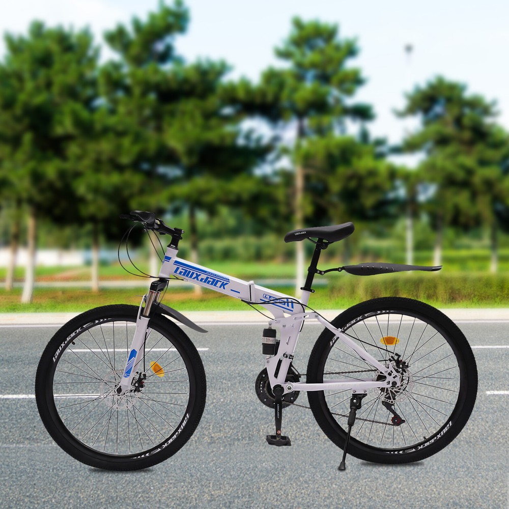 Specification Color: Blue, White Material: Carbon Steel Surface Treatment: Electrostatic Baking Paint Whether to Fold: Yes Frame Structure: Folding Car Frame Type: Hard Frame Pedal Type: Normal Pedals Front Fork Type: Spring Fork (Low Gear Without Damping) Brake Type: Front and Rear Mechanical Disc Brakes Braking System: Hydraulic Disc Brake (Hydraulic Brake Pad), Wire Pull Disc Brake (Finger Force Brake) Propulsion Mode: Chain Applicable Gender: Universal Load Capacity: 120kg/ 264.55lbs Bike Length: 172cm/ 67.71in Distance Between Handlebar and Ground: 106cm/ 63in Wheel Diameter: 65cm/ 25.6in Saddle to Ground Distance: 80-95cm/ 31.5-37.4in Folded Size: 95*35*100cm/ 37.4*13.77*39.37in Package Size: 135*72*19cm/ 53.15*28.35*7.48in Net Weight: 21kg/ 46.3lbs ✨✨✨ Welcome to my store! Have a nice day~ ✨✨✨ Description Do You Want to Make Traveling More Environmentally Friendly, Healthier, and More Convenient? Then This 26" Mountain Folding Bike with 21-Speed Gears Is for You. It Allows You to Enjoy Eco-friendly and Safe Travel While Increasing Your Exercise. Imagine, on a Rest Day, Cycling Around with Three or Two Friends, Isn't It a Good Way to Soothe Your Tired Body and Mind and Enhance Your Physical Fitness? Key Features Healthy Living: Compared to Traveling by Car, Cycling Can Help You Exercise. It Not Only Helps You to Strengthen Your Muscles and Bones but Also Helps You to Lose Weight Effectively and Have a Healthy Body! Environment Friendly: Traveling by Bike Does Not Require Fuel or Gasoline and Does Not Produce Harmful Gases During the Ride, Making It an Environmentally Friendly Way to Travel. in Other Words, It Also Does Not Incur Additional Costs and Is Economical and Affordable. 21-Speed Bike: Its Main Wheel Has 3 Discs and the Driven Wheel Has 7 Discs, You Can Choose to Hang on Different Discs of the Main and Driven Wheels to Get 21 Different Speeds to Facilitate Your Ride. Precision Shifting: It Has a Precision Shifting Front and Rear Chainstay That Gives You Precise Shifting for Different Terrain. the Precision 21-Speed Mountain Bike Gives You a Smooth Shifting Experience. Strong Load-bearing Capacity: Its Triangular Frame Design and Thickened and Thickened Tube Type Make It Have a Good Weight-bearing Capacity of 120kg/ 264.55lbs. Adjustable Saddle Height: Its Saddle Can Be Adjusted Between 80-95cm/ 31.5-37.4in, so You Can Adjust the Height According to Your Comfort. Good Damping Effect: Its Shock-absorbing Frame and U-shaped Shock-absorbing Fork Give It a Stronger Damping Effect, Which Can Effectively Relieve the Pressure on Your Hands and Shoulders Caused by Intense Riding. Safe Riding: It Is Designed with Double Disc Brakes, Which Can Make the Brakes More Sensitive and Smooth, Allowing You to Enjoy Riding a Safe Ride. Comfortable Riding: It Has an Ergonomically Designed Saddle and Handlebars, so You Can Ride Easily. the Comfortable Saddle with Foam Will Keep You Feeling Comfortable Even After Long Hours of Use. Space-saving: When Folded, Its Size Is Only 37.4*13.77*39.37in, You Can Fold It up and Put It in the Garage, Trunk, Etc. to save Space When You Are Not Using It. Durable Material: It Is Made of Thickened High Carbon Steel Material, Which Has Strong Corrosion Resistance and Load-bearing Capacity, Making It Very Stable to Ride and Not Easy to Damage at the Same Time. Ideal Gift: the Blue and White Color Scheme Makes It Vibrant, Making It a Fashionable Piece and an Ideal Gift for Friends, Kids, and Family on Occasions Such As Birthdays, Christmas, Thanksgiving, Graduation, and School Advancement. Customer Service: We Aim to Provide Quality Products and Services. If You Have Any Problems, Please Feel Free to Contact Us. We Will Reply and Solve the Problem for You As Soon As Possible. Details Variable Speed Positioning Chain: It Uses a Variable Speed Positioning Chain, Which Is Not Easy to Drop the Chain During the Ride and Can Make the Gear Shift More Sensitive. Lockable Fork: You Can Choose to Lock the Fork or Not Depending on the Road Conditions. the Locked State Is Suitable for Smooth Roads or Uphill and Downhill. the Non-locked State Is Suitable for Outdoor Bumpy Roads Such As Off-road. Folding Clip : It Comes with an Aluminum Folding Clip, Strong and Durable, but Also Convenient for You to Quickly Fold It. Large Footrest: Its Footrest Is Made of Pc Environmental Protection Material and Enlarged Design, so That You Feel Good Pedaling While Not Easy to Wear and Tear and Can Be Used for a Long Time. Electrostatic Baking Paint: Its Surface Uses Electrostatic Baking Paint Technology, Making It More Beautiful While Also Enhancing Its Anti-corrosion and Wear Resistance. Application It Is a Real Everyday Hero, Suitable for Daily Use, the Way to Work, but Also for Touring in the Mountains, and General Outdoor Riding. Thanks to the High-quality Gearing, You're Guaranteed to Mountains with Your Mountain Bike! Specification Color: Blue, White Material: Carbon Steel Surface Treatment: Electrostatic Baking Paint Whether to Fold: Yes Frame Structure: Folding Car Frame Type: Hard Frame Pedal Type: Normal Pedals Front Fork Type: Spring Fork (Low Gear Without Damping) Brake Type: Front and Rear Mechanical Disc Brakes Braking System: Hydraulic Disc Brake (Hydraulic Brake Pad), Wire Pull Disc Brake (Finger Force Brake) Propulsion Mode: Chain Applicable Gender: Universal Load Capacity: 120kg/ 264.55lbs Bike Length: 172cm/ 67.71in Distance Between Handlebar and Ground: 106cm/ 63in Wheel Diameter: 65cm/ 25.6in Saddle to Ground Distance: 80-95cm/ 31.5-37.4in Folded Size: 95*35*100cm/ 37.4*13.77*39.37in Package Size: 135*72*19cm/ 53.15*28.35*7.48in Net Weight: 21kg/ 46.3lbs Package Included 1* 26" Mountain Folding Bike 1* Graphic Installation Manual Notes Please Allow the Slight Color Difference Caused by the Shooting Light and 1-3 Cm Error Due to Manual Measurement, and Make Sure You Do Not Mind Before Ordering. Instructions:not included,please contact seller for English instruct