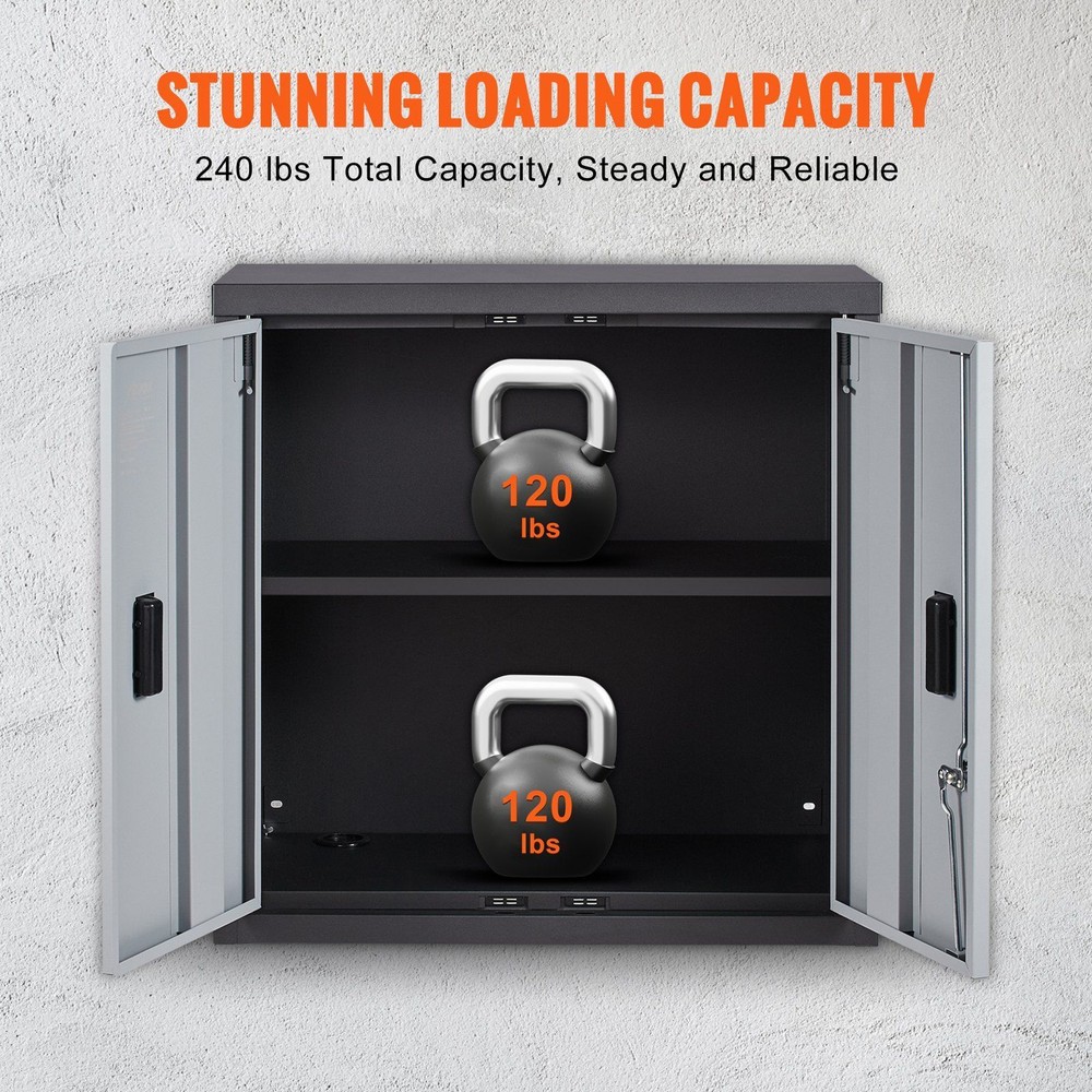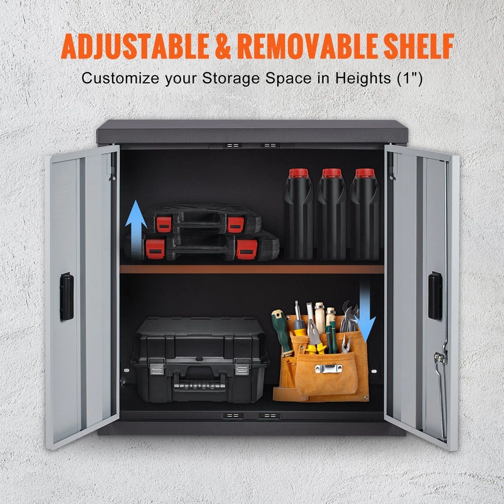 Features: Foldable Wall Cabinet: VEVOR wall cabinet is crafted for garage tool storage organization, it can be folded into 3.5 inches in width and expandable into 12 inches wide for storage. This wall mounted cabinet is very easy for installation and built upon quality material, it's made of 0.6mm thickened steel board with powder-coated surface that work against scratches and corrosion. Strong Loading Capacity: Each of the shelf supports up to 120 LBS, with a total loading capacity of 240 LBS of the wall cabinet. It's an ideal storage solution for heavy duty tools in garage, office and home. Secure Your Belongings: This metal garage cabinet features 4 magnetic suction doors, ensuring the doors stay firmly to the cabinet when closing. Apart from the magnetic system, the cabinet also comes with a reliable lock system, two keys are packed in the box for unlocking the doors. Pre-drilled Cord Holes: VEVOR cabinet comes with the power cord holes for internal power connections. It helps with the connection and cable management without further re-designing for a peace of mind. Adjustable & Removable Shelf: The shelf in this utility storage cabinet can be easily adjusted at 1-inch intervals, allowing you to customize the space according to your needs. When the cabinet is free from loading, the shelf can be removed for convenience storage.