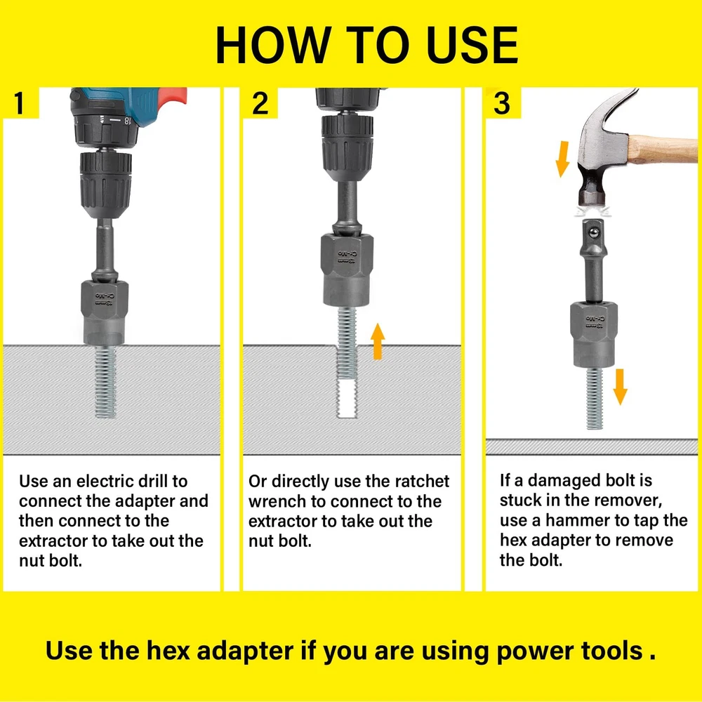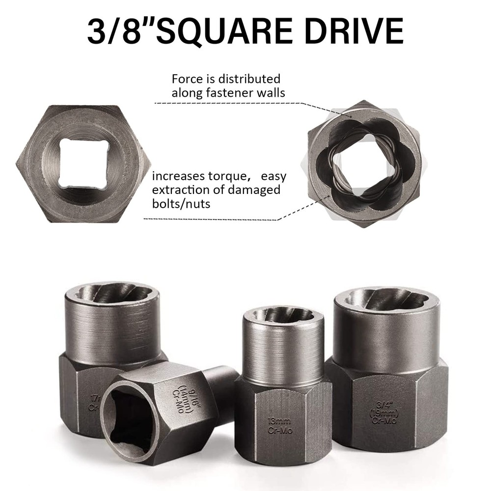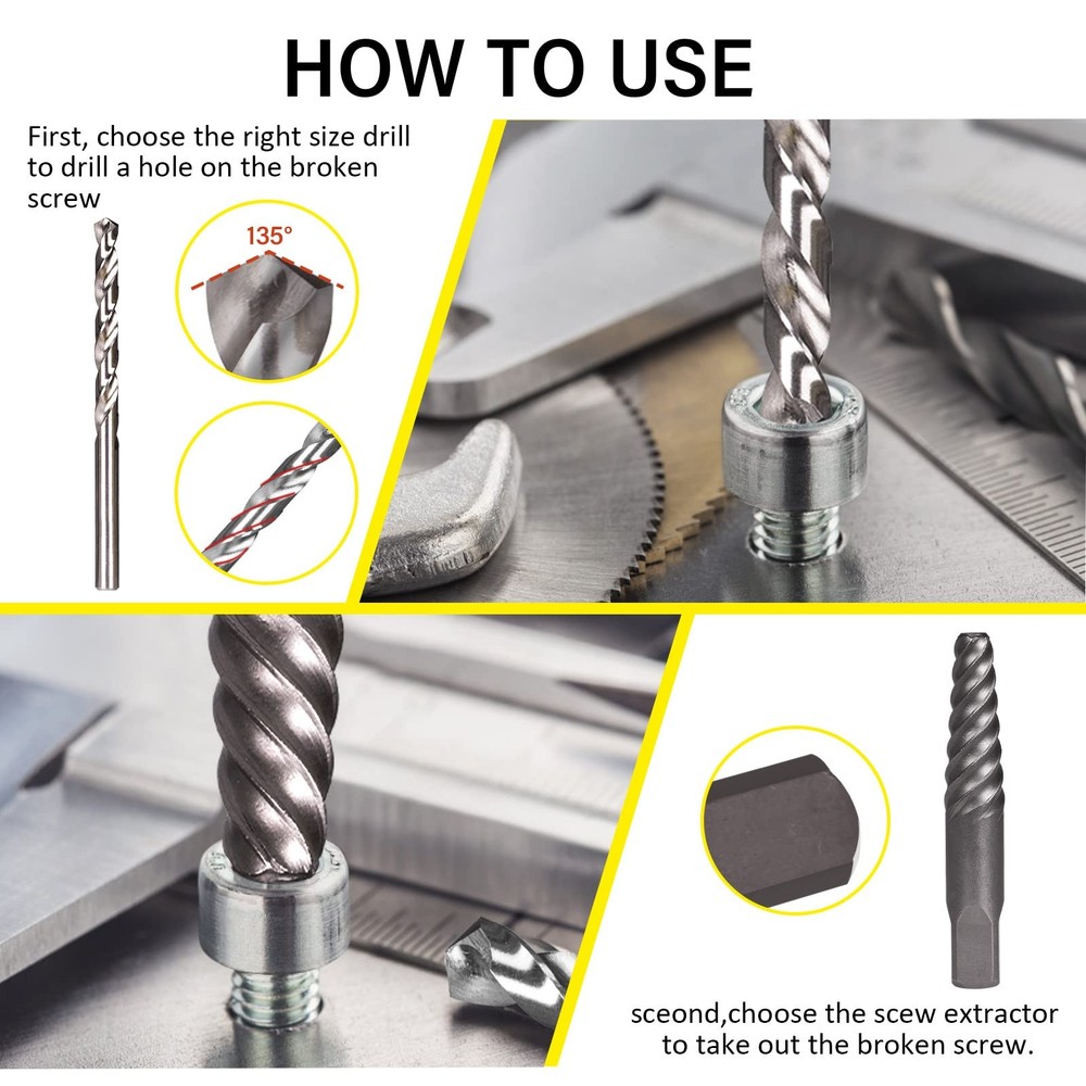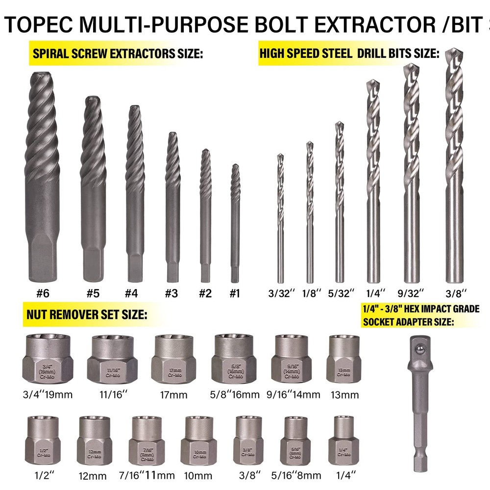Spiral Flute Screw Extractor Set for Removing Rusted and Stripped Screws, Bolts and Other Fasteners 【26-PIECE MULTIFUNCTIONAL EXTRACTORS SET】: This is a set of 3-in-1 screw & nut remover kit and drill bit kit. It contains 13pcs nut removers, 6pcs right hand high speed steel drill bits, 6pcs spiral screw extractors, 1pcs hex impact grade socket adapter. Multiple specifications and sizes to meet your various work needs. 【EXACT SIZE】: Screw remover kit parts have clear specifications printed on them, Nut Removers Size: 1/4inch, 5/16inch (8mm), 3/8 inch, 10mm, 7/16 inch (11mm), 12mm, 1/2inch, 13mm, 9/16inch (14mm), 5/8 inch (16mm), 17mm, 11/16 inch, 3/4 inch (19mm). Drill Bits Size: 3/32", 1/8", 5/32", 1/4", 9/32", 3/8". Spiral Screw Extractors Size: 1#, 2#, 3#, 4#, 5#, 6#. Included 3/8"-1/4" hex adapter. 【HIGH QUALITY】: The nut remover/spiral screw extractor are made of high hardness chrome-molybdenum steel. Reverse spiral groove design bending down to provide maximum grip force to easily remove damaged bolts, nuts, broken screws. The right hand drill is made of HHS and the head is designed with a 135° angle. which is not easily worn and has strong penetration. Surface titanium nitride coating, effective anti-corrosion and rust prevention, extending service life. 【WIDELY USED】All premium industrial grade bolt extractors are strictly designed. The grip is firm, not easy to fall off, and provides more torque. Easily remove damaged bolts, nuts and screws even if they are peeled, rusted or frozen. Suitable for power drills, flat or allen wrenches, tap adapters. 【PREMIUM SERVICE】 - If you have any problems with our products. Contact our professional after-sales service team through Amazon, the after-sales team will contact you and solve your problem in time.