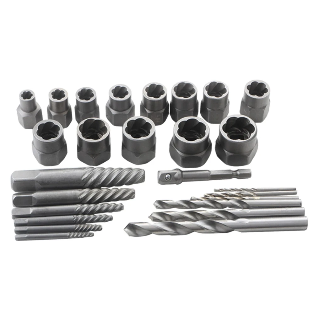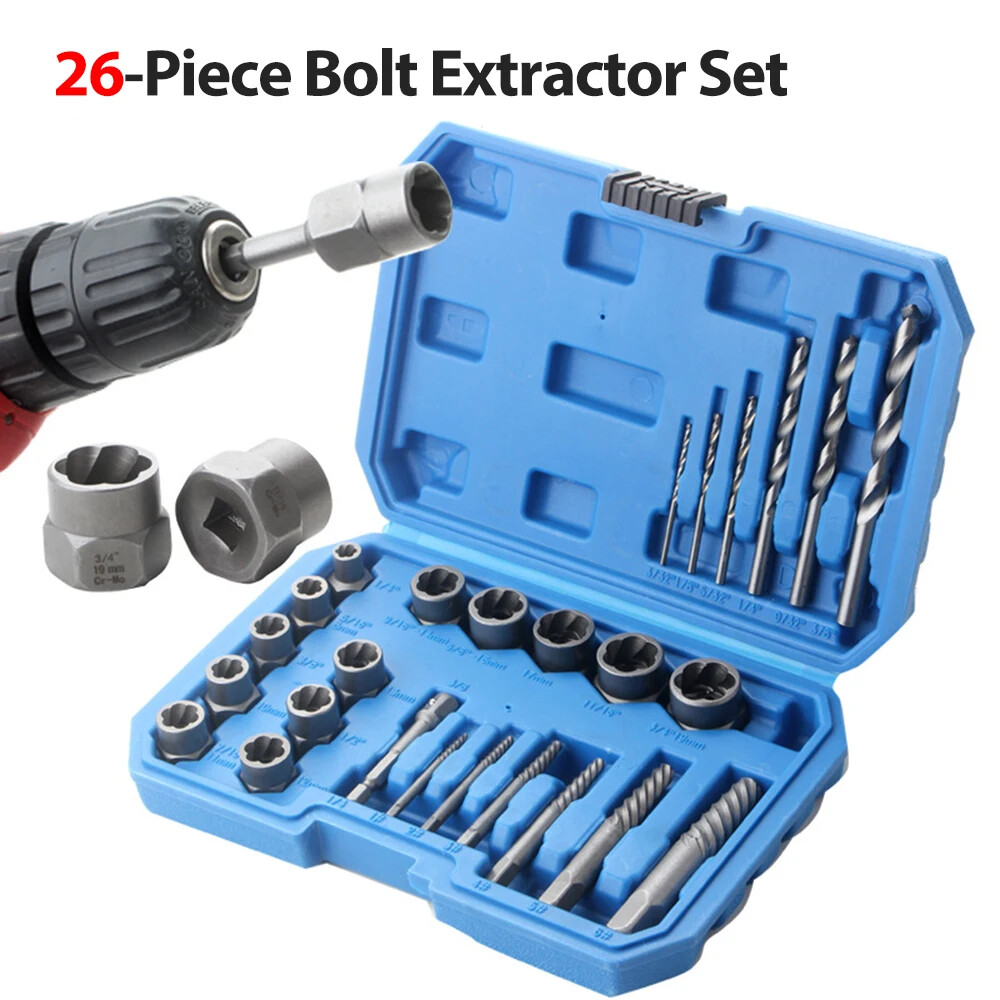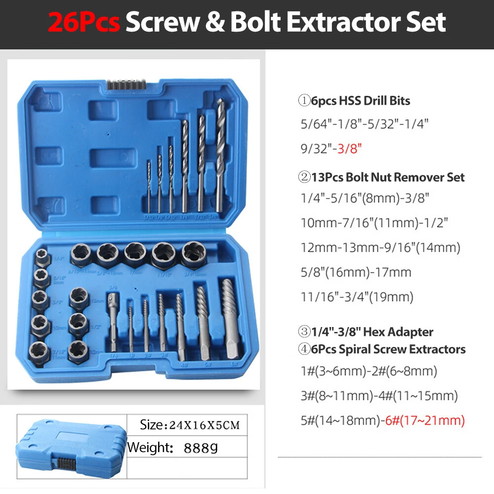 Features: 26PCS Bolt Extractor Kit: This screw & bolt remover set including: 13pcs bolt nut remover set; 6pcs HSS drill bits; 6pcs spiral screw extractors; 1PCS 1/4"-3/8" hex adapter. Multiple specifications to meet your various work needs. High Quality CR-MO & HSS: Bolt extractor is crafted from heat-treated chrome-molybdenum steel. The right drill bit set is made of high-speed steel and surface is coated with titanium nitride to prevent corrosion and rust, prolong the service life. Superior Gripping Power: All broken bolt extractors with high precision thread, reverse spiral recess design provide maximum grip. The drill bit head is designed with a 135° angle, which is not easily worn and has strong penetration. Solid Carrying Case for Storage: 26 pieces tools are all packed in a rugged, compact carry case for storage and portability. Each tool fits snugly into its respective place to prevent moving around and scraping. Multi-Application: Suitable for removing most damaged, frozen, rusted fasteners including bolts, nuts, studs and screws. Before using spiral screw extractors to remove damaged screws, a drill bit must be used to drill the holes. Specifications: Material: Steel Item Size: Nut & Bolt Extractor Size: 1/4inch, 5/16inch (8mm), 3/8 inch, 10mm, 7/16 inch (11mm), 1/2inch, 12mm, 13mm, 9/16inch (14mm), 5/8 inch (16mm), 17mm, 11/16 inch, 3/4 inch (19mm) 1/4"-3/8" Hex Adapter Spiral Flute Extractors Size: 1#(3~6mm), 2#(6~8mm), 3#(8~11mm), 4#(11~15mm), 5#(14~18mm), 6#(17~21mm) Drill Bits Size: 5/64", 1/8", 5/32", 1/4", 9/32", 3/8" Package Weight: 888g / 1.95lb Package Size: 24 * 16 * 5cm / 9.45 * 6.29 * 1.97in Package List: 13 * Nut Remover Set 6 * Drill Bits 6 * Spiral Screw Extractors 1 * 1/4"-3/8" Hex Adapter 1 * Storage Case