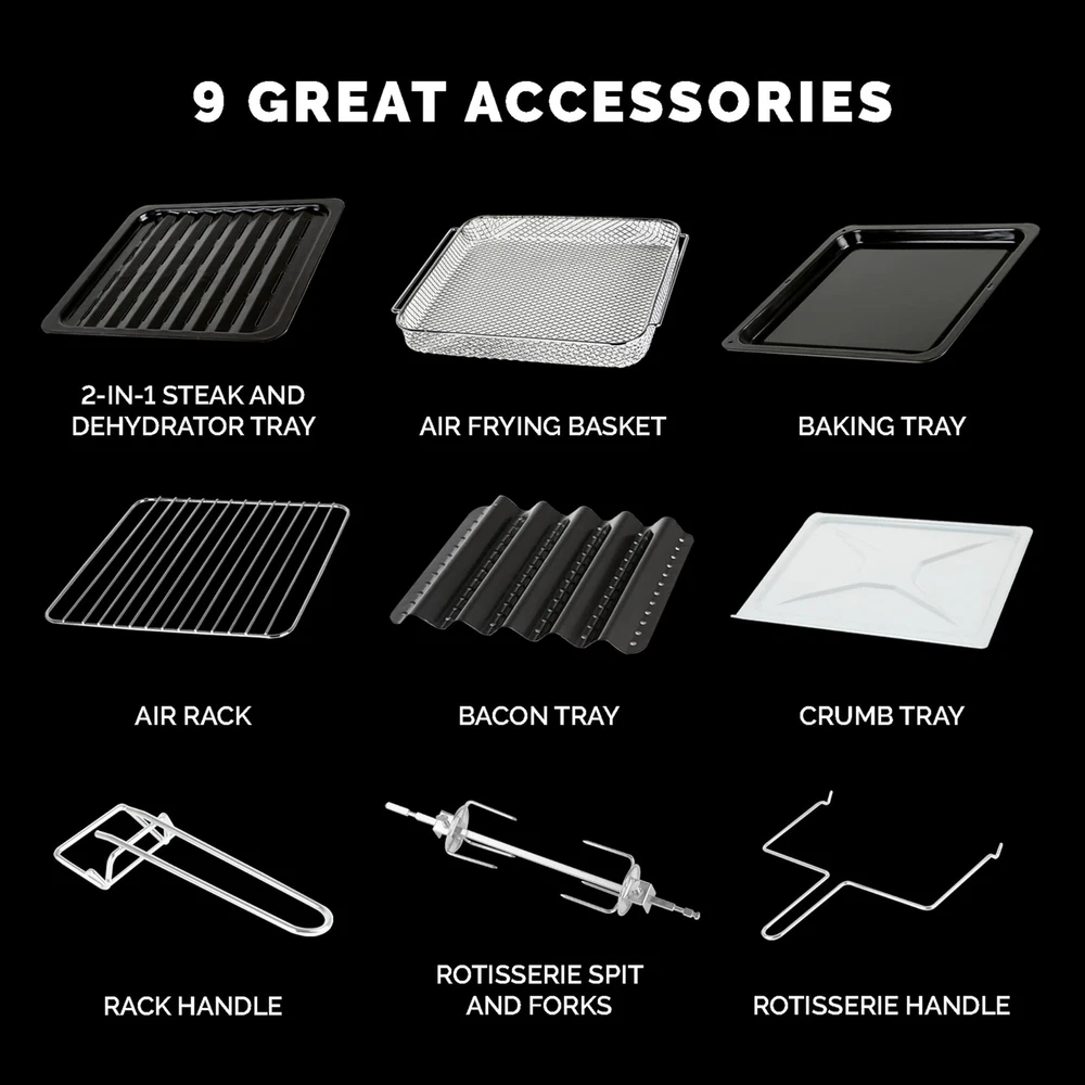 COOK MEALS FASTER WHILE SAVING ENERGY — Experience ultra-fast cooking performance and prepare full meals in just a fraction of the time! New Powerful Turbo MAXX Technology cooks French fries up to 22% faster, steak up to 37% faster, and chicken up to 27% faster, and saves consumers over 77% in energy than traditional ovens ONE APPLIANCE TO REPLACE THE REST — This 10-in-1 meal-making powerhouse can air fry, bake, toast, roast, rotisserie, braise, sear, dehydrate, broil, and warm meals at the touch of a button — giving you everything you need in a single appliance CHOOSE FROM 21 SMART PRESETS — Ready-to-cook meals, at the touch of a button. The intuitive digital interface offers 21 presets for a wide variety of menu options, delivering flawless results every time for deliciously crispy French fries, onion rings, chicken wings, shrimp, steak, wings, vegetables, and much more PREPARE FAMILY-SIZED MEALS — Great for families and multi-person households, the MAXX features an extra-large 26-quart capacity and multiple rack levels which let you cook several different foods at a time, and prepare large, family-sized meals. The MAXX can fit a 14-pound turkey, 12-inch pizza, or up to 9 slices of toast in its cavity. Oven is 17.2 lbs ENJOY 9 DO-IT-ALL ACCESSORIES — MAXX-IMIZE your cooking possibilities! A versatile collection of accessories includes an air frying basket, baking tray, air rack, crumb tray, bacon tray, steak tray, rotisserie spit & forks, rack handle, and rotisserie handle. Plus, a bonus cookbook featuring a diverse assortment of easy-to-follow, chef-inspired recipes