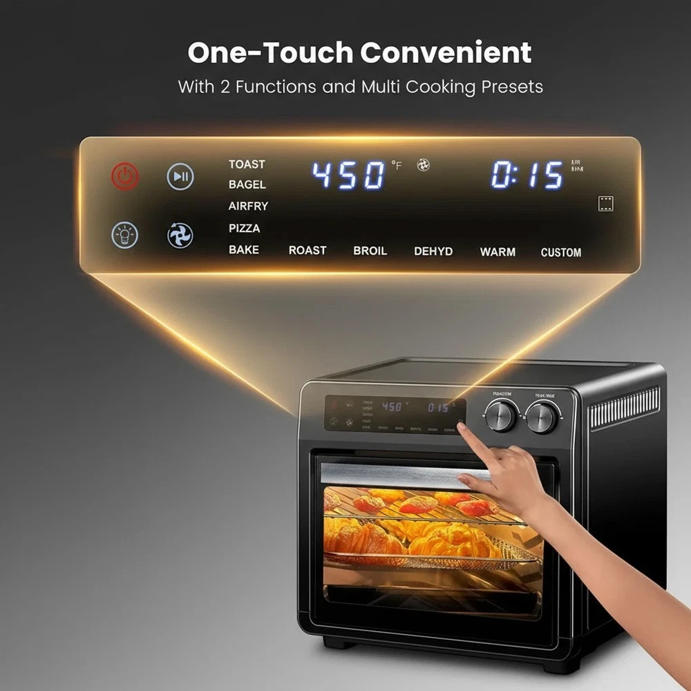 26QT 1800W digital air fryer oven with touchscreen and viewing window. The large-capacity 10-in-1 appliance allows you to air fry, bake, toast, roast, broil, dehydrate, and more. The Smart HD control panel offers precise temperature control (up to 450°F) and a timer from 0 to 6 hours for perfect results. 360° hot air circulation cooks evenly with 85% less oil. The built-in light and transparent window allow you to easily monitor your food. Includes 4 accessories: air fryer basket, baking tray, rack, and crumb tray. ETL certified, safe, and energy efficient. Perfect for family use.
