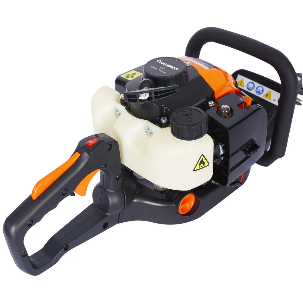 26cc 2 Cycle Gas Powered Hedge Trimmer with Double Sided Blade 24" low noise Features: Smart start,doulbe sided hedge trimmer equiped powerful ,easy start 2 cycle 26cc EPA passed engine Easy use,This double-sided hedge trimmer ,Dual-sided serrated blades cut swaths up to 24" wide and limbs up to 1' diameter LIght weight design,only 14lbs for the whole machine,low vibration for maximum user comfort; Low weight, ergonomic design Low noise ,enable longer working hours and the possibility to work in noise sensitive and restricted areas; Ideal for cutting medium to larger sized yards and trimming hedges Power: 0.7kw / 7500RPM. Fuel Tank Capacity: 0.65L. Start Type: Recoil Shears Type: Double Sided Blade. # of Teeth: 33. Trimmer Width: 24". Overall. Dimension: 43.3"(L) x 8.7"(W) x11"(H). Product Dimensions: Assembled Length (in.) 43.30 Assembled Width (in.) 8.70 Assembled Height (in.) 11.00 Weight (lbs) 14.00 Package Size: Length (in.) 43.70 Width (in.) 10.20 Height (in.) 10.20 Weight (lbs) 16.60