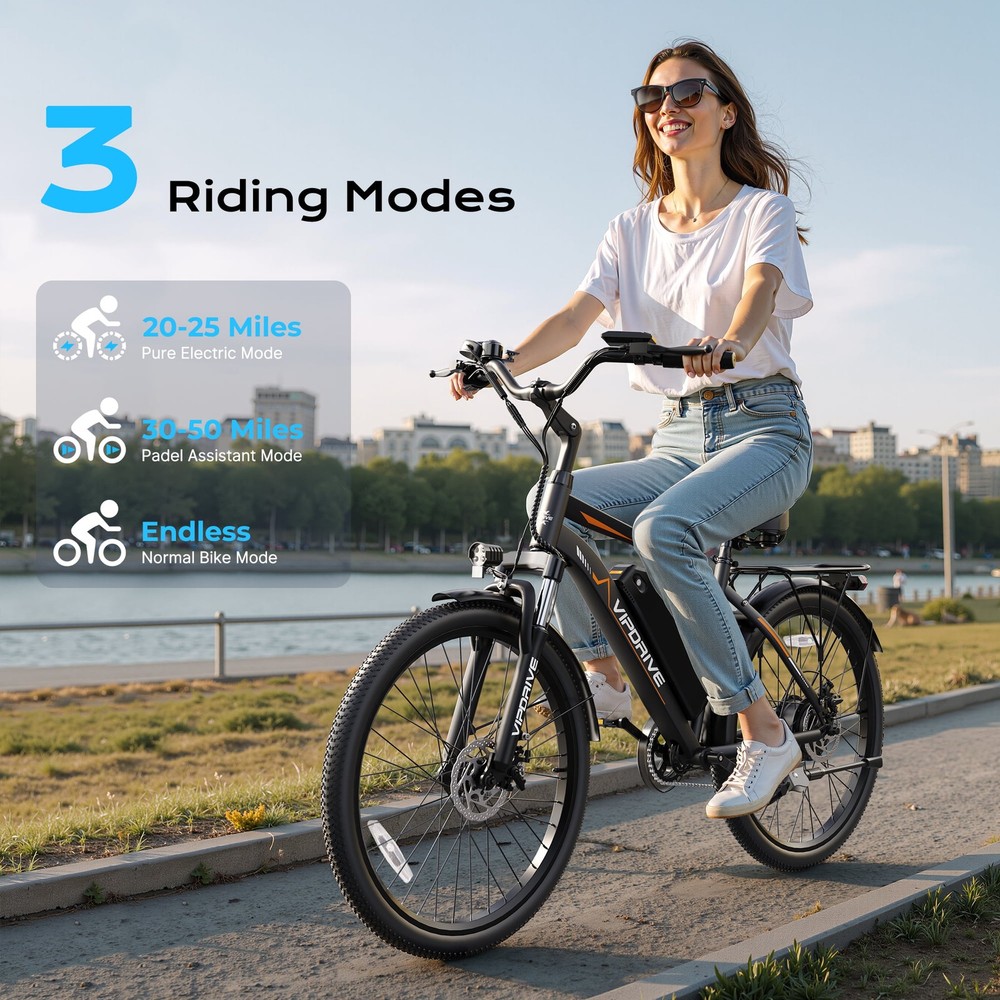 ๐๐จ๐ฐ๐๐ซ ๐๐๐๐ญ๐ฌ ๐๐ซ๐๐๐ง ๐๐ ๐ข๐ฅ๐ข๐ญ๐ฒ: Conquer city streets with VIPDRIVE Urbanite 1.2. Its robust 750W peak rear-drive hub motor propels you to 22 MPH, effortlessly handling hills and traffic. Choose your rhythm: throttle-only freedom, seamless pedal-assist, or classic cycling. Navigate commutes, errands, and urban adventures with commanding power. ๐๐ง๐๐๐๐ญ๐๐๐ฅ๐ ๐๐๐ง๐ ๐, ๐๐ง๐ซ๐ข๐ฏ๐๐ฅ๐๐ ๐๐จ๐ง๐ฏ๐๐ง๐ข๐๐ง๐๐: Go farther, do more. The 48V 7.8Ah (374.4Wh) battery delivers an impressive 50+ miles on a single charge in pedal-assist mode*, perfect for extensive commutes or multi-stop errands. Recharge in just hours at home or work. Spend less time plugged in and more time exploring your city. ๐๐ฆ๐๐ซ๐ญ ๐๐ข๐๐ข๐ง๐ , ๐๐ง๐๐ฅ๐๐ฌ๐ฌ ๐๐จ๐ฆ๐๐จ๐ซ๐ญ: VIPDRIVE prioritizes a smooth, intuitive experience. Enjoy a comfortable upright posture on the 26" city frame, aided by a plush saddle and intuitive controls. Dual-disc brakes provide confident stopping power in all conditions. Plus, your journey starts equipped โ includes essential accessories (lock, phone mount, pump) for immediate adventure. ๐๐ฎ๐ข๐ฅ๐ญ ๐๐จ๐ฎ๐ ๐ก, ๐๐ข๐๐ ๐๐ข๐ญ๐ก ๐๐จ๐ง๐๐ข๐๐๐ง๐๐: Engineered for the urban landscape, the Urbanite 1.2 features a durable frame built to withstand daily commutes. Integrated safety features (bright lighting & reflectors) ensure visibility day and night. The reliable rear hub motor offers a balanced, stable ride quality. ๐๐จ๐ฎ๐ซ ๐๐๐ฑ๐ญ ๐๐๐ฏ๐๐ง๐ญ๐ฎ๐ซ๐ ๐๐ญ๐๐ซ๐ญ๐ฌ ๐๐จ๐ฐ: The VIPDRIVE Urbanite 1.2 is more than an e-bike; it's your key to efficient, enjoyable, and empowered city living. Perfect for commuters, explorers, and anyone ready to redefine their ride. Arrives 90% pre-assembled for quick setup. Ride with assurance. Note: Our products have been certified under UL2849 safety standards. The item is UL 2849 certified with a link to the UL Product iQ