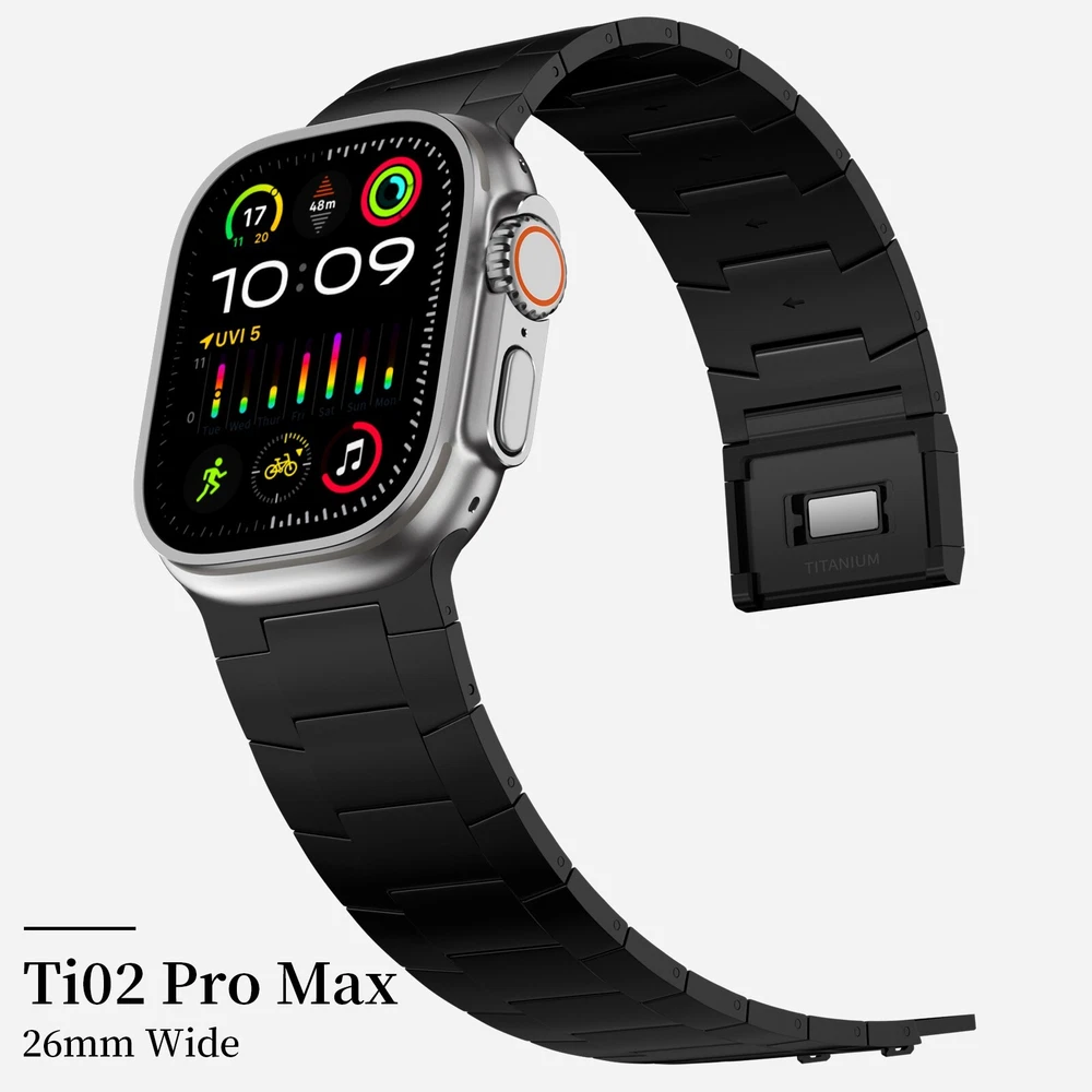 Specification Color Black Special Features Full titanium;DLC Coating Compatibility For Apple Watch Ultra 49mm / Series 10 46mm / Series 9 8 7 45mm / Series 6 5 4 SE2 SE 44mm Clasp Titanium Magnetic Clasp Connector Titanium Connector Titanium Grade Titanium Grade 2 Herring 800+HV Band Width 26mm Band Weight 66g(max) Band Thickness 2.8mm Band Length 210mm Clasp Thickness 5.5mm Wrist Size 170mm to 234mm Feature Lightweight;Corrosion-Resistant;Anti-Allergy Included Components Titanium watch band Warn tips: If you have specific requirements on packaging and components such as minor adjustment links、removal tool、tool pins and instruction, please contact online customer service. Product Description Full Titanium Band VS Titanium Band: All components include links, magnetic clasp, and connectors are crafted from Grade2 titanium, setting our bands apart from others with stainless steel clasps and connectors 26MM Wider Design: The wider watch band best fits the Ultra. Design for any bold soul. Compatible with Apple Watch Ultra 49mm / Ultra 2 49mm / Series 10 46mm / Series 9 8 7 45mm / Series 6 SE 5 4 44mm. Fit wrist size 6.7" to 9.2"(170 to 234mm). We provide a minor adjustment link to adjust the band to fit for your wrist accurately Lightweight and Corrosion-Resistant: 66g(max). Experience the extraordinary benefits of full titanium - our titanium bands are not only lighter but also more corrosion-resistant than non-full titanium alternatives. Dive into the ocean or pool without worry, as our bands are built to withstand various environments Titanium Connectors: CNC high precision craftsmanship and unique titanium connectors ensure a tight and stable connection with your original watch interface. Make sure your watch band stays securely attached, providing a seamless and comfortable fit Titanium Magnetic Buckle & Hook and Loop Closure: Sensitive skin? No problem. Our titanium magnetic buckle is an excellent choice, offering comfort without compromising style. Say goodbye to allergies associated with non-full titanium watch bands. Ensuring your watch band is comfortable to wear all day long. Magnetic buckle & hook and loop closure lock your watch easily and securely DLC (Diamond-Like Carbon): Our aerospace-grade titanium bands are not only a perfect match in material and color for the original watch, but also The DLC coating gives it extra scratch prevention, durability and protection, far higher wear resistance than non DLC