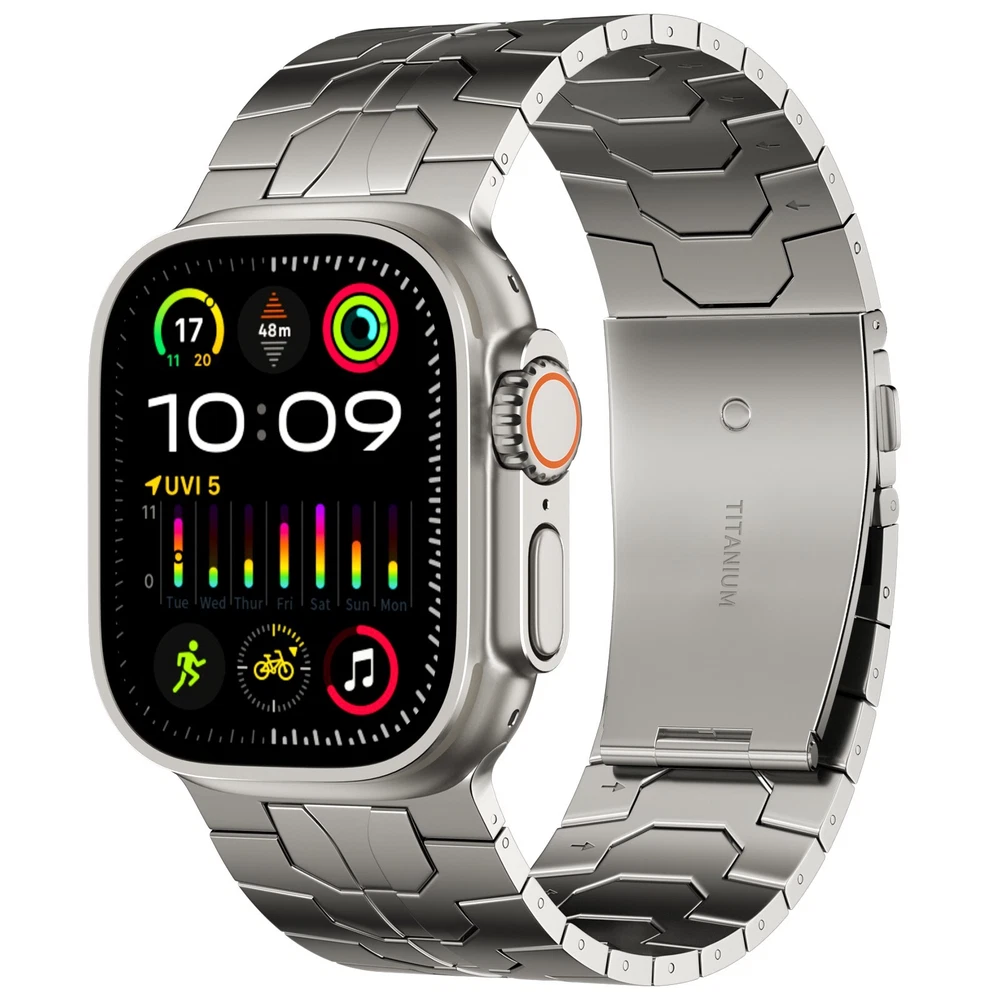 Specification Color TItanium Special Features Full titanium;DLC Coating Compatibility For Apple Watch Ultra 49mm / Series 10 46mm / Series 9 8 7 45mm / Series 6 5 4 SE2 SE 44mm Clasp Titanium Folding Clasp Connector Titanium Connector Titanium Grade Titanium Grade 2 Herring 800+HV Band Width 26mm Band Weight 64g(max) Band Thickness 2.7mm Band Length Clasp Thickness 5.6mm Wrist Size 170mm to 234mm Feature Lightweight;Corrosion-Resistant;Anti-Allergy Included Components Titanium watch band Warn tips: If you have specific requirements on packaging and components such as minor adjustment links、removal tool、tool pins and instruction, please contact online customer service. Product Description Full Titanium Band: All components include links, folding clasp, and connectors are crafted from Grade2 titanium, setting our bands apart from others with clasps and connectors made of non-titanium material 26MM Wider Design: The wider watch band best fits the Ultra. Design for any bold soul. Compatible with Apple Watch Ultra 49mm / Ultra 2 49mm / Series 10 46mm / Series 9 8 7 45mm / Series 6 SE 5 4 44mm. Fit wrist size 6.7" to 9.2"(170 to 234mm). We provide a minor adjustment link to adjust the band to fit for your wrist accurately Lightweight and Corrosion-Resistant: 64g(max). Experience the extraordinary benefits of full titanium - our titanium bands are not only lighter but also more corrosion-resistant than non-full titanium alternatives. Dive into the ocean or pool without worry, as our bands are built to withstand various environments Titanium Connectors: CNC high precision craftsmanship and unique titanium connectors ensure a tight and stable connection with your original watch interface. Make sure your watch band stays securely attached, providing a seamless and comfortable fit Titanium Folding Buckle: Sensitive skin? No problem. Our titanium folding buckle is an excellent choice, offering comfort without compromising style. Say goodbye to allergies associated with non-full titanium watch bands. Ensuring your watch band is comfortable to wear all day long DLC (Diamond-Like Carbon): Our aerospace-grade titanium bands are not only a perfect match in material and color for the original watch, but also The DLC (Diamond Like Carbon) coating gives it extra scratch prevention, durability and protection, far higher wear resistance than non DLC